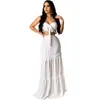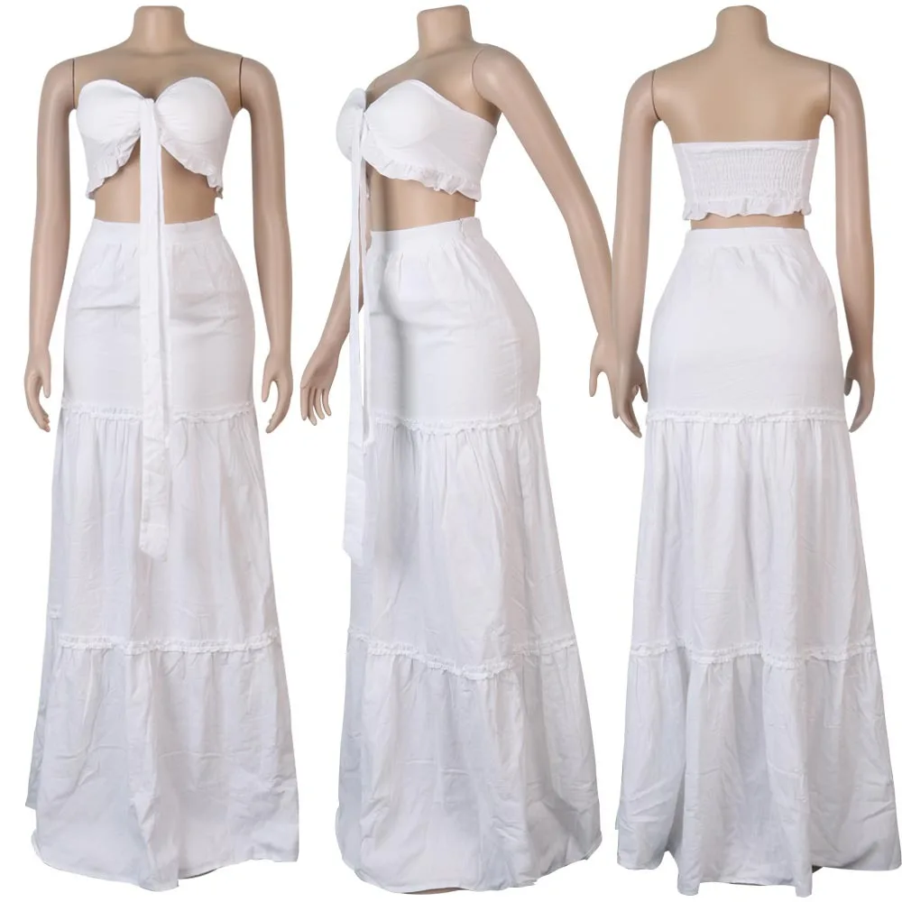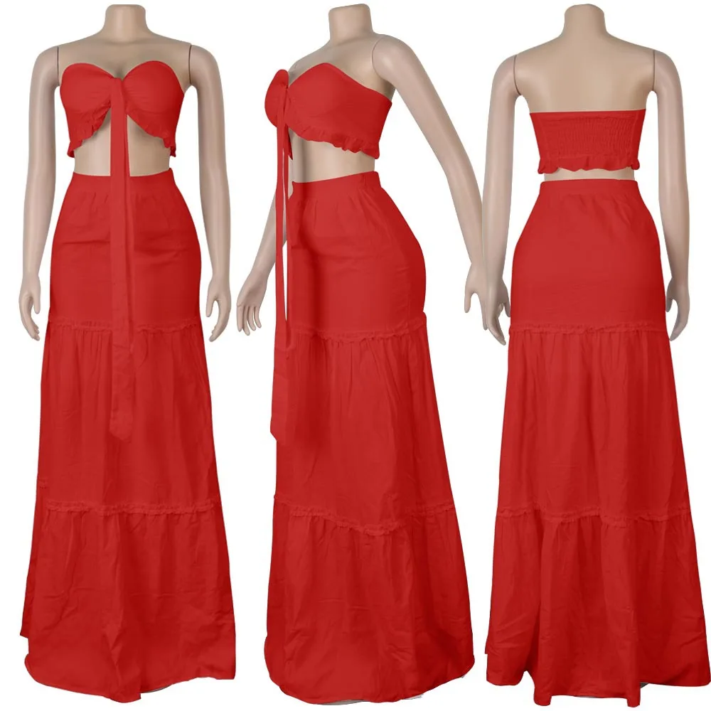 CM.YAYA Women Solid Beach Bohemian Maxi dress Bow Strapless Crop Top Cascanding Ruffles Long Skirt Suit Two Piece Set Tracksuit