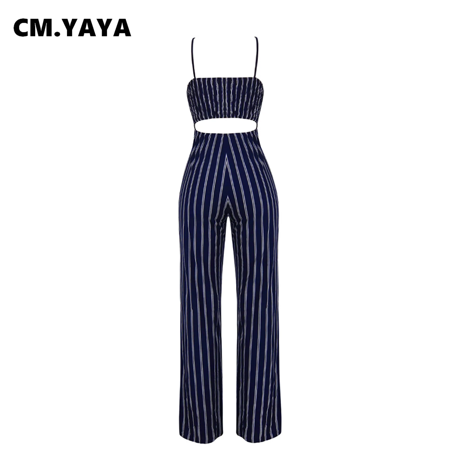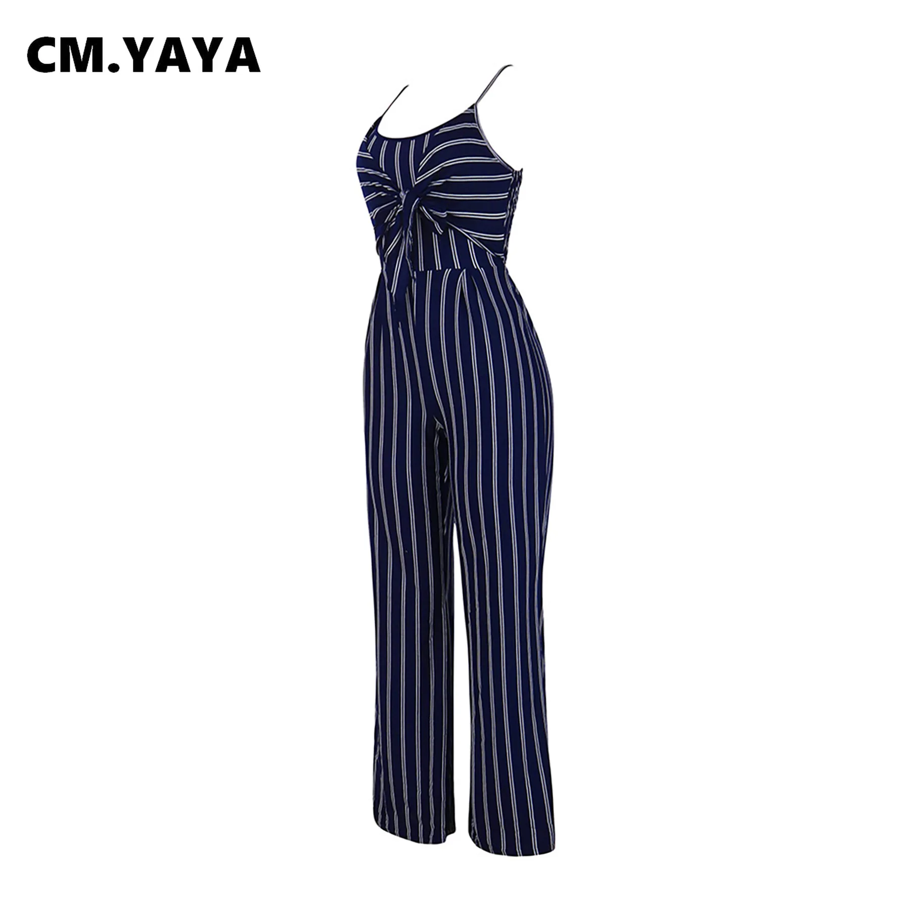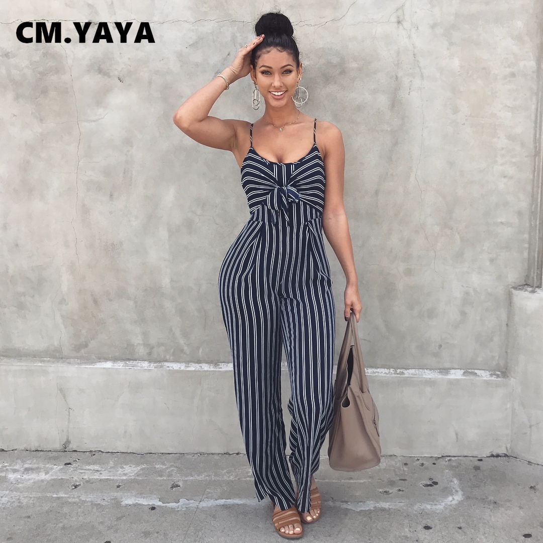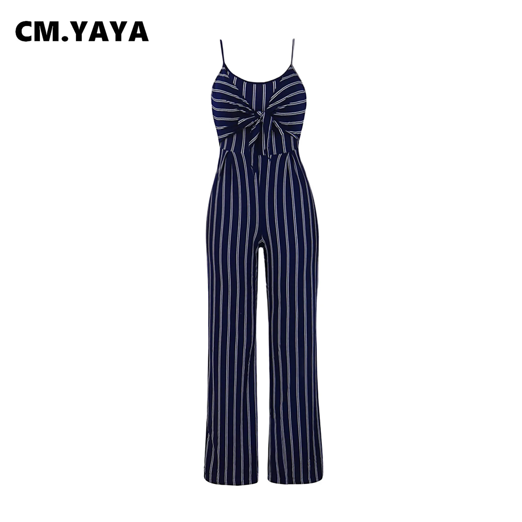 CM.YAYA Women Spaghetti Strap Bow Splicing Sleeveless Striped Wide Leg Jumpsuit 2022 Summer One Piece Overall Jumpsuit Playsuit