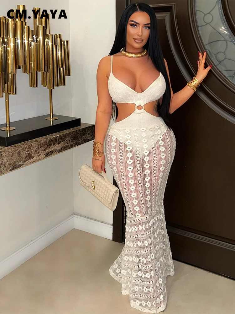 CM.YAYA Women Spaghetti Strap V-neck Cutout Waist Lace Embroidery Mermaid Long Maxi Dress 2025 Beach Sexy Party Dresses Vestidos