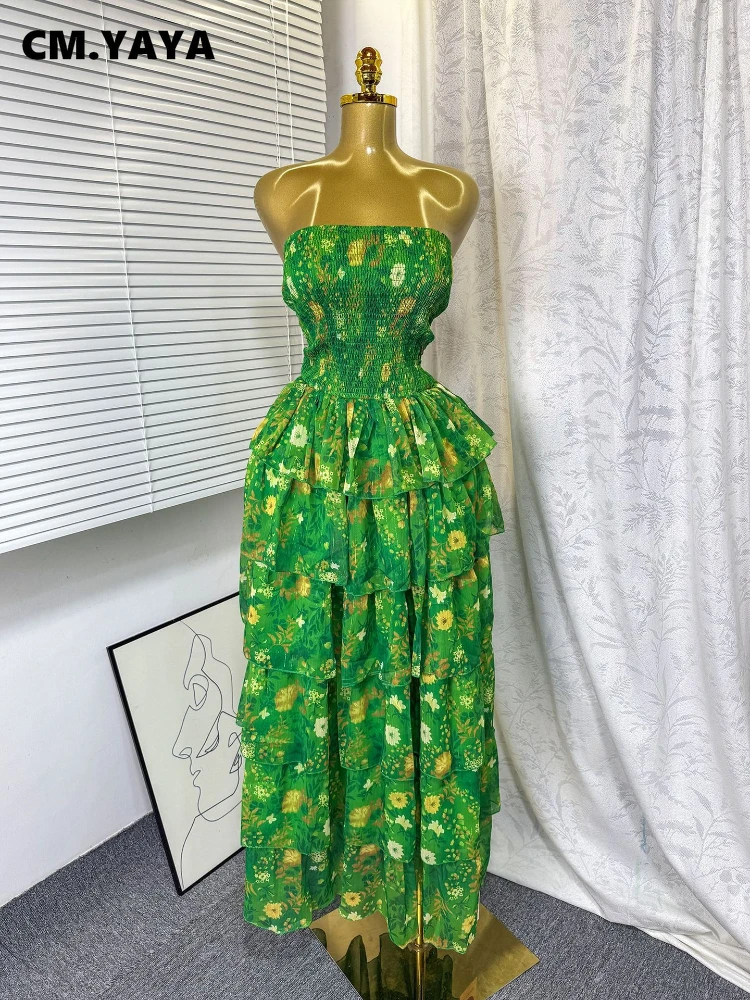 CM.YAYA Women strapless floral printed ruffles tierred ball gown smock Maxi Long Dress 2025 Birthday Vacation Sexy Party Dresses