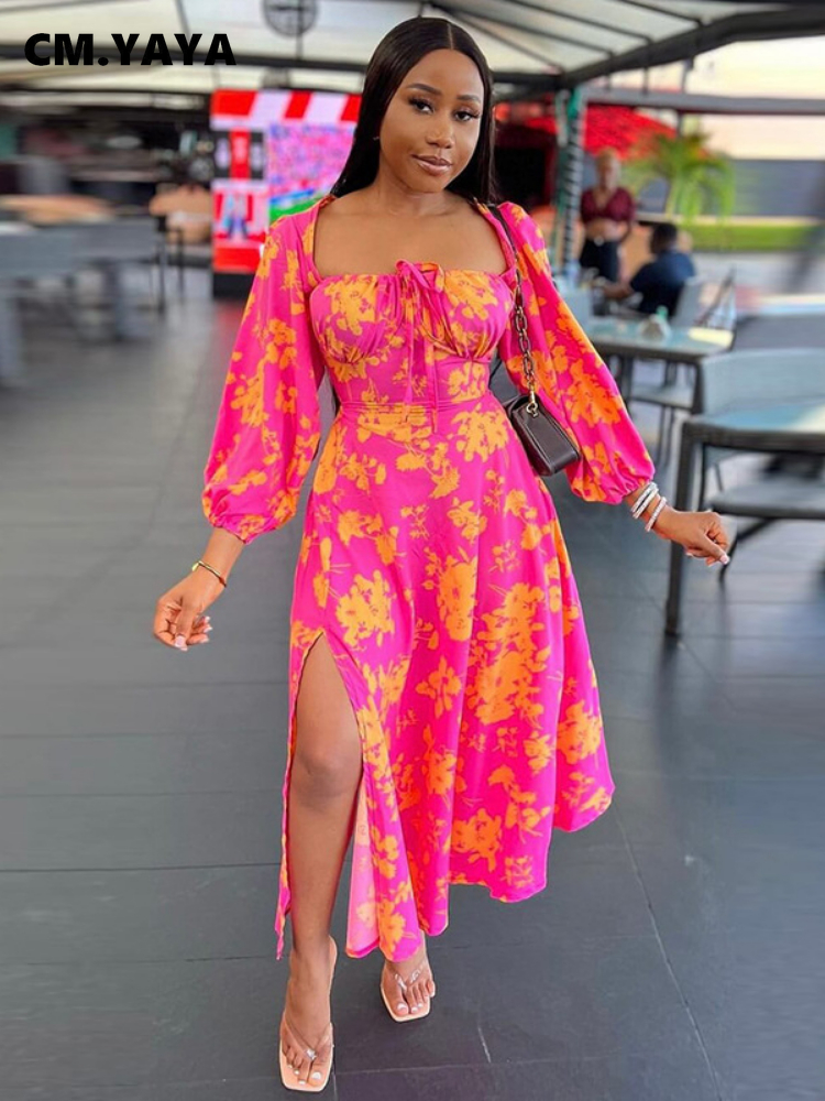 CM.YAYA Women Strapless High Waist Full Sleeve Long Maxi Dress Summer Floral Printed Cute Girl Night Club Party Vestido Dresses