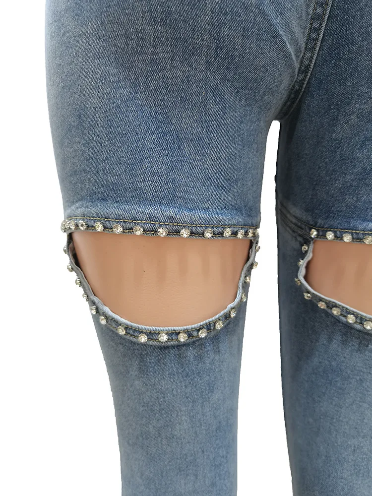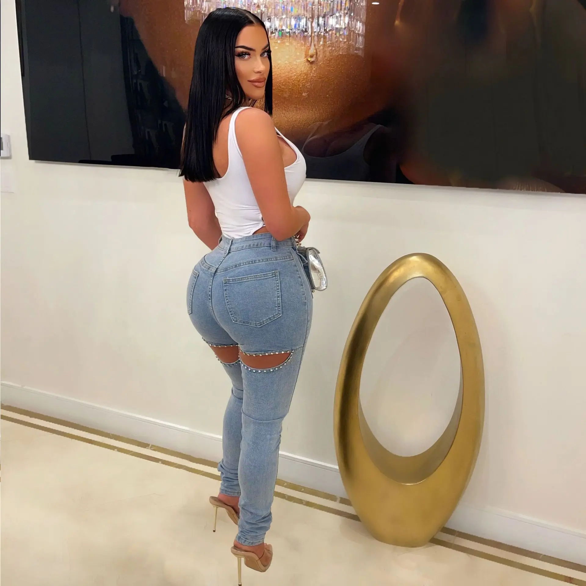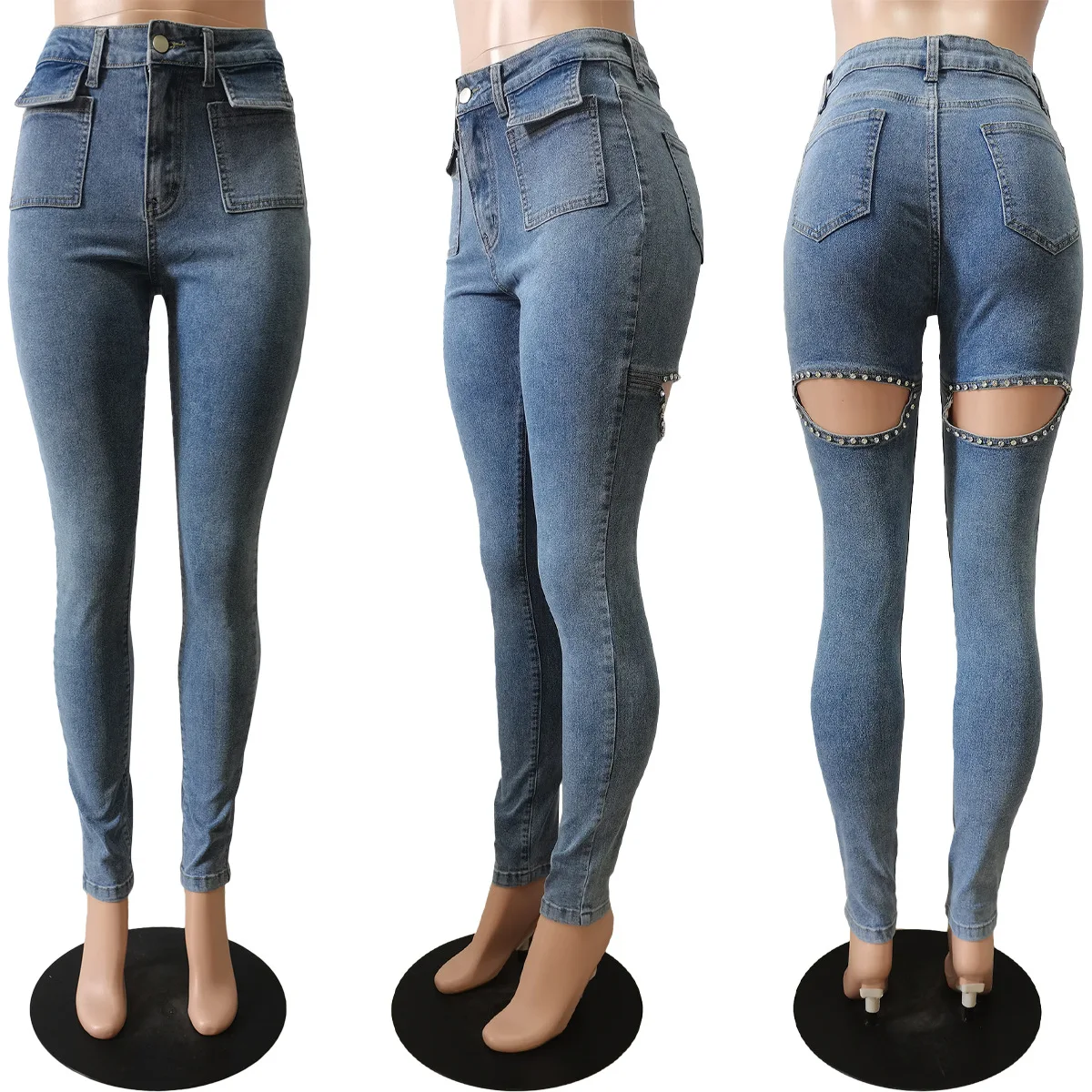 CM.YAYA Women Streetwear Cutout Back Dimonds Splicing Pencil Denim Pants 2023 Summer Pocket Front High Waist Sexy Jeans Trousers