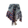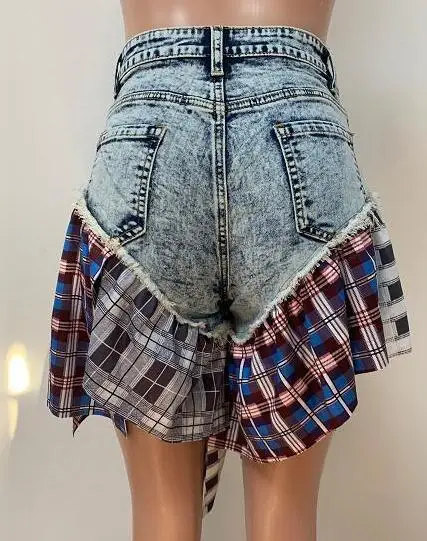 CM.YAYA Women Streetwear High Waist Zipper Fly Plaid Irregular Patchwork Flare Denim Shorts 2023 INS Fashion Short Jeans Trouser