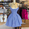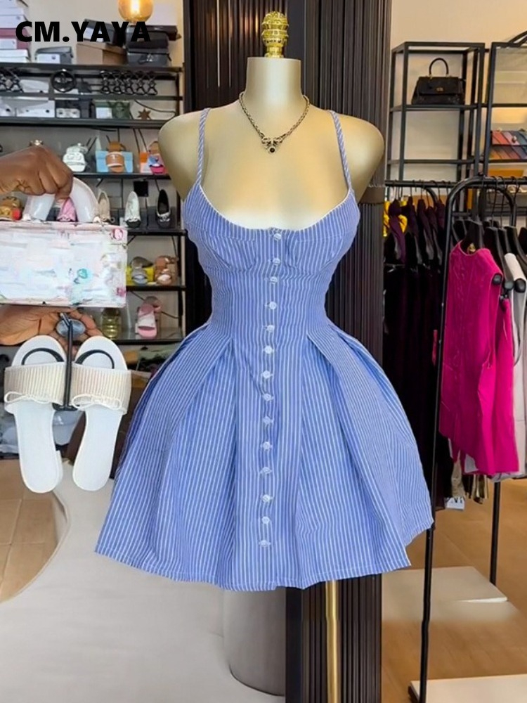 CM.YAYA Women Striped Print Strap Single-breasted Backless Mini Dress 2025 Summer Beach Birthday Sexy Club Party A-Line Dresses