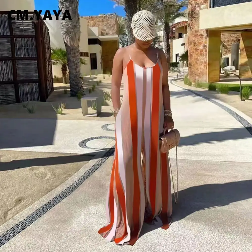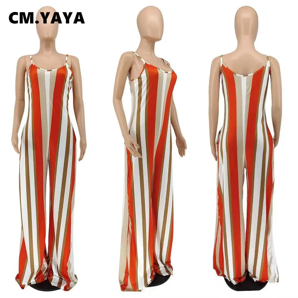 CM.YAYA Women Striped Sleeveless Spaghetti Strap Loose Wide Leg Jumpsuit for 2022 Summer Elegant Streetwear Straight Playsuit
