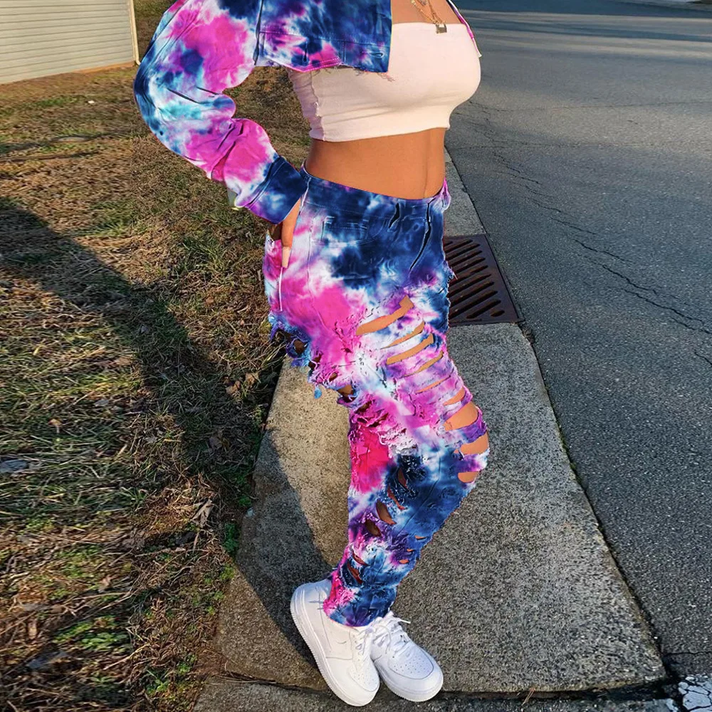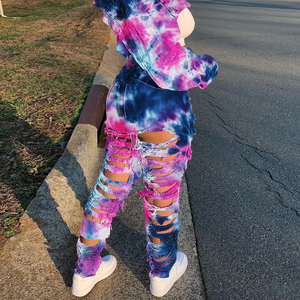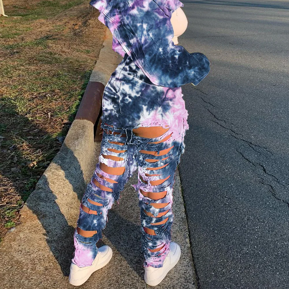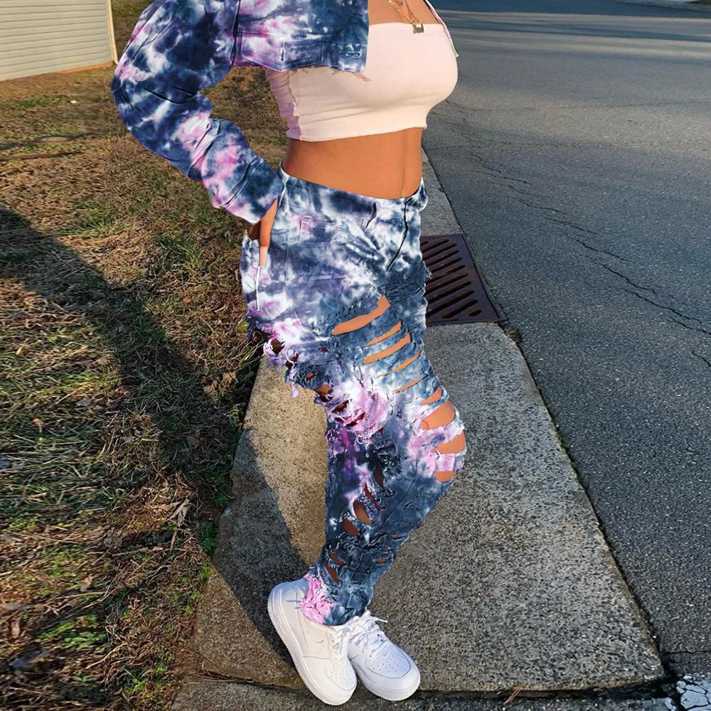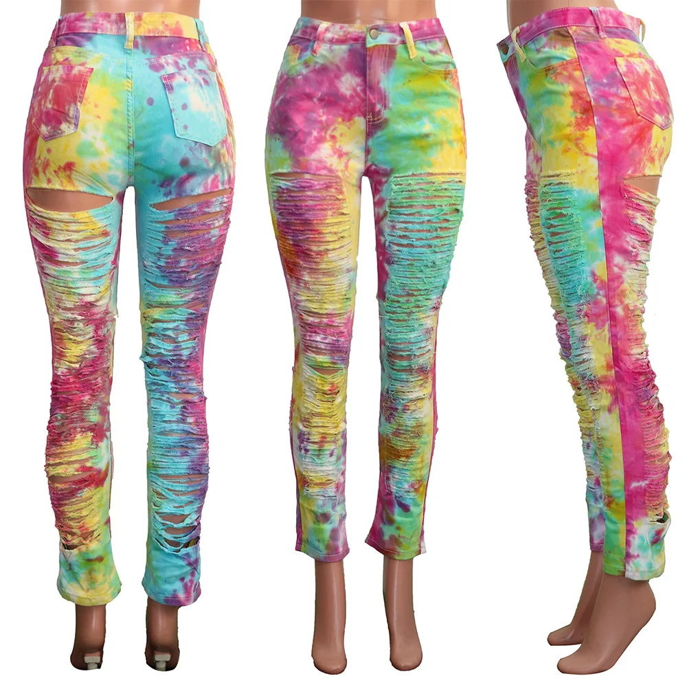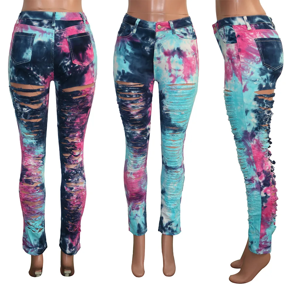 CM.YAYA Women Tie Dye Print Hole Pencil Ripped Jeans Streetwear Hollow Out Denim Pants (Only Pants)