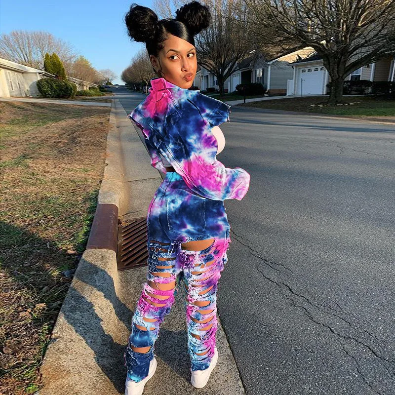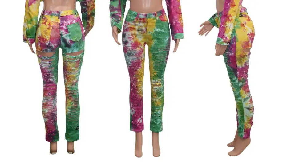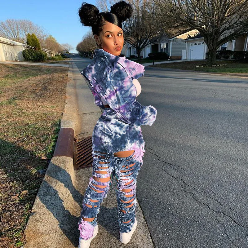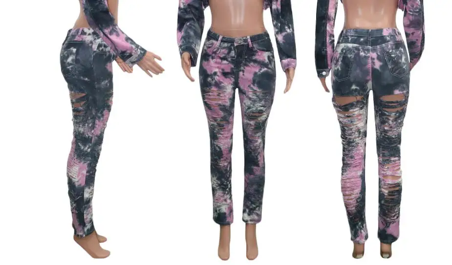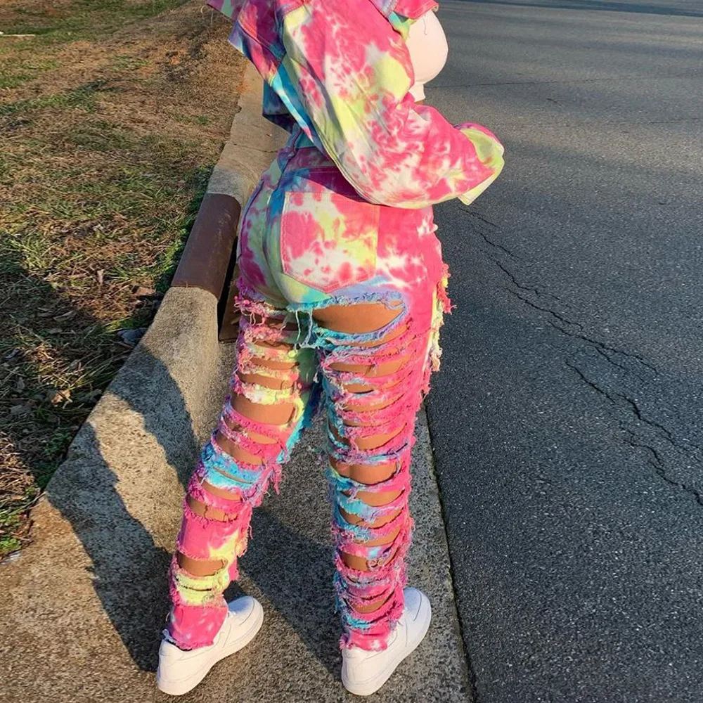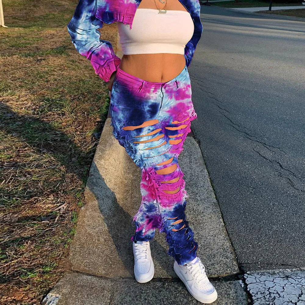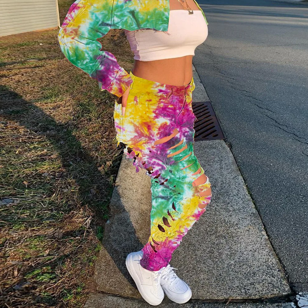 CM.YAYA Women Tie Dye Print Hole Pencil Ripped Jeans Streetwear Hollow Out Denim Pants (Only Pants)
