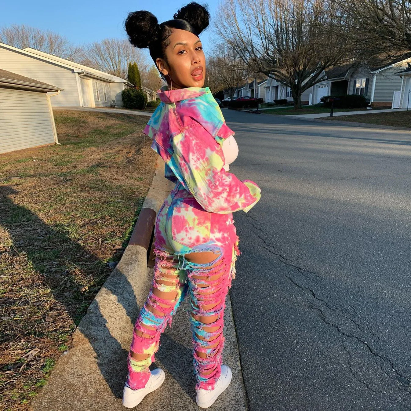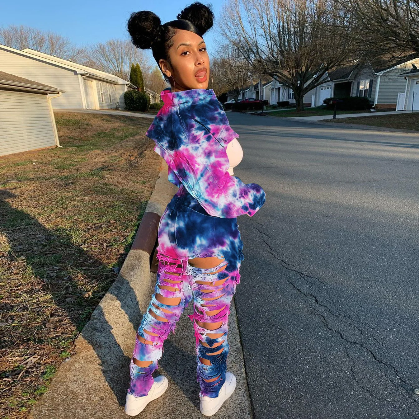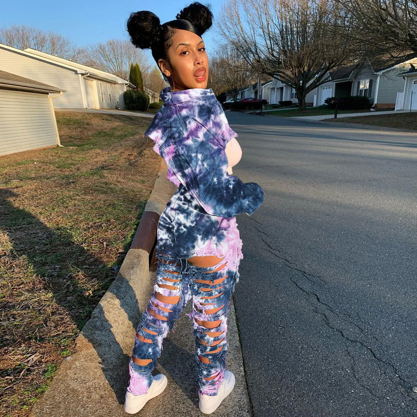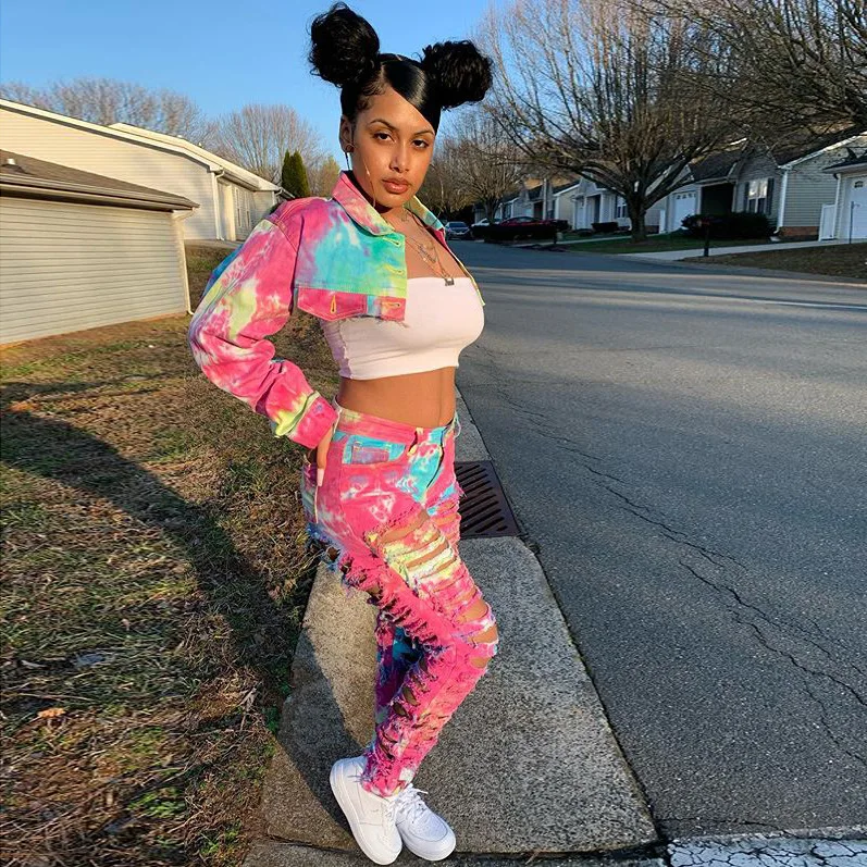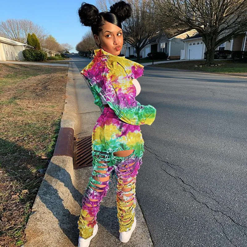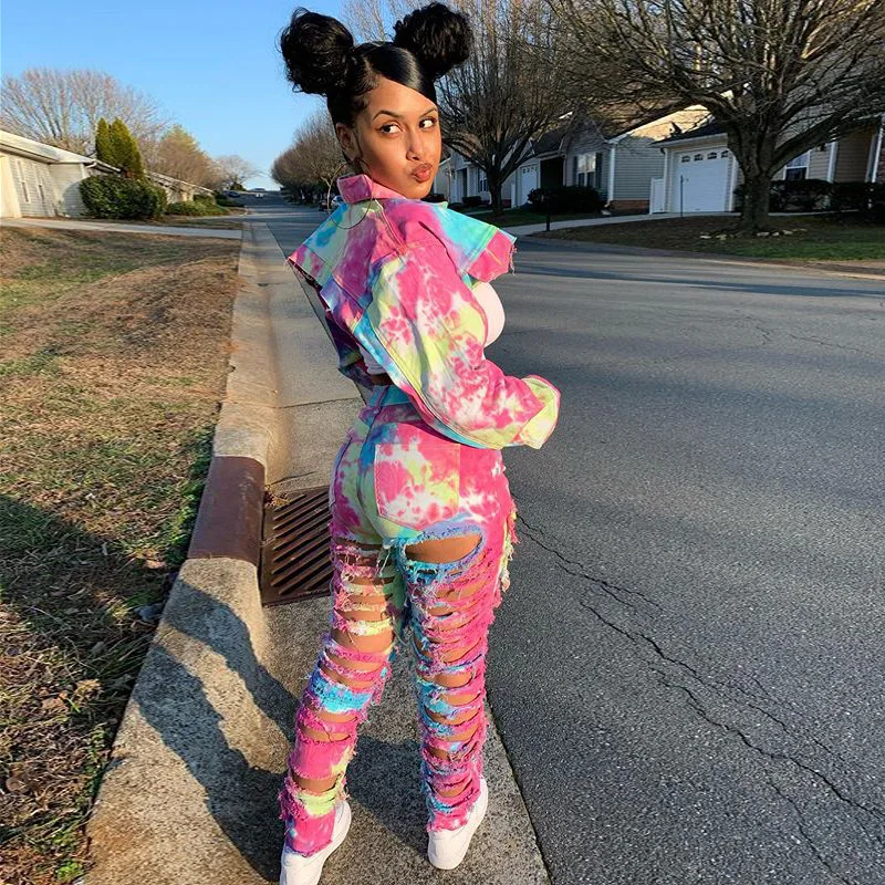CM.YAYA Women Tie Dye Print Hole Pencil Ripped Jeans Streetwear Hollow Out Denim Pants (Only Pants)