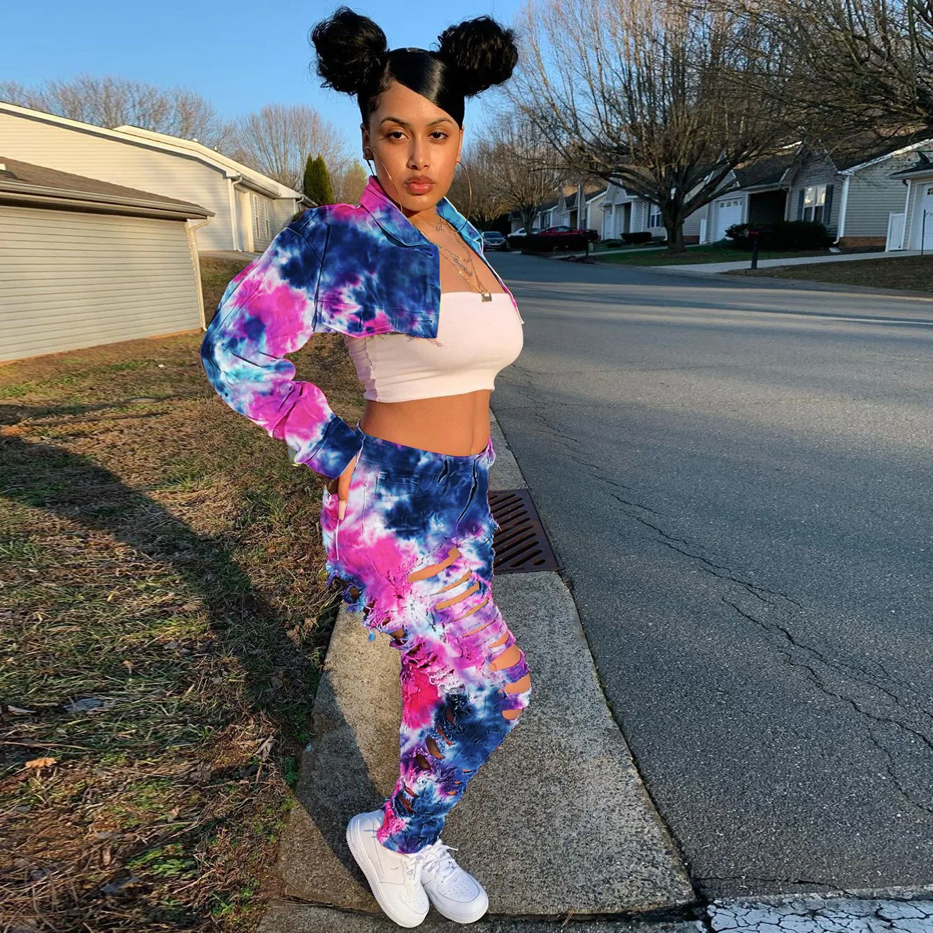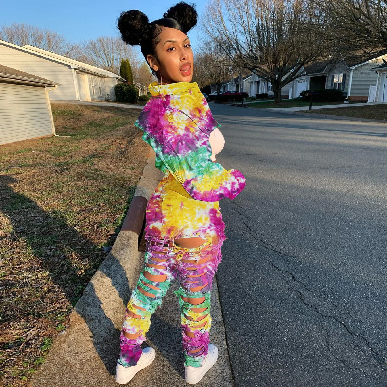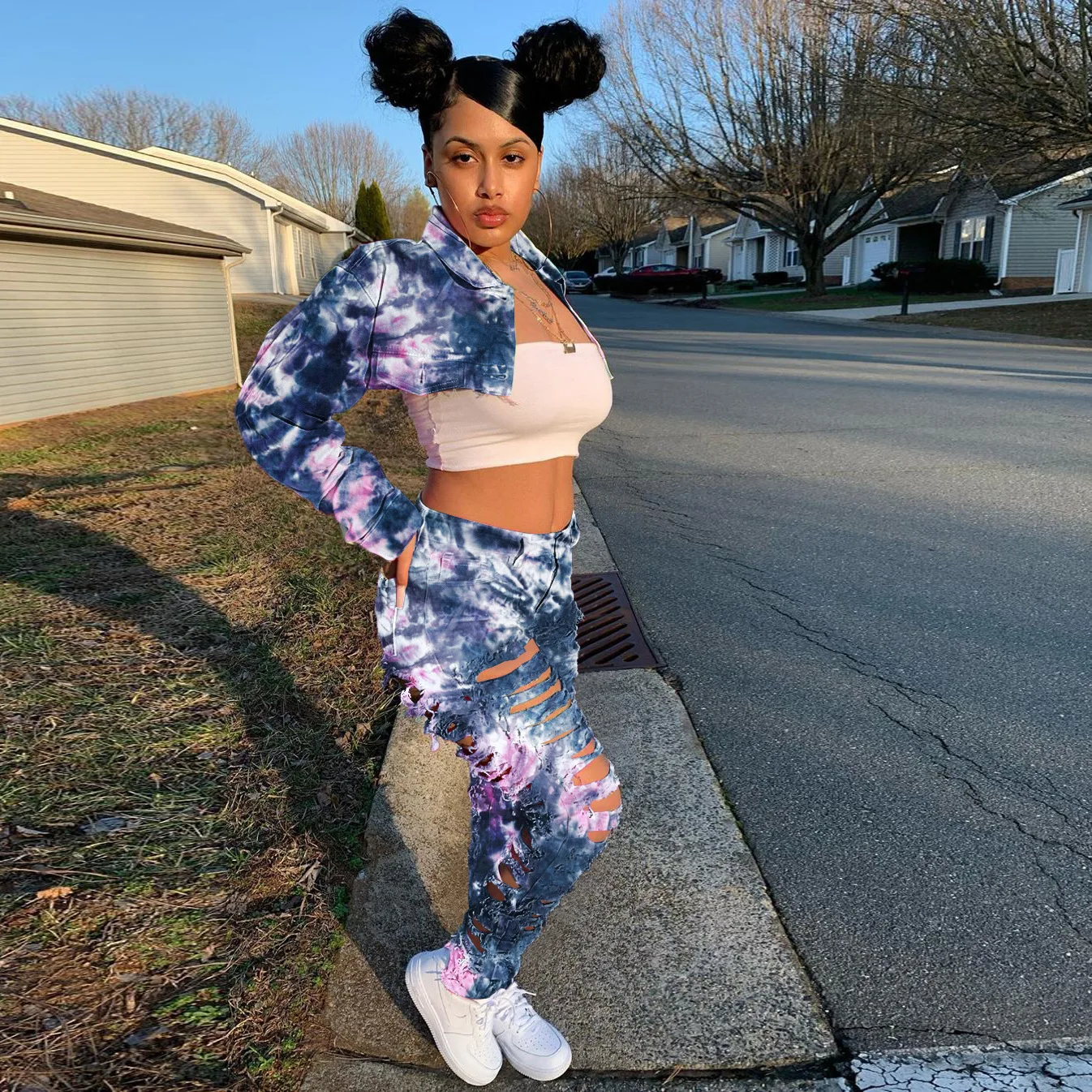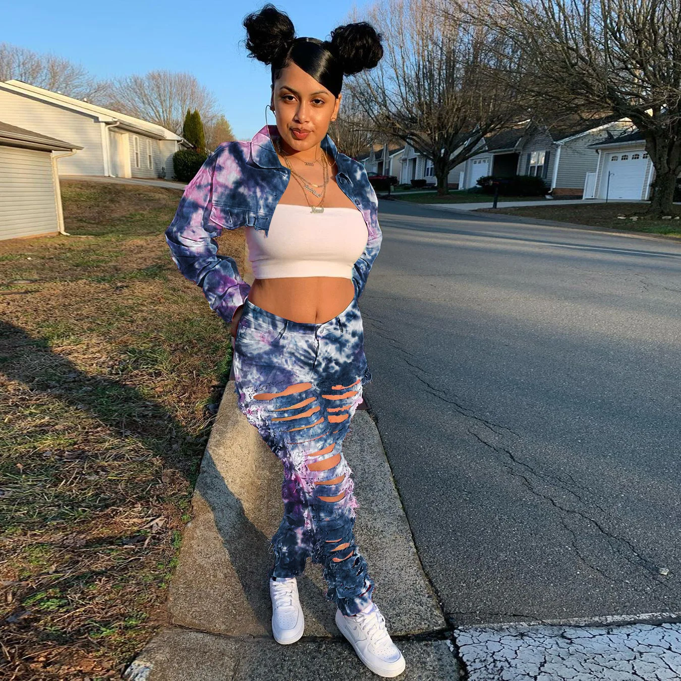CM.YAYA Women Tie Dye Print Hole Pencil Ripped Jeans Streetwear Hollow Out Denim Pants (Only Pants)