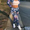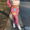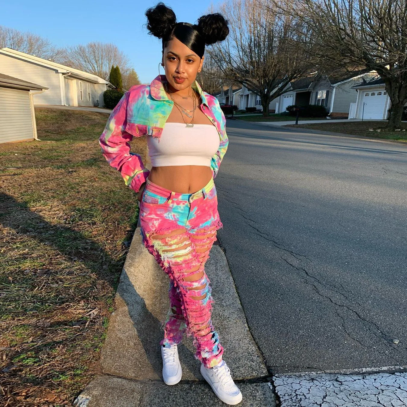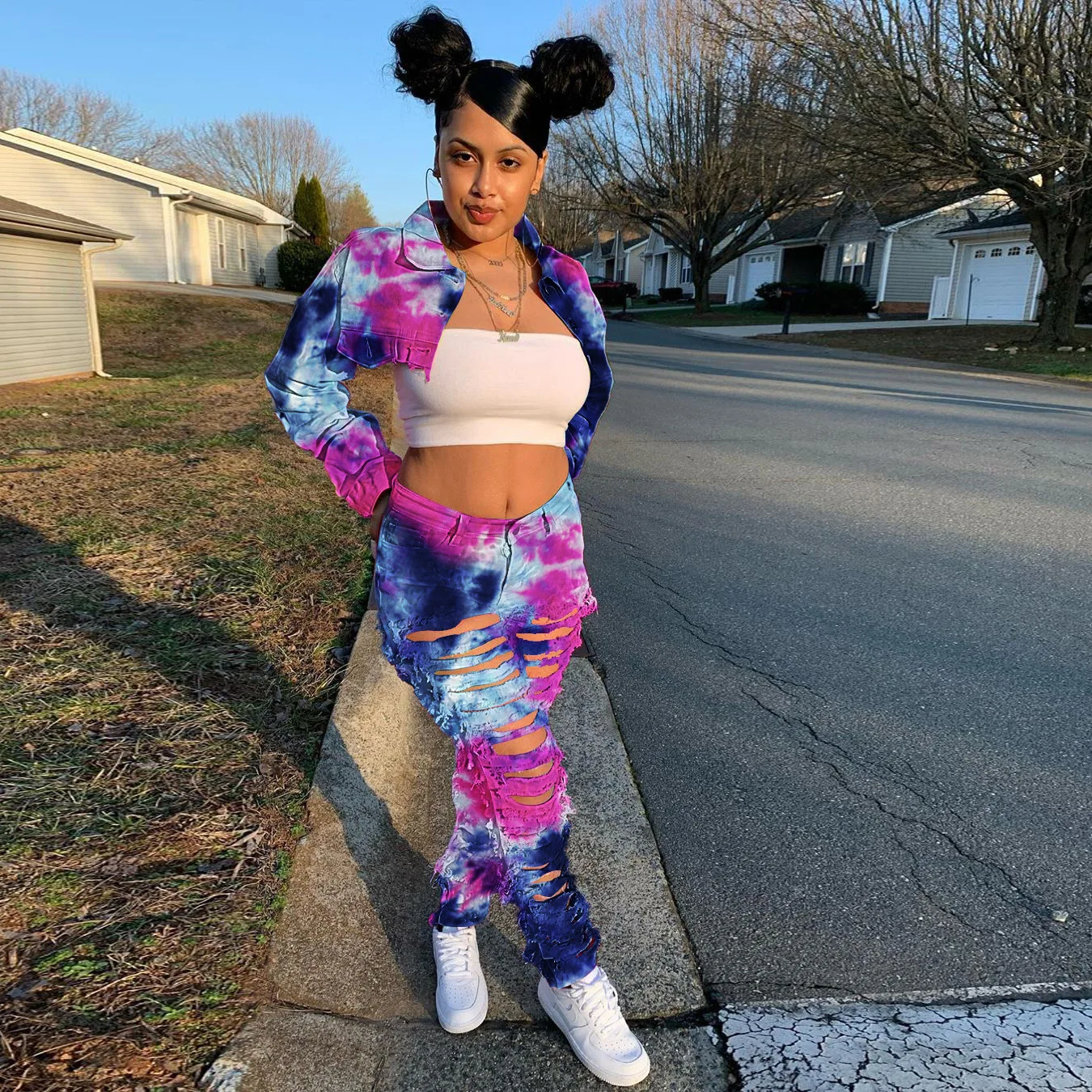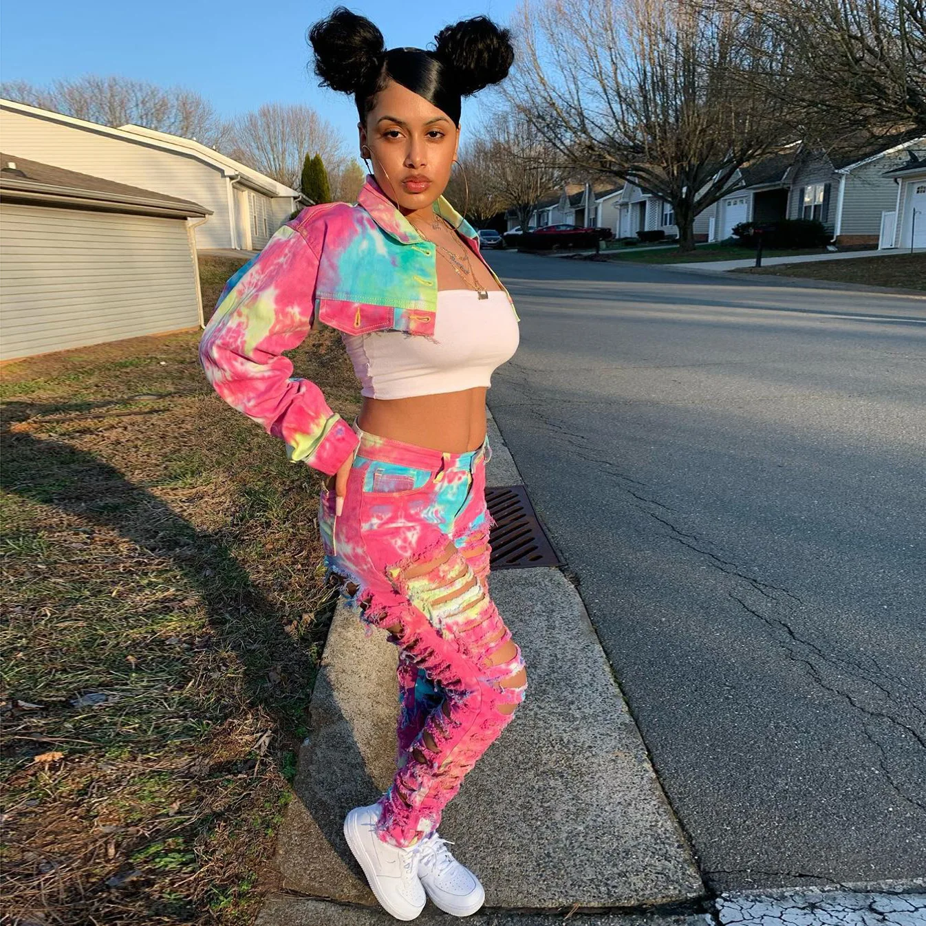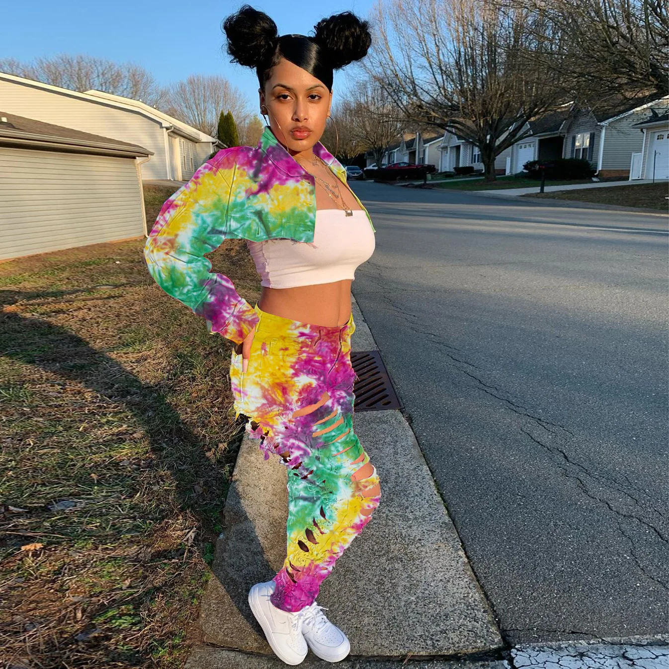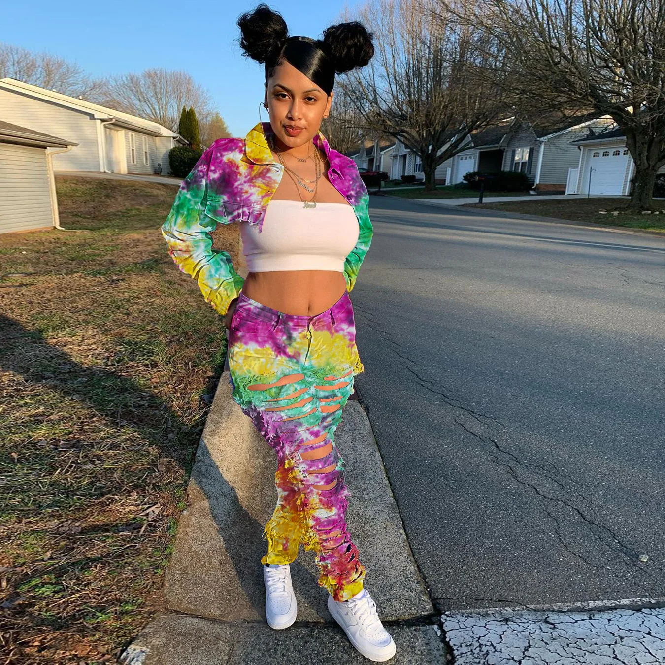 CM.YAYA Women Tie Dye Print Hole Pencil Ripped Jeans Streetwear Hollow Out Denim Pants (Only Pants)