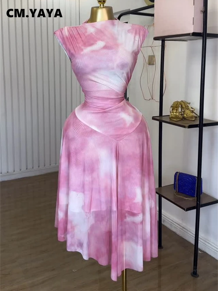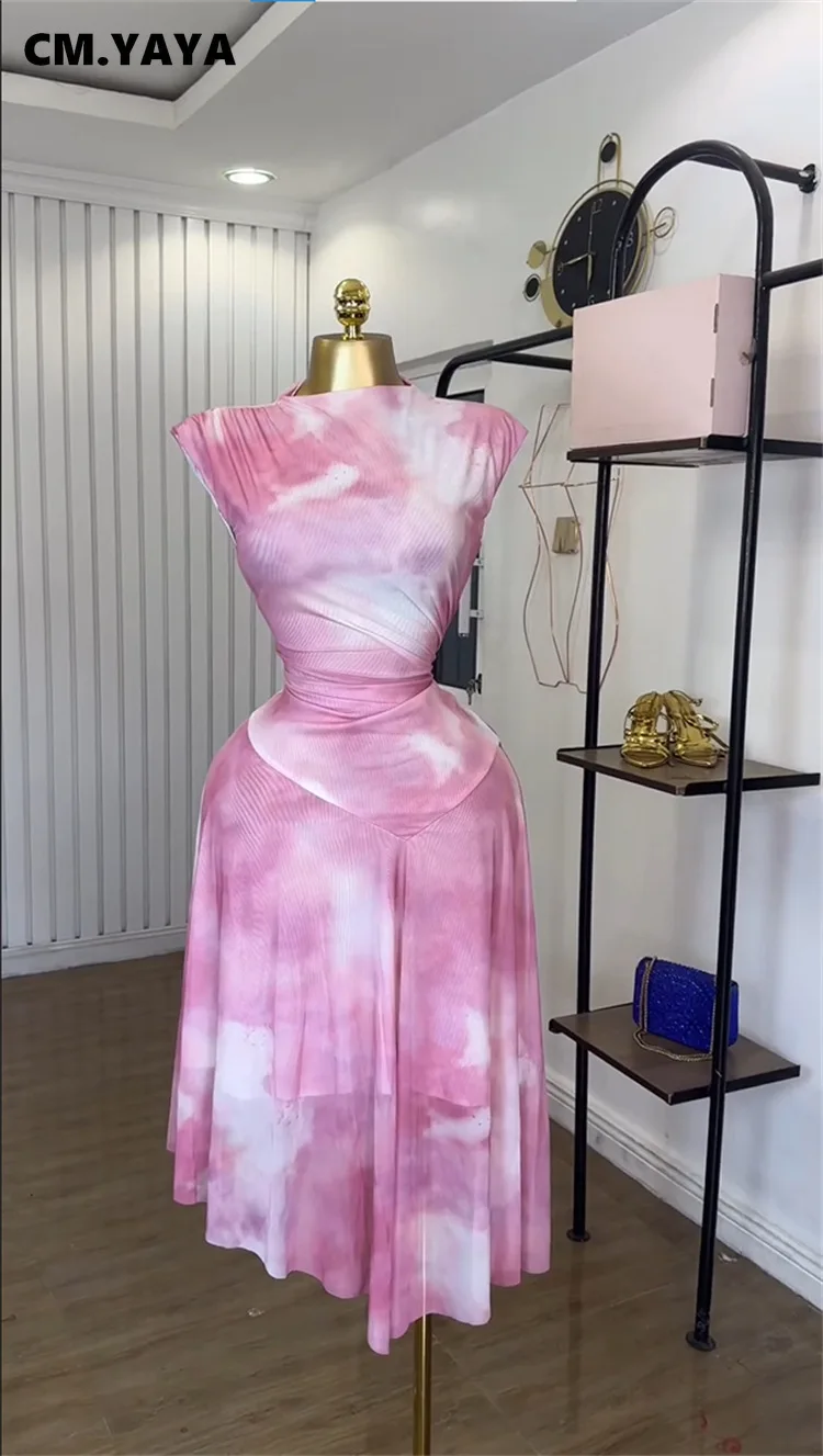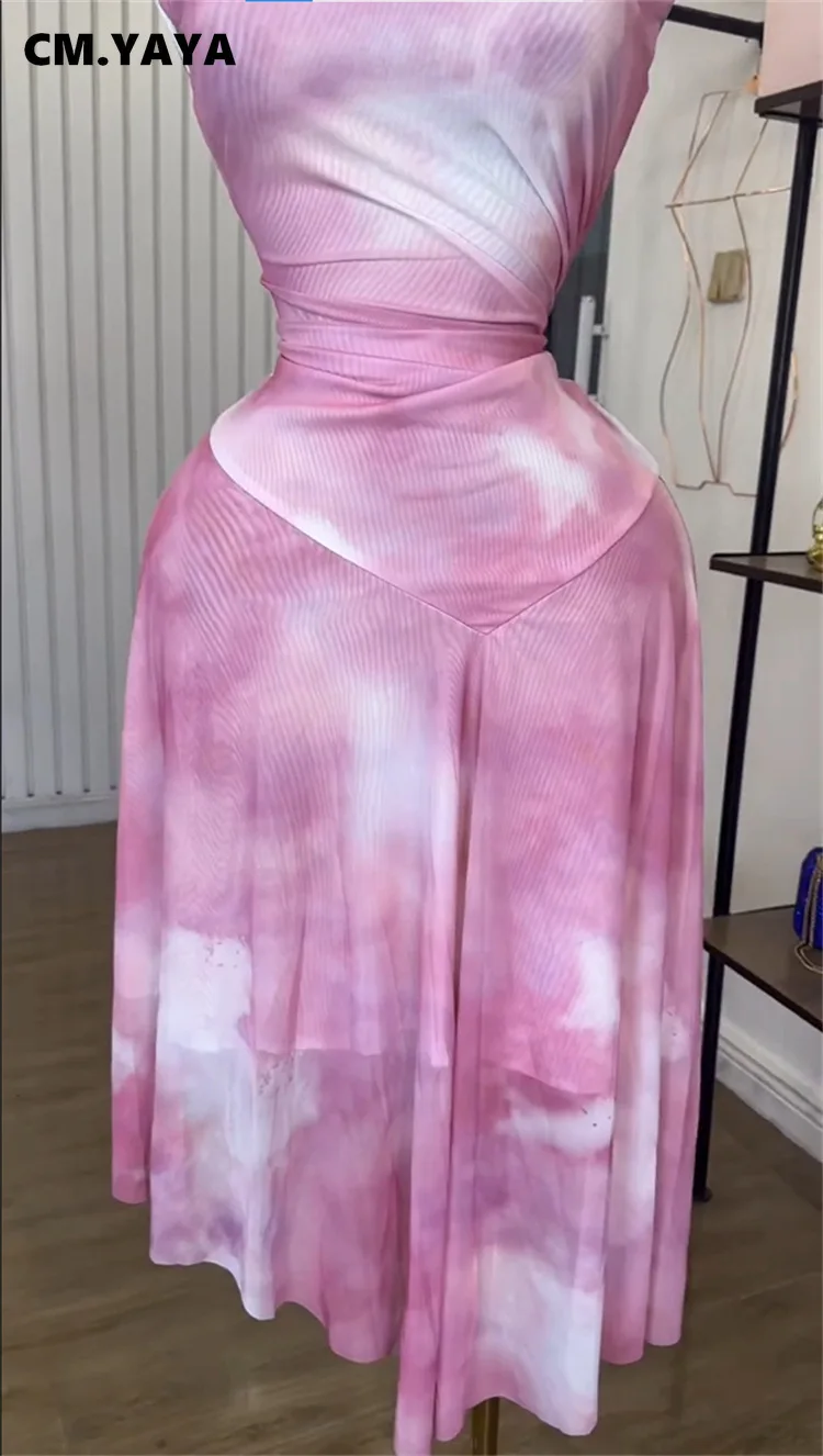 CM.YAYA Women Tie Dye Printed Sleeveless Ruched Stacked Irregular Dress 2025 Summer Beach Birthday Club Party Evening Dresses