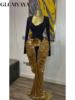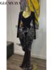 CM.YAYA Women V-Neck Long Sleeve Gilding Patchwork Lace Up Back Ruched Stacked Midi Long Maxi Dress 2025 Party Vacation Dresses