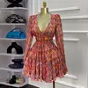 CM.YAYA Women V-neck Long Sleeve Pleated Mini Dress Sweet Elegant Floral Print Sexy Birthday Beach Night Party Vestidos Dresses