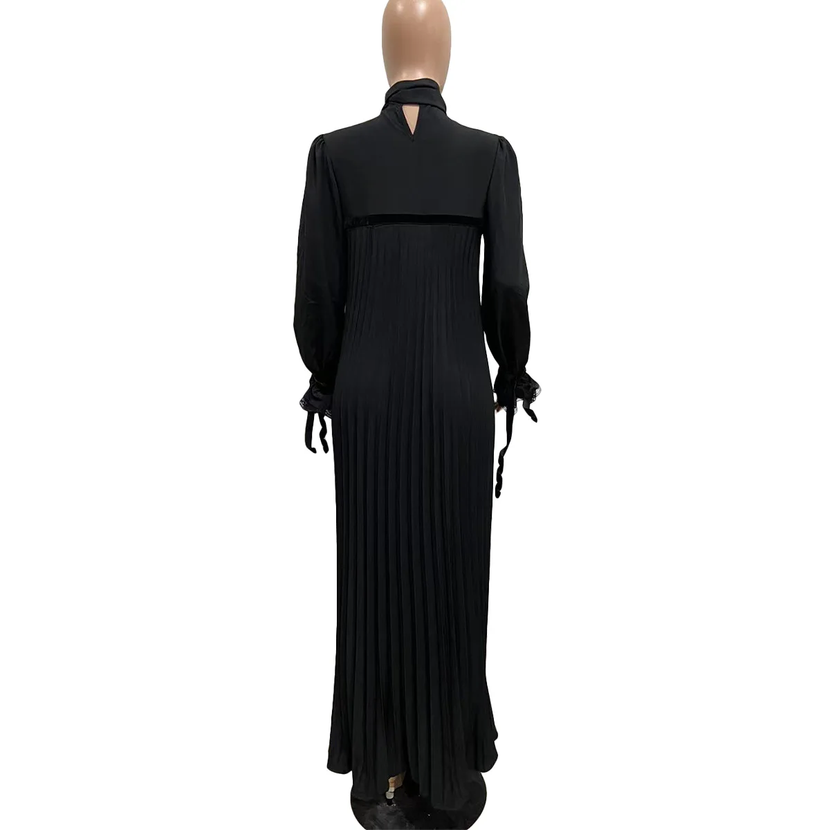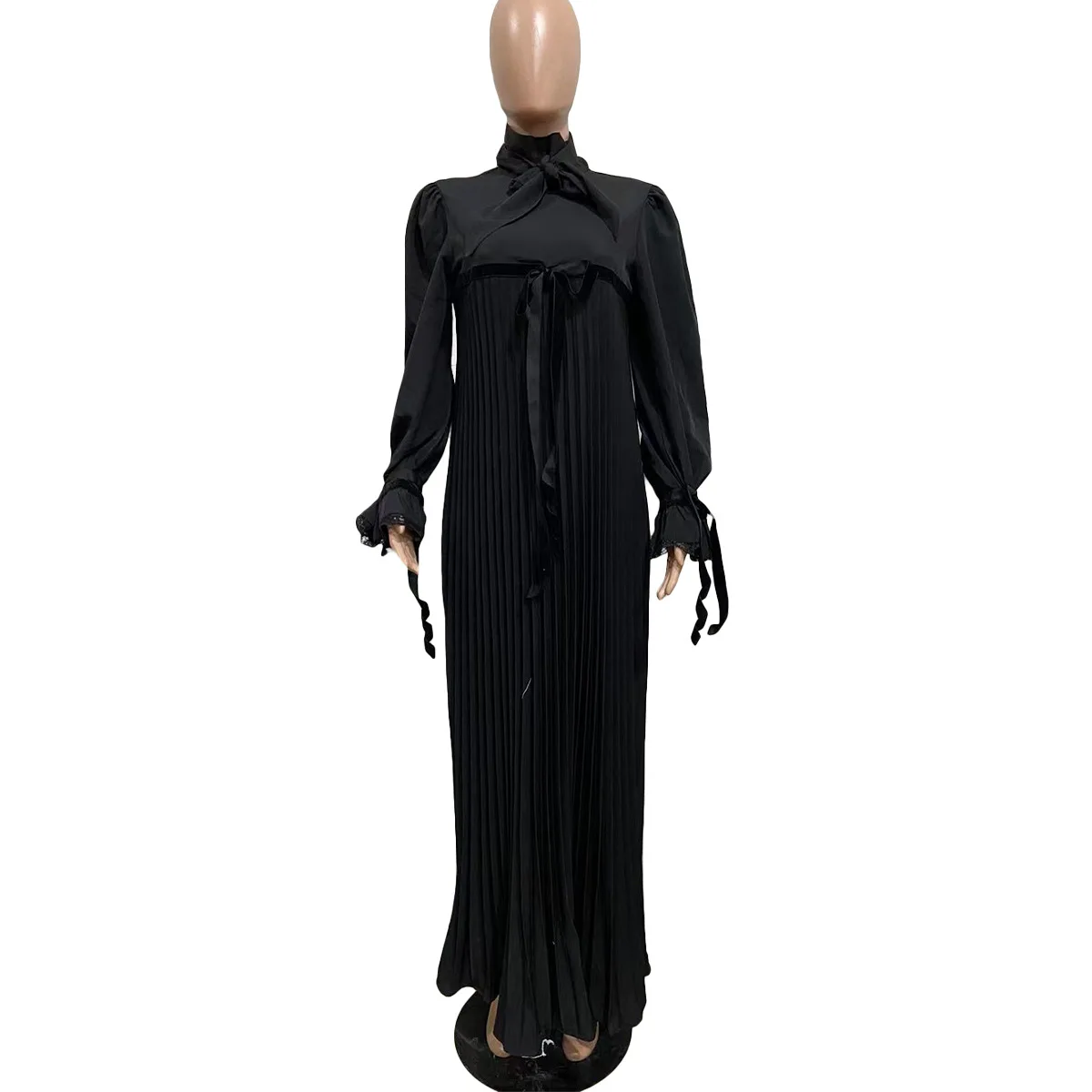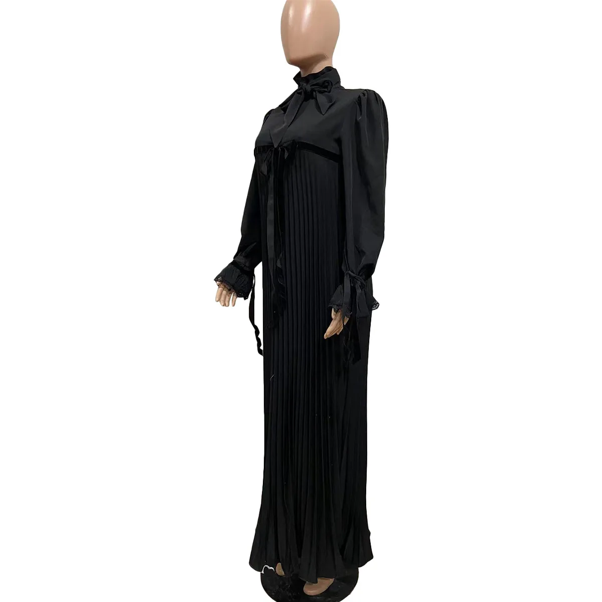 CM.YAYA Women Vintage Bowknot Collar Flare Long Sleeve Pleated Loose Slim Maxi Long Dress Vestidos 2023 New