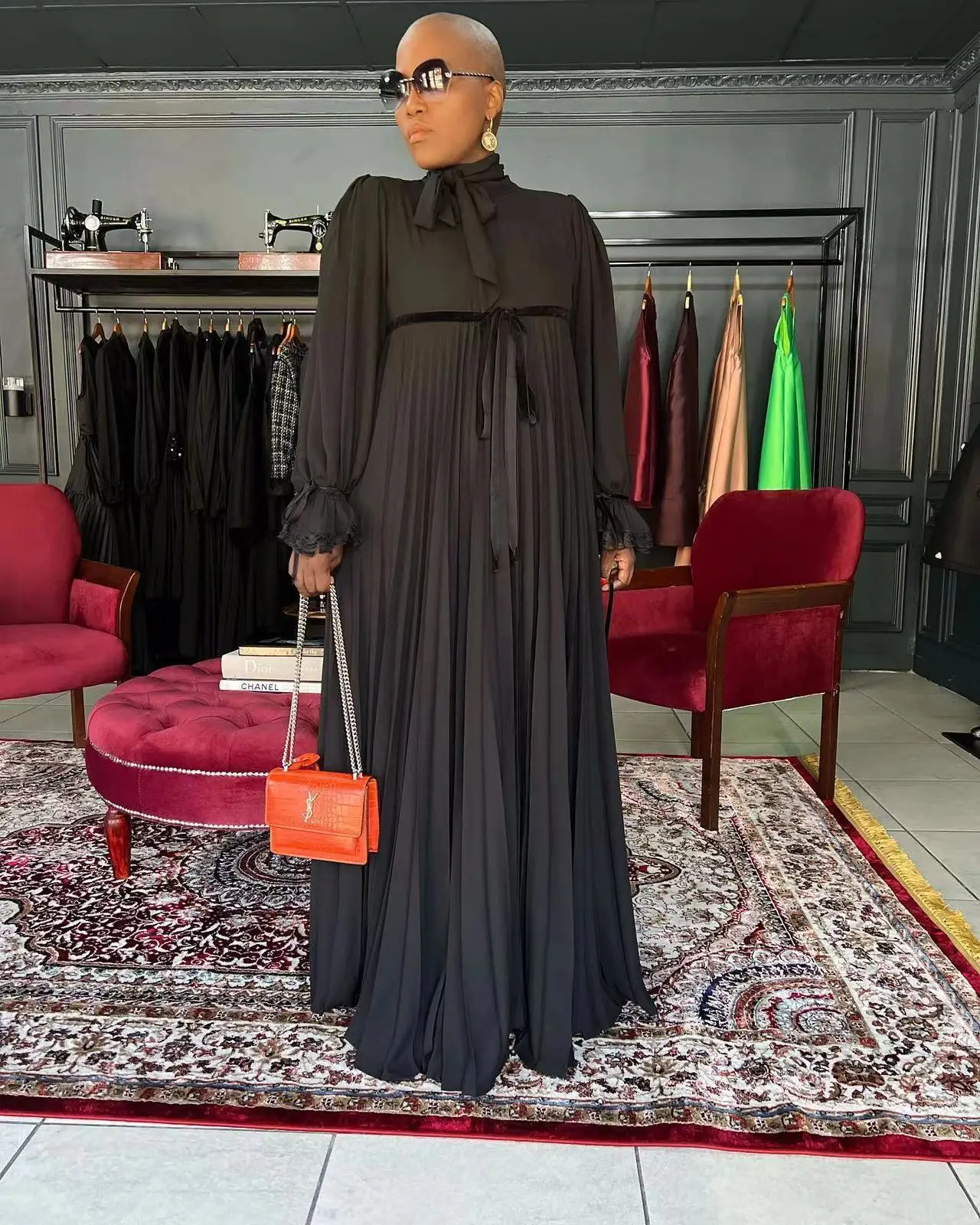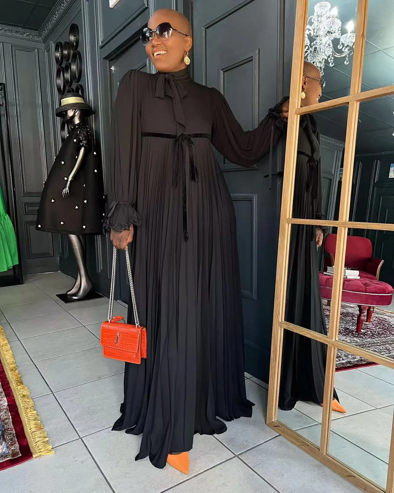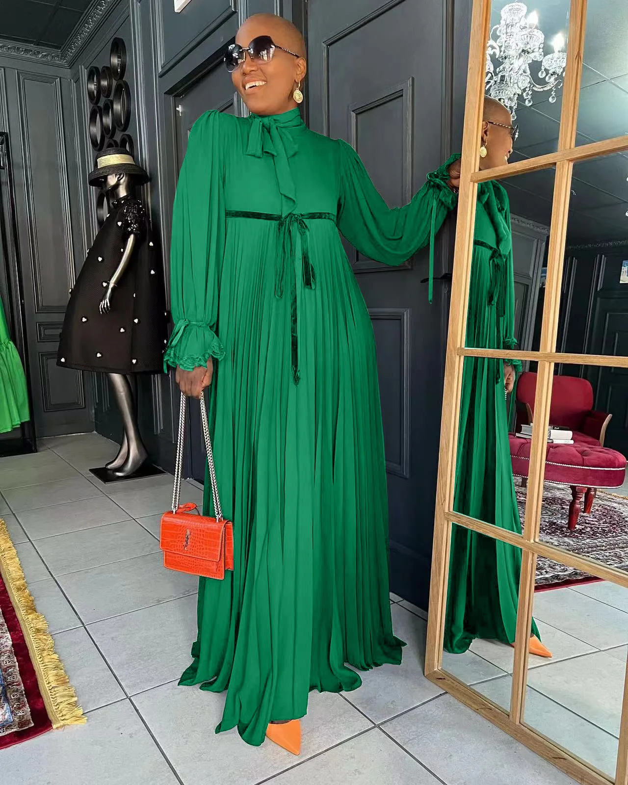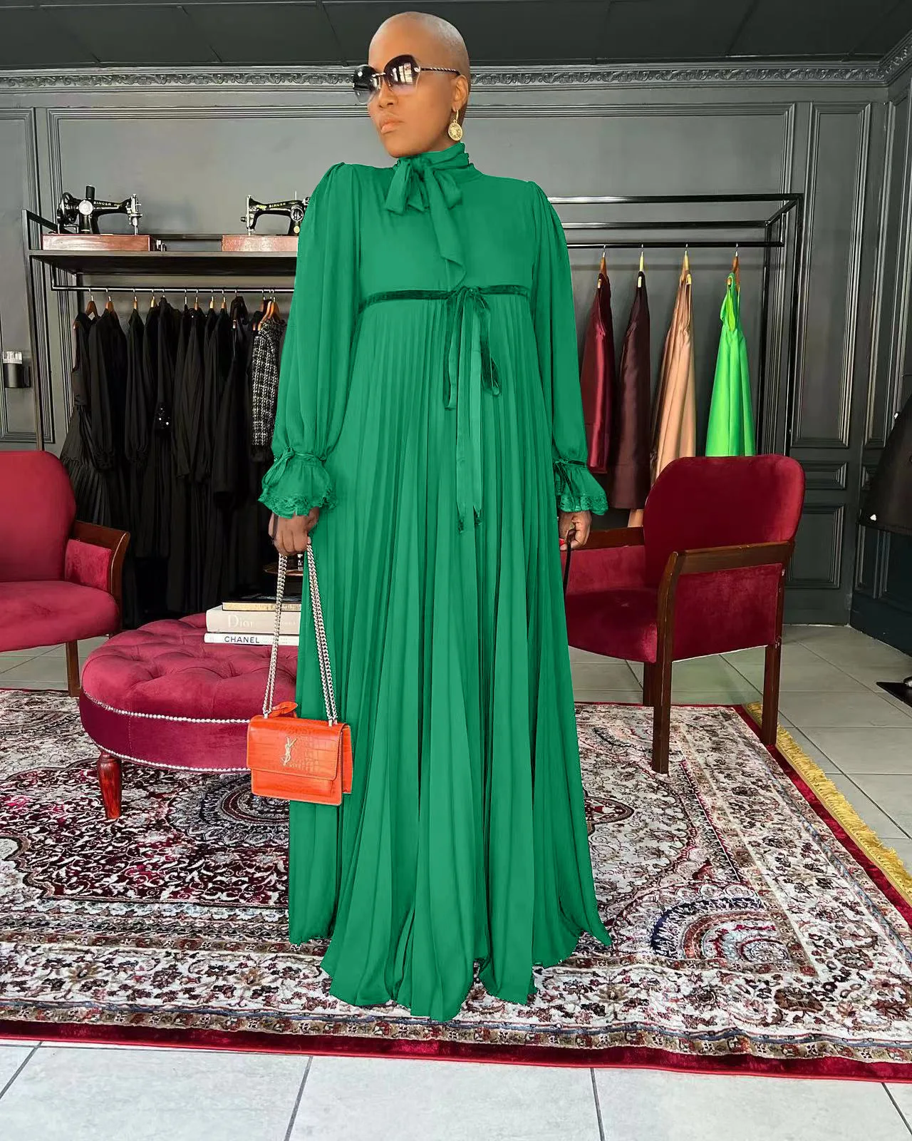 CM.YAYA Women Vintage Bowknot Collar Flare Long Sleeve Pleated Loose Slim Maxi Long Dress Vestidos 2023 New