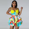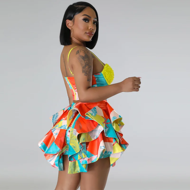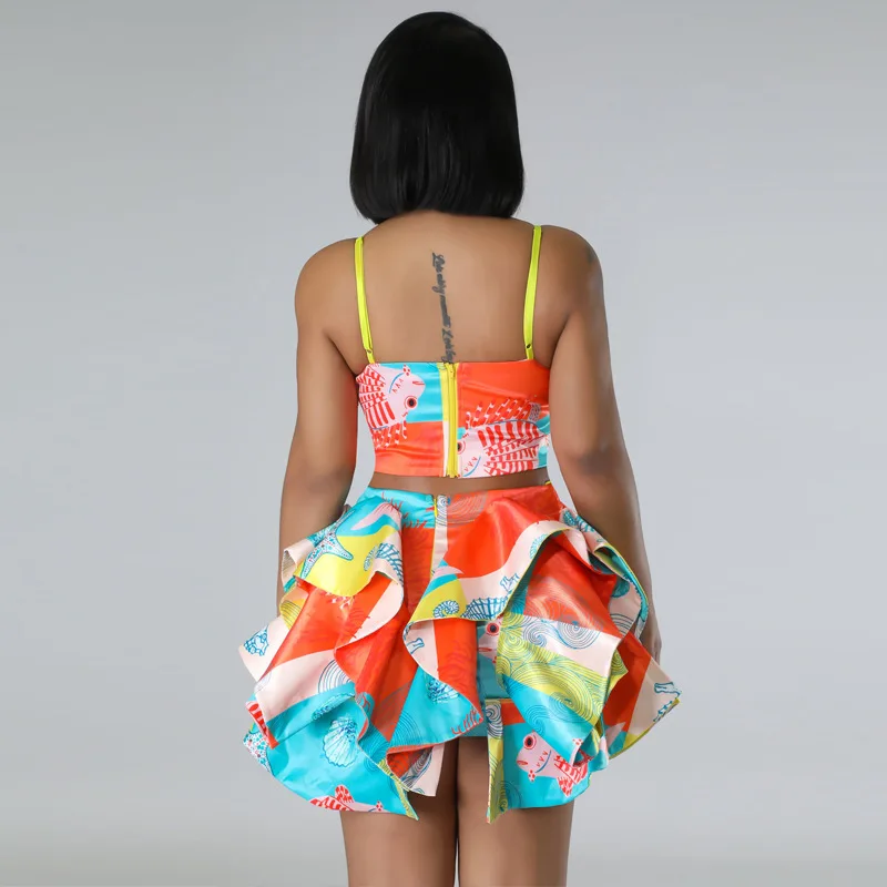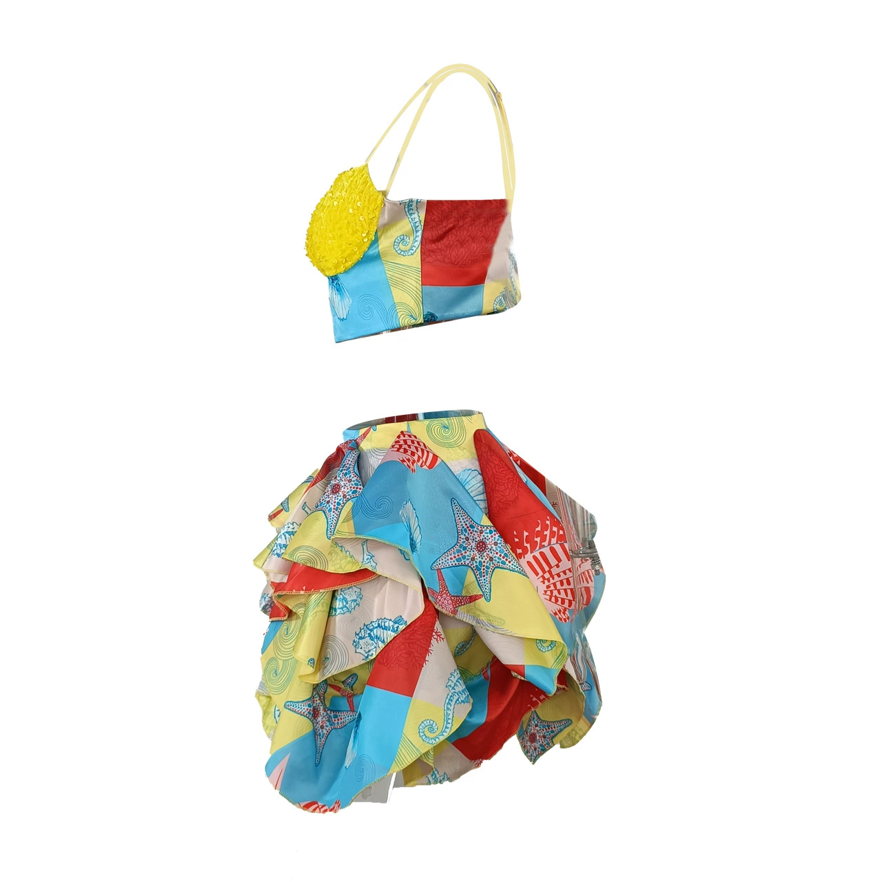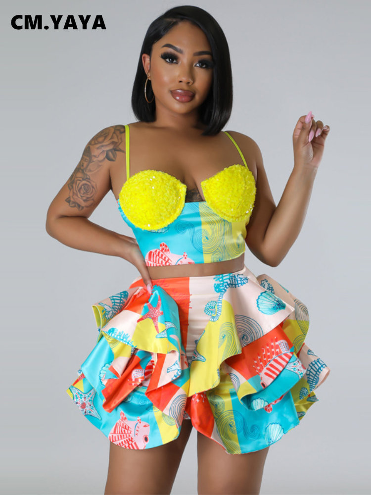 CM.YAYA Women’s Set Sequined Crop Top and Starfish Cascading Ruffles Skirt Shorts 2023 Beach Outfit Two 2 Piece Set Tracksuit