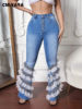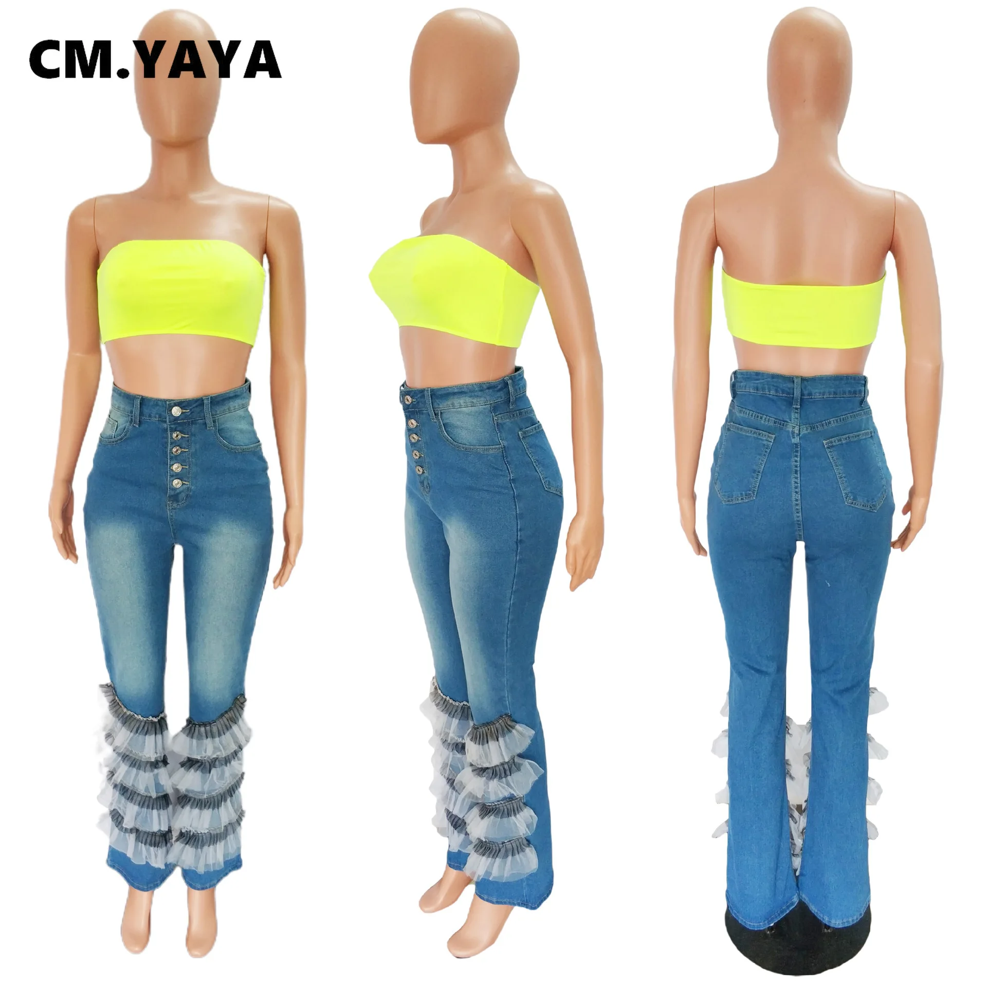 CMYAYA Elegant Women Mesh Patchwork Cascading Ruffles Flare Button Fly High Waist Jeans 2022 Street INS Washed Blue Denim Pants