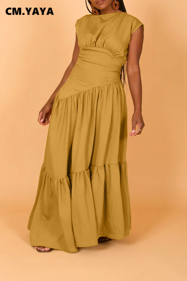 CMYAYA Elegant Women O-neck Short Sleeve Maxi Long Dress 2024 Summer Sexy Folds Casual Night Club Party Street Evening Dresses