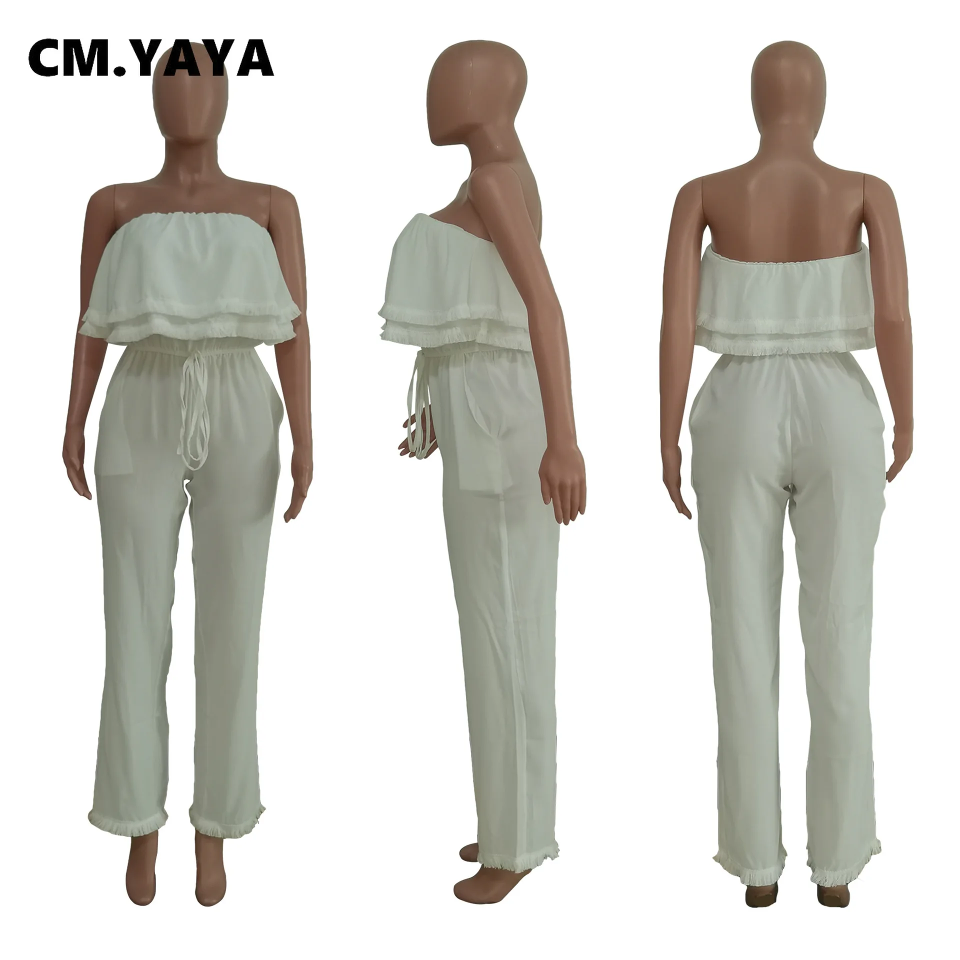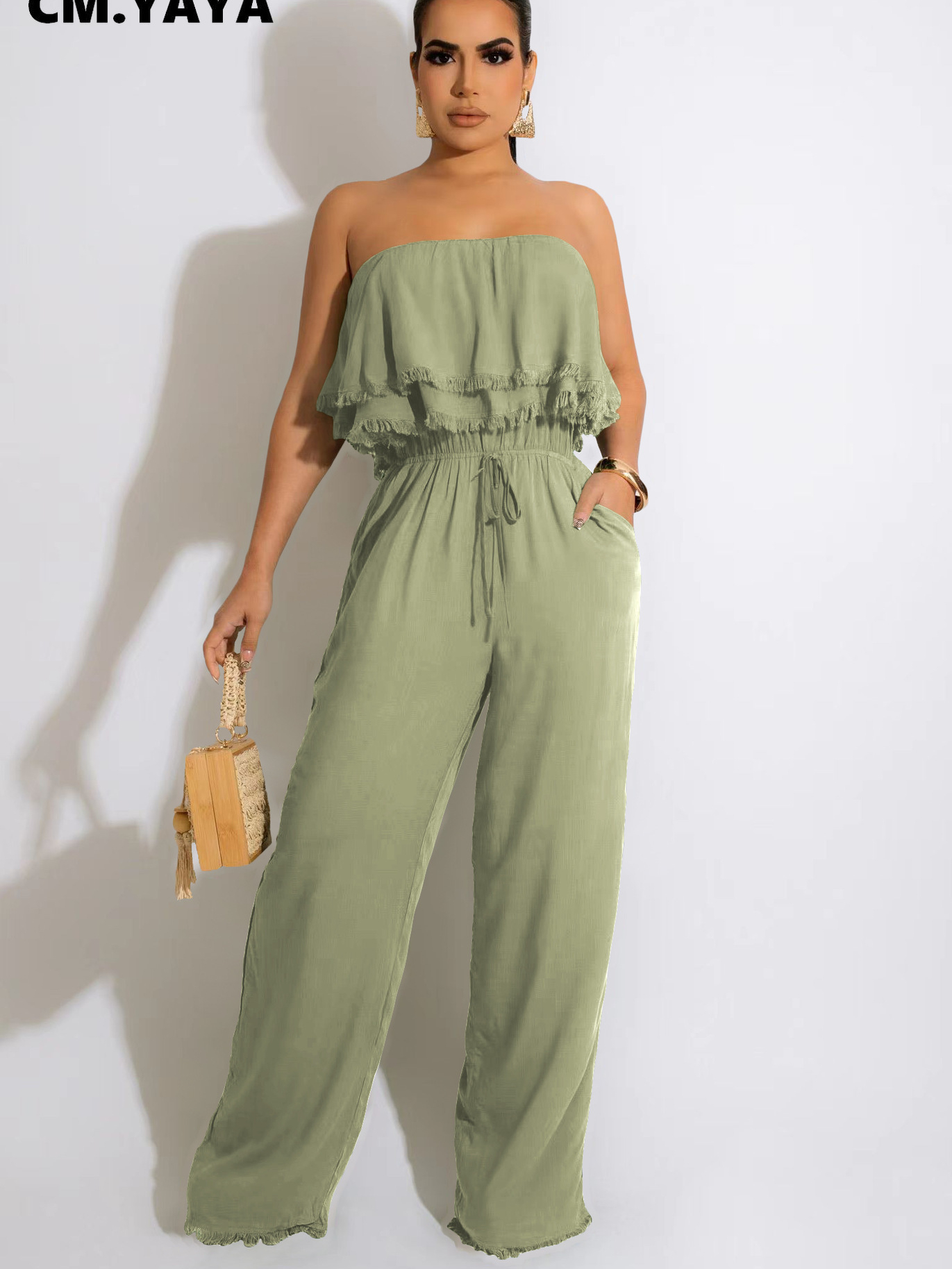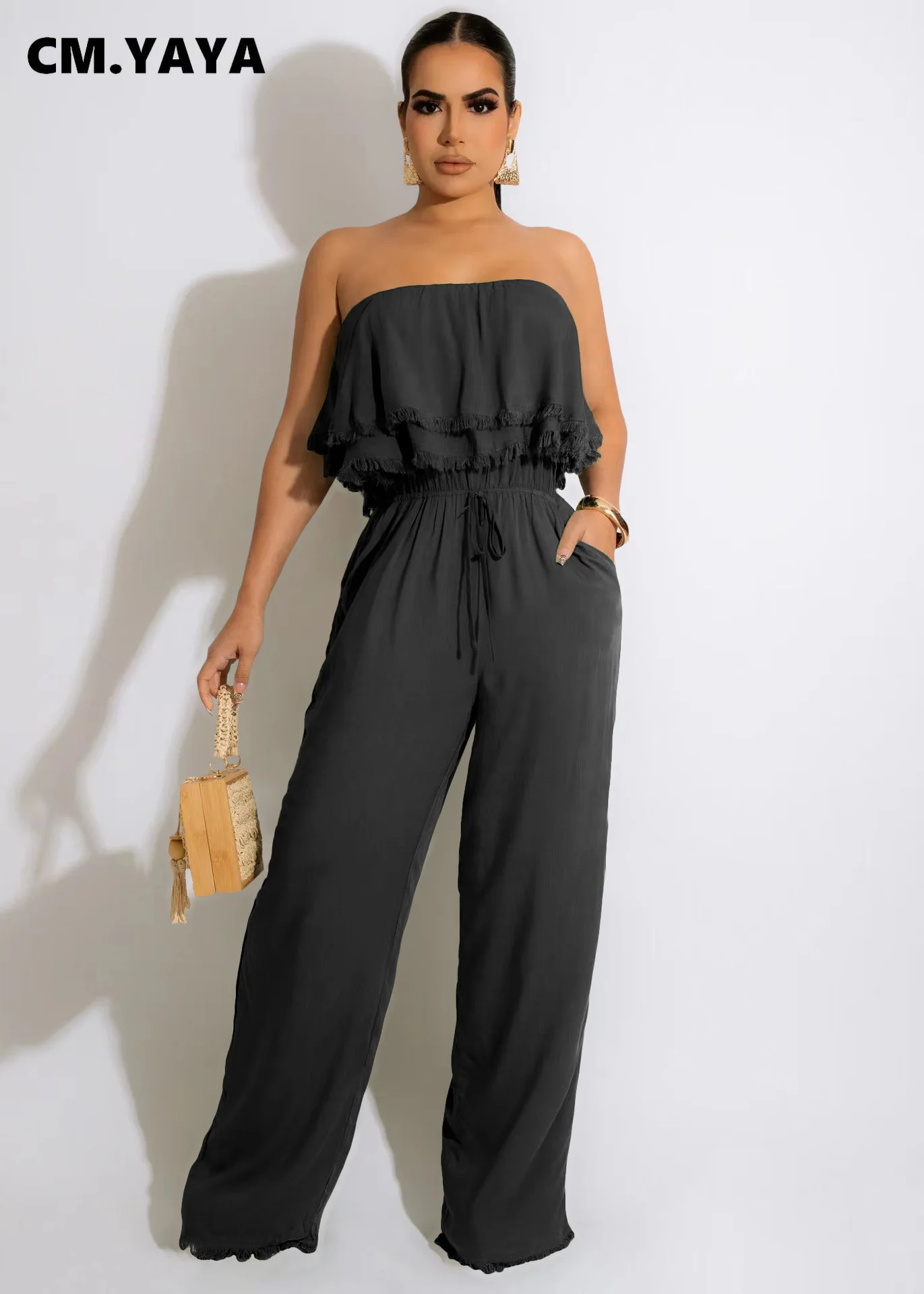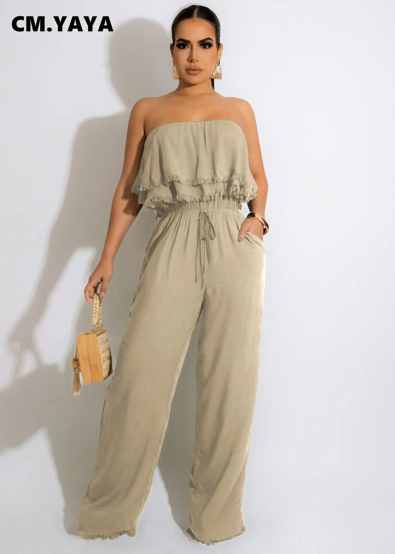 CMYAYA Elegant Women Ruffles Strapless High Waist Tassel Hem Straight Loose Jumpsuit 2022 Summer Boho Holiday Overall Playsuit