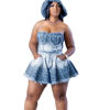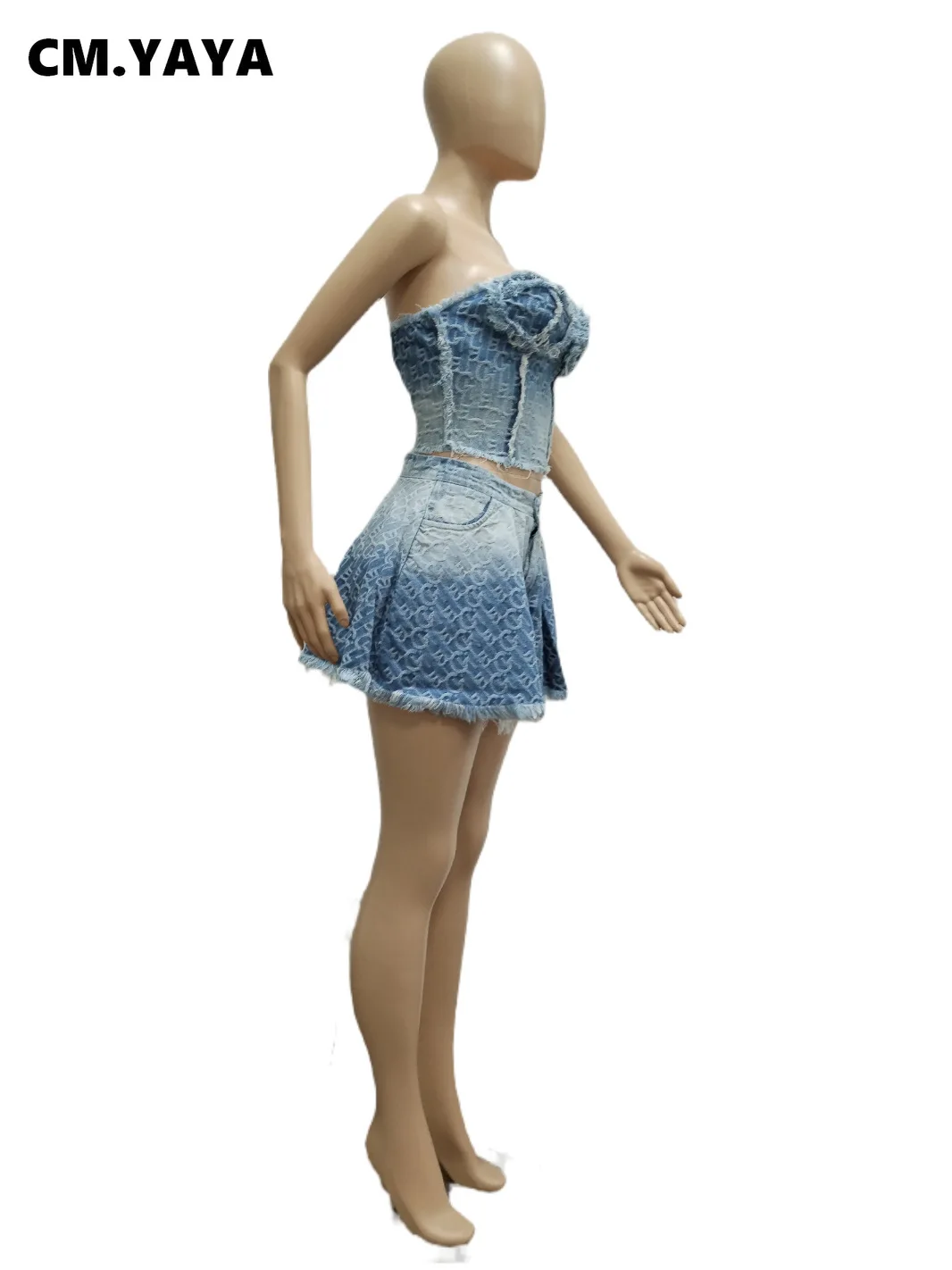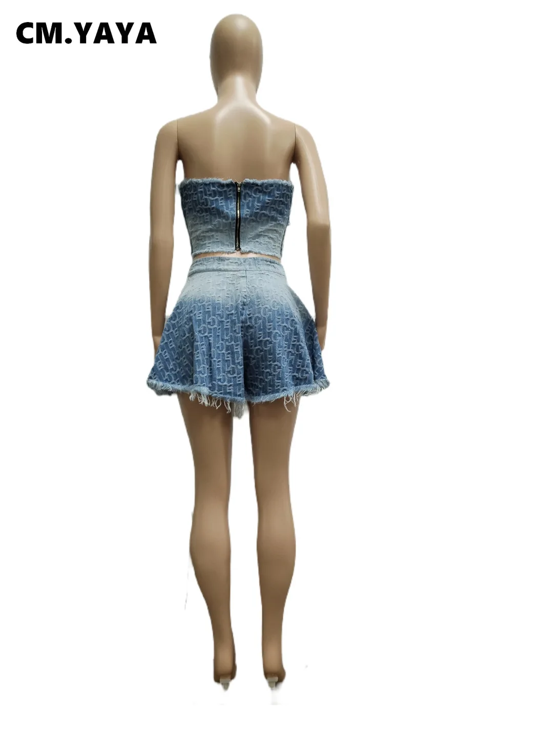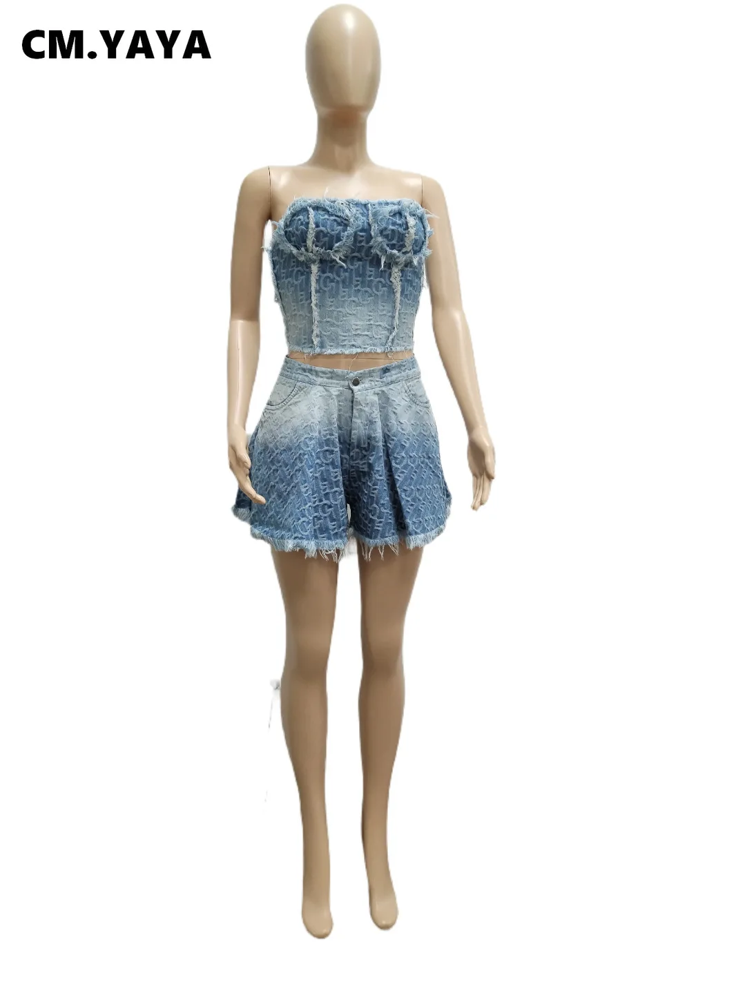 CMYAYA Gradient Letter Jeans Women Shorts Suit and Strapless Crop Top Street Denim Tracksuit Two 2 Piece Set 2022 Summer Outfit