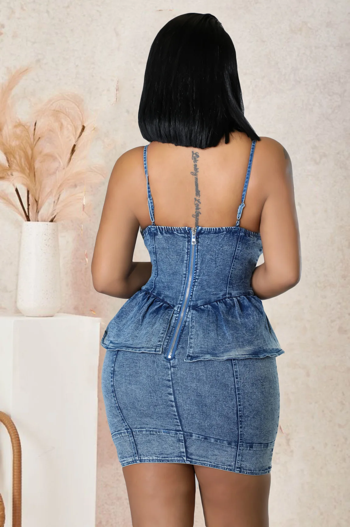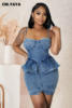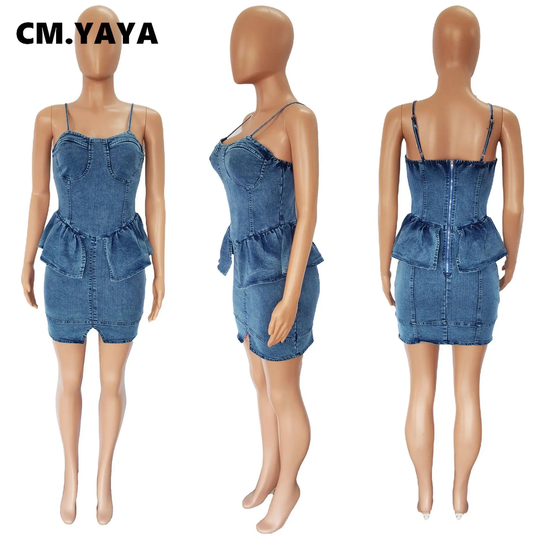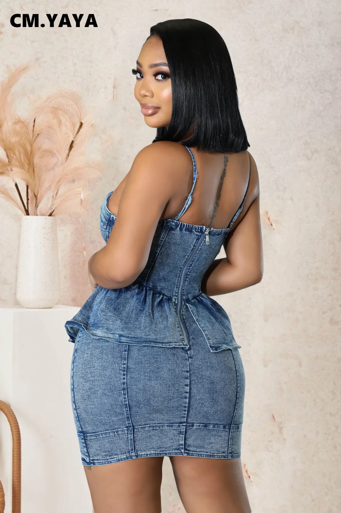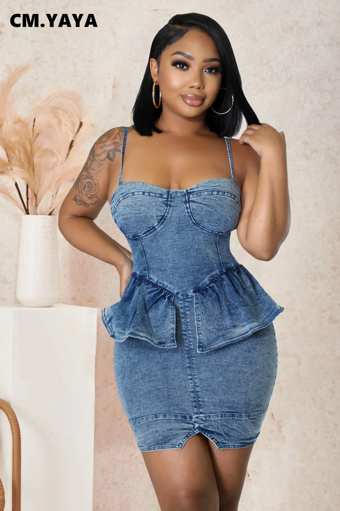 CMYAYA Women Ruffles High Waist Spaghetti Strap Zipper Back Bodycon Midi Jeans Dress 2022 Party Club Elegant INS Denim Dresses