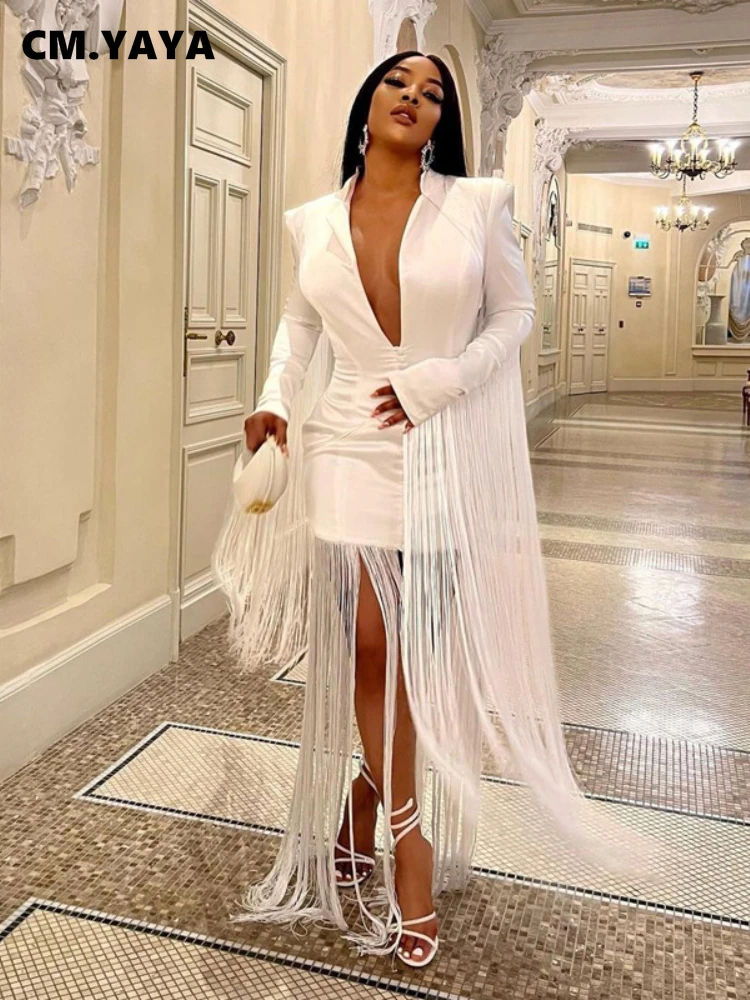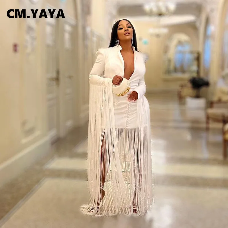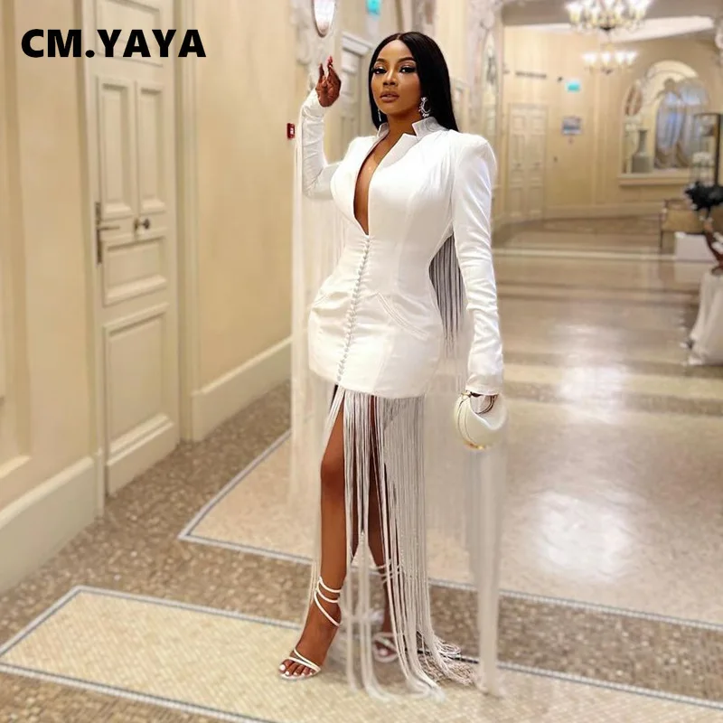 CMYAYA Women Tassel Splicing White Button-up High Waist Blazer Midi Bodycon Dress 2022 Sexy Party Prom Evening Dresses Vestidos