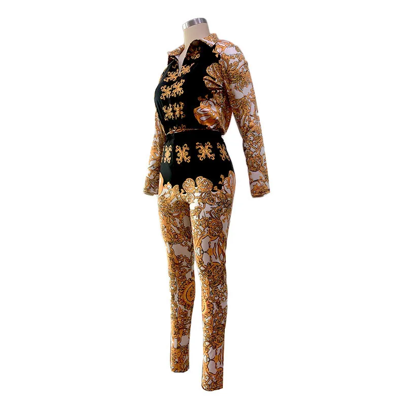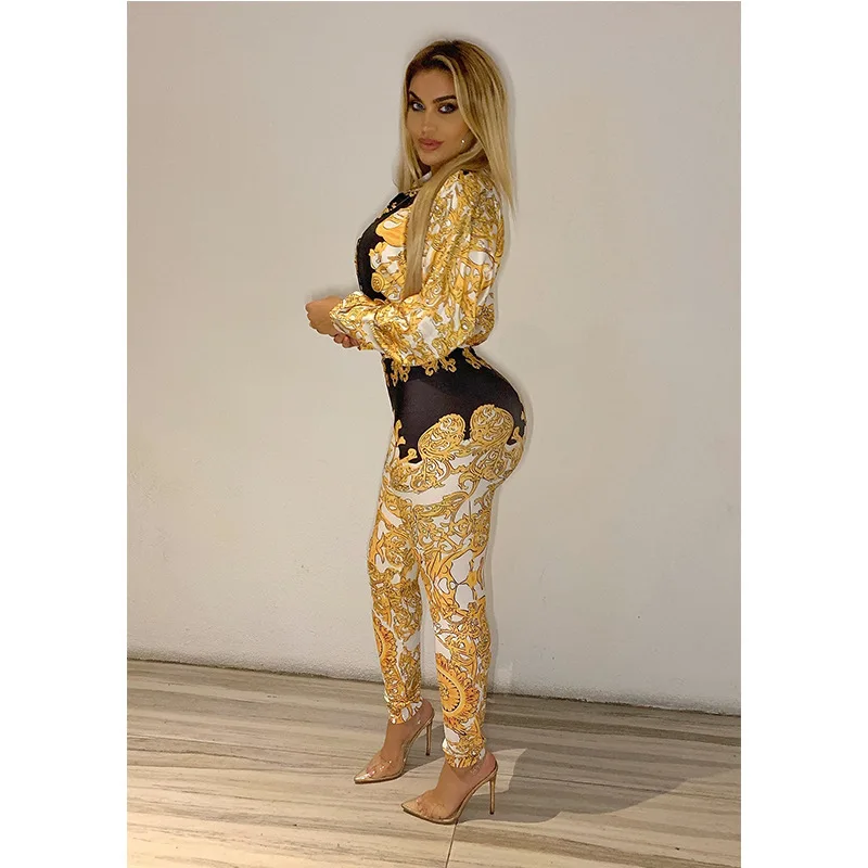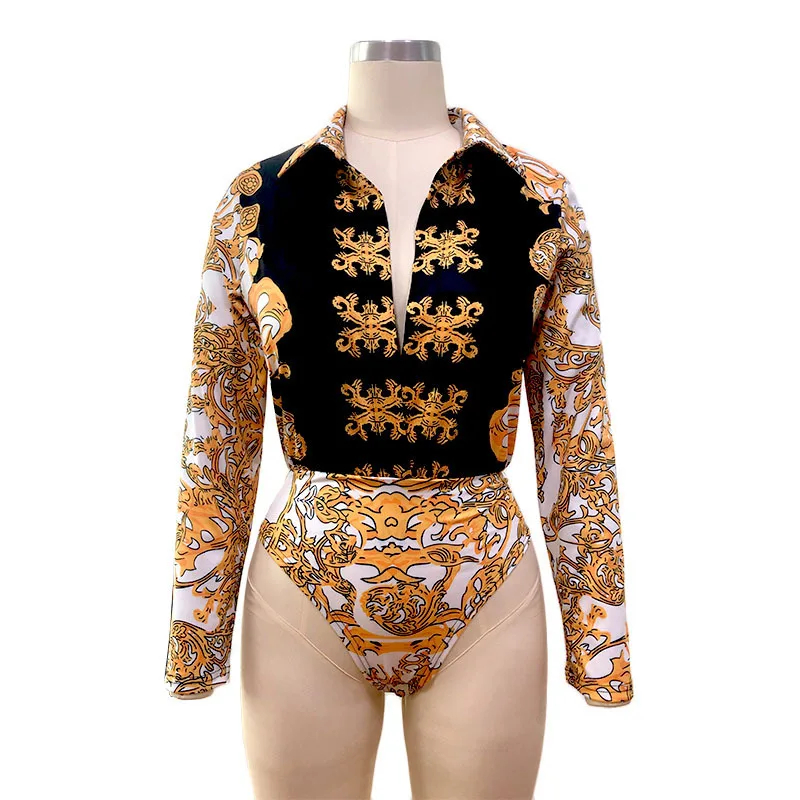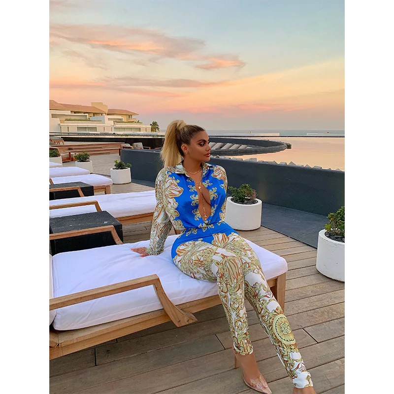 Colorblock Print Plunge Jumpsuit Autumn Long Sleeve Rompers Womens Blouse Dodysuit+pants 2 Piece Jumpsuit Combinaison Femme
