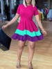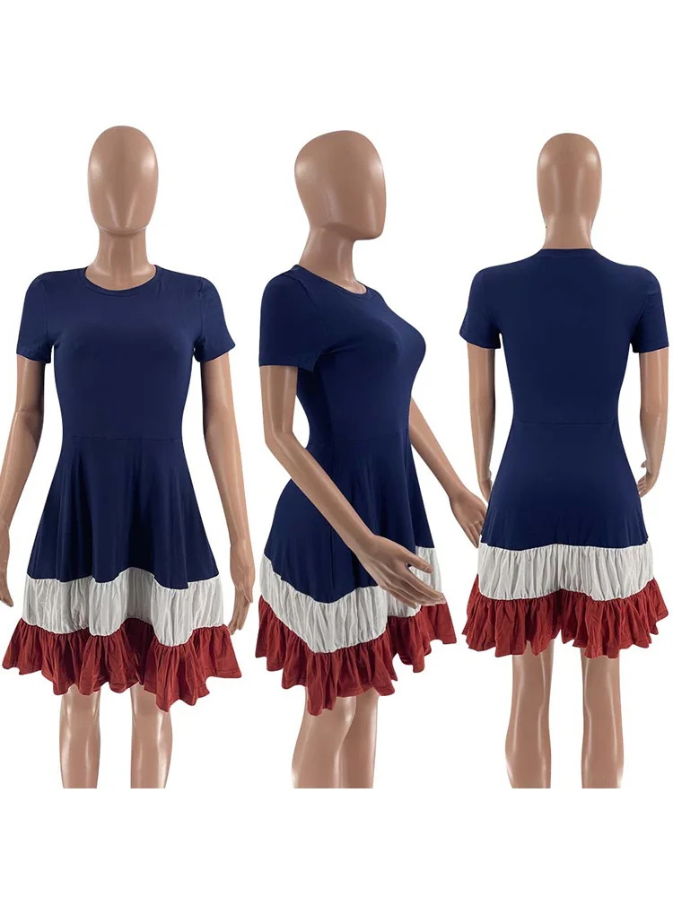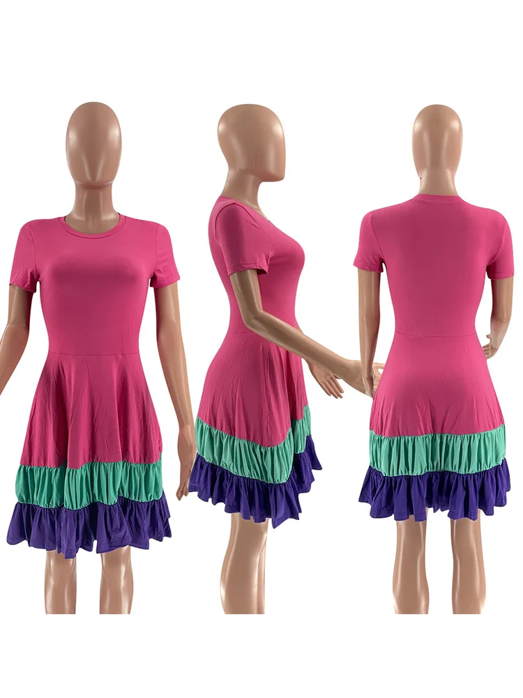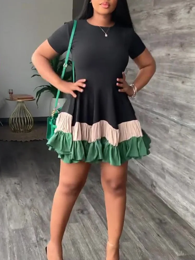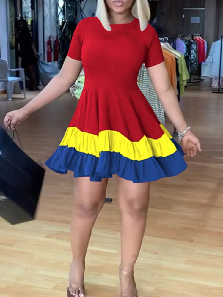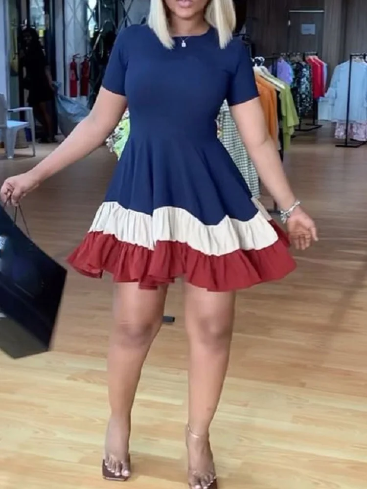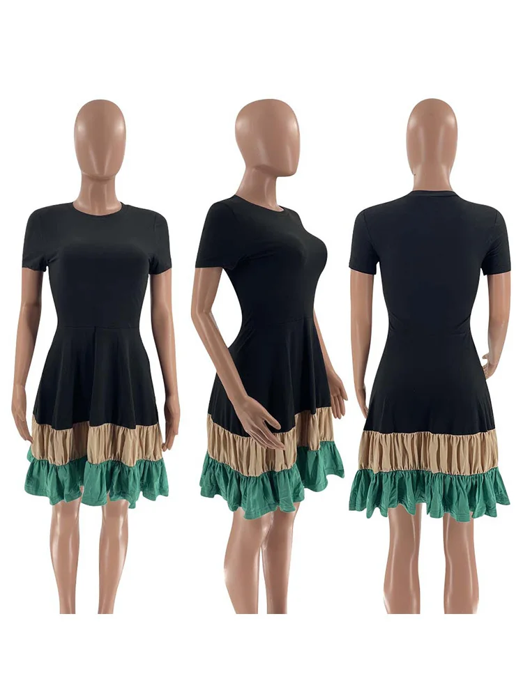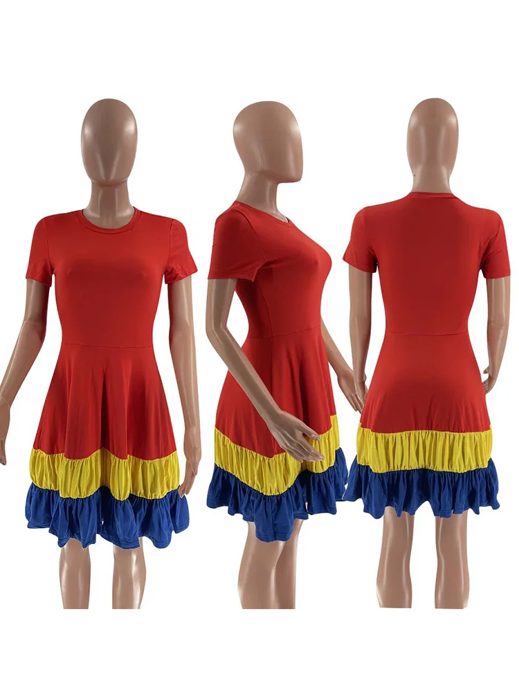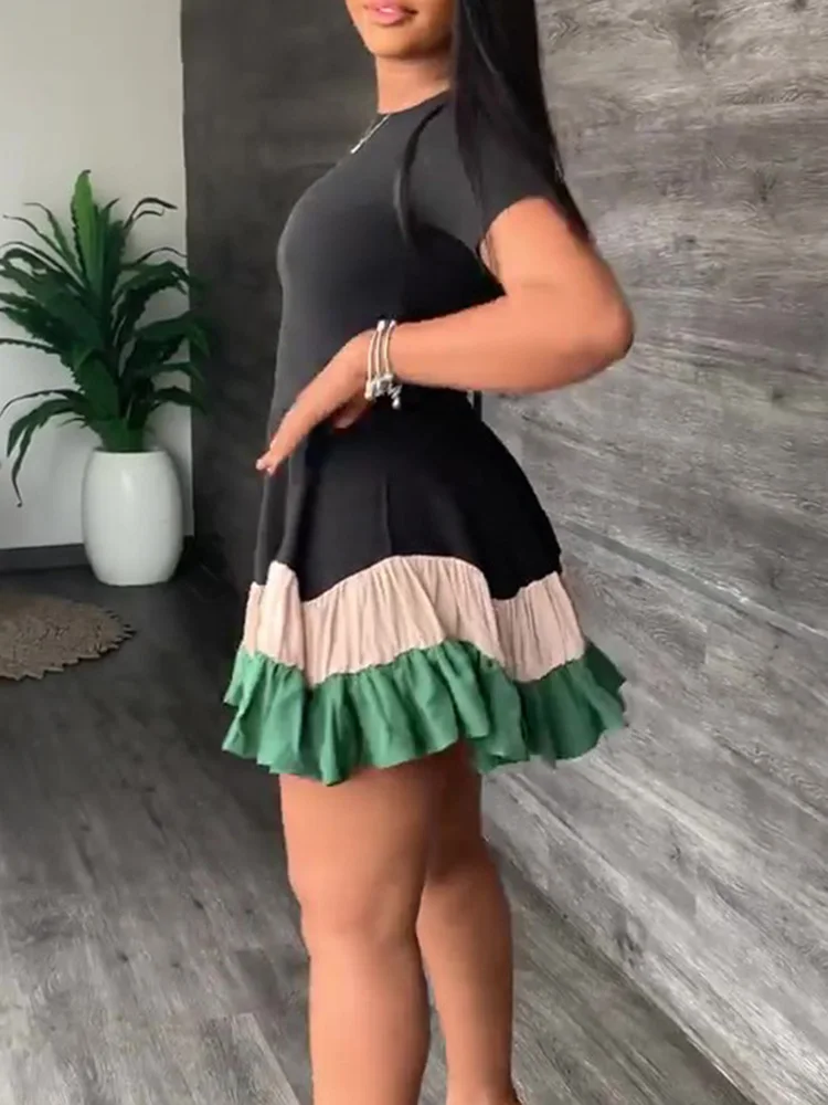 Colorblock Print Ruched Ruffles Short Sleeve Summer Dress Women