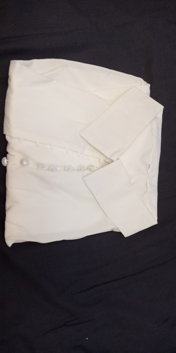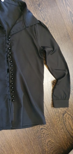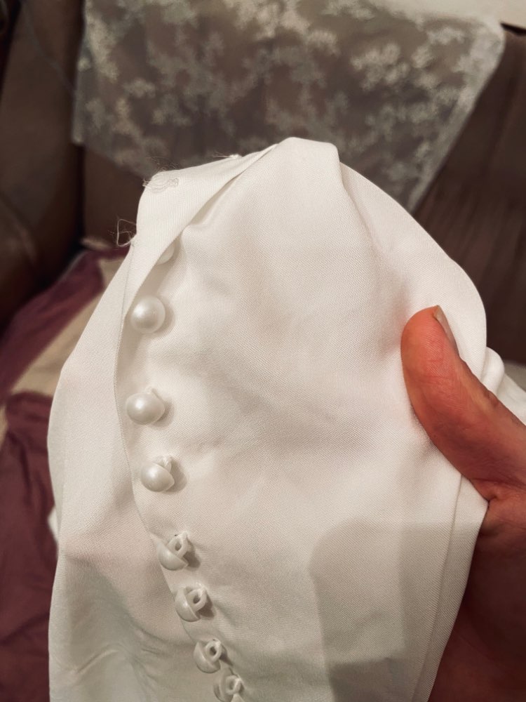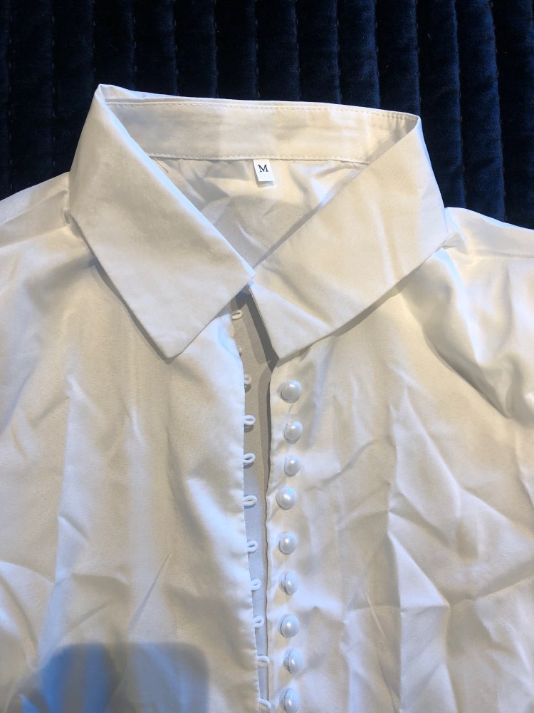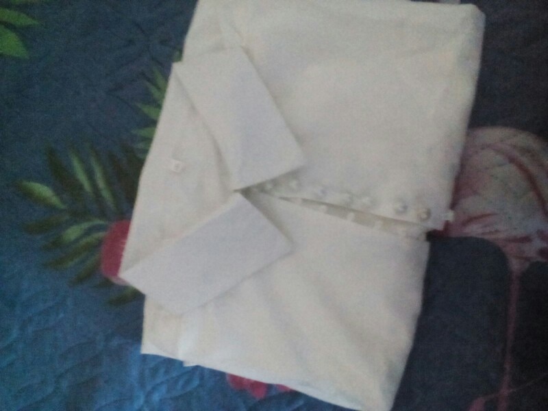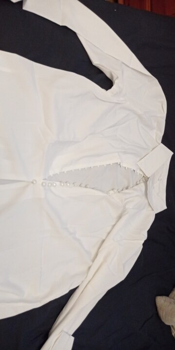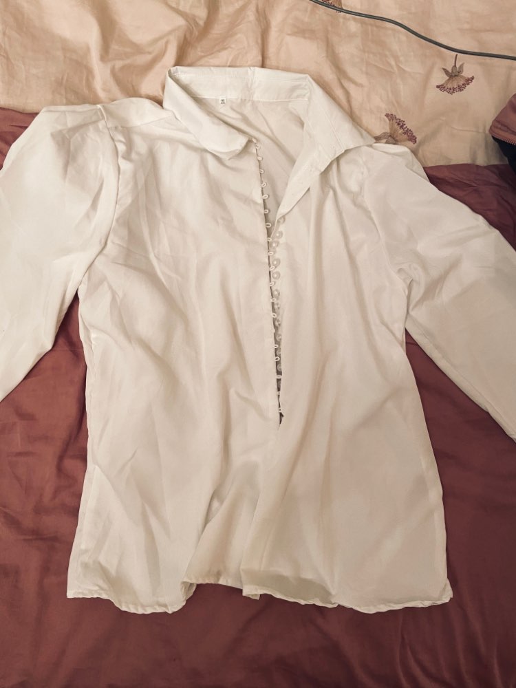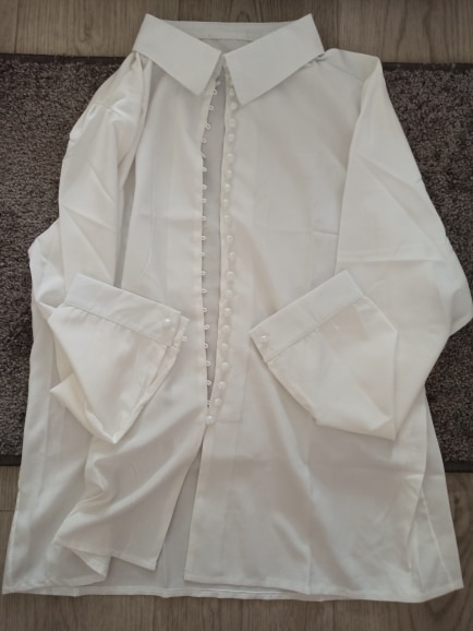 It's beautiful, the fabric is fresh as summer and transparent a little bit. The size is as shown in the measurements. The buttons thing is a mess, it's a lot of jajajaja but that gives the shirt a nice detail.