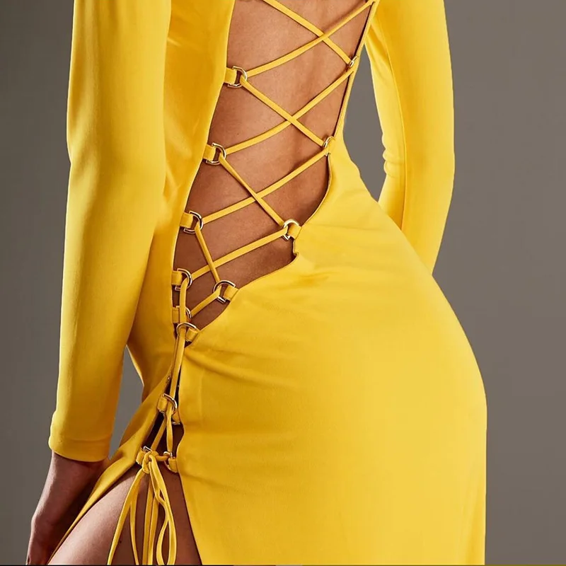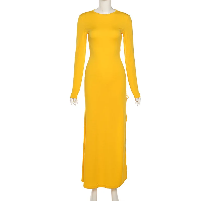 Cryptographic Fall 2021 Fashion Bandage Long Sleeve Sexy Backless Maxi Dress Women Clothing Elegant Club Party Split Dresses