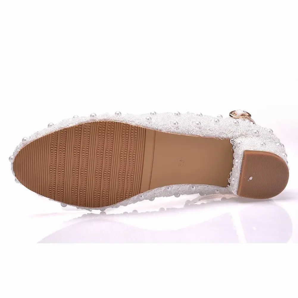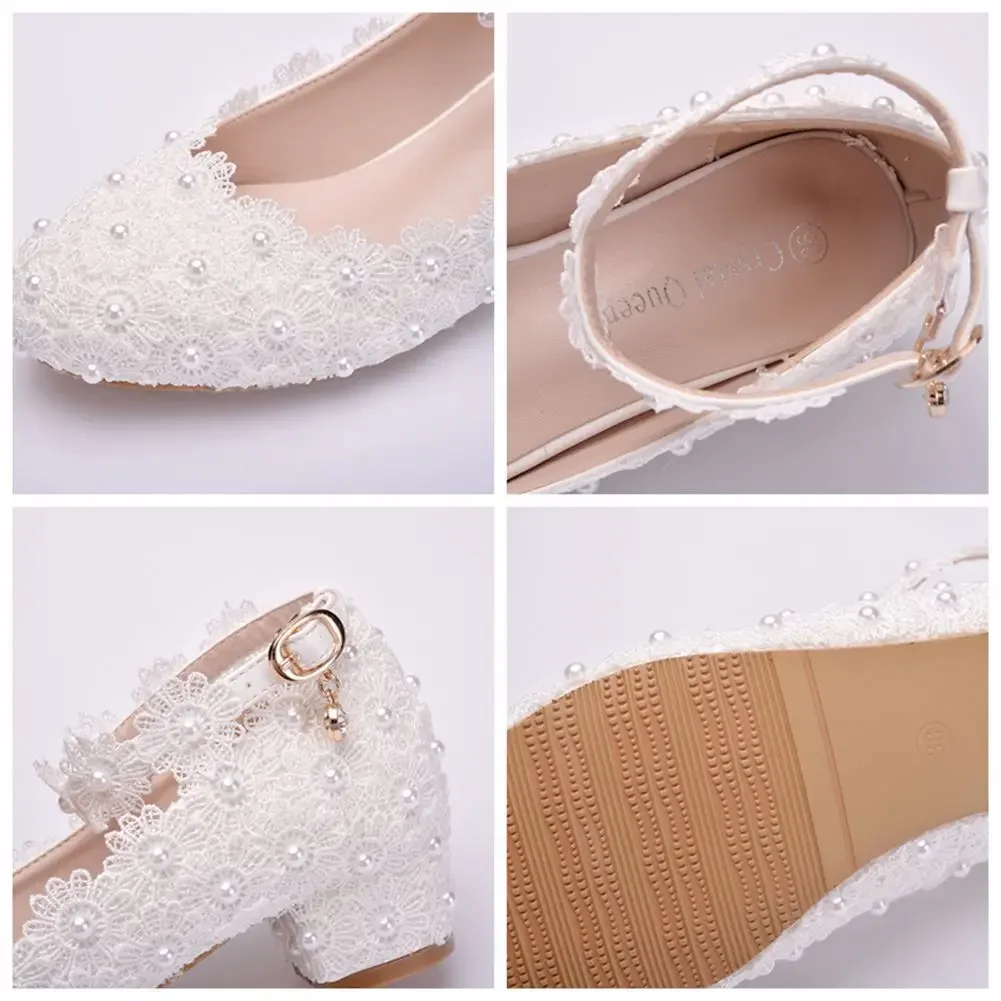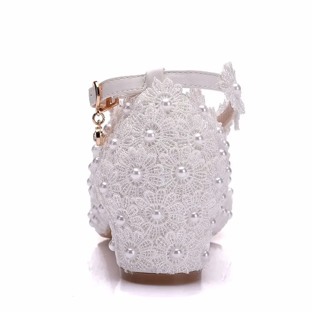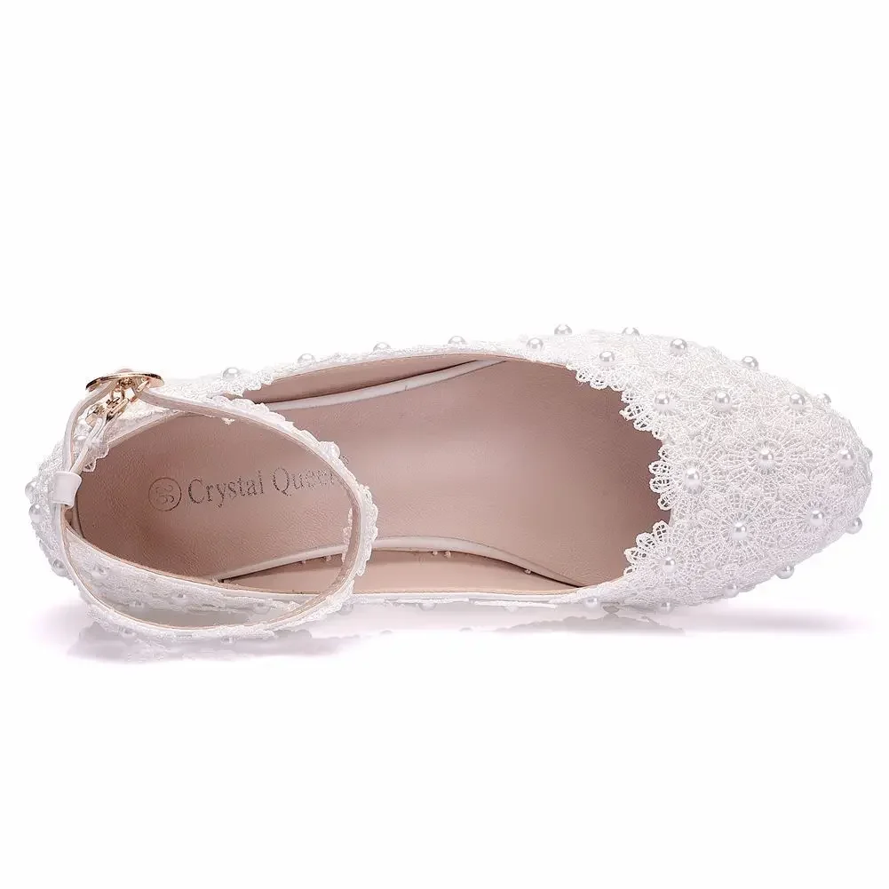 Crystal Queen White Wedges Wedding Pumps Sweet White Flower Lace Pearl Platform Pump Shoes Classic Bride Dress High Heeled Lady