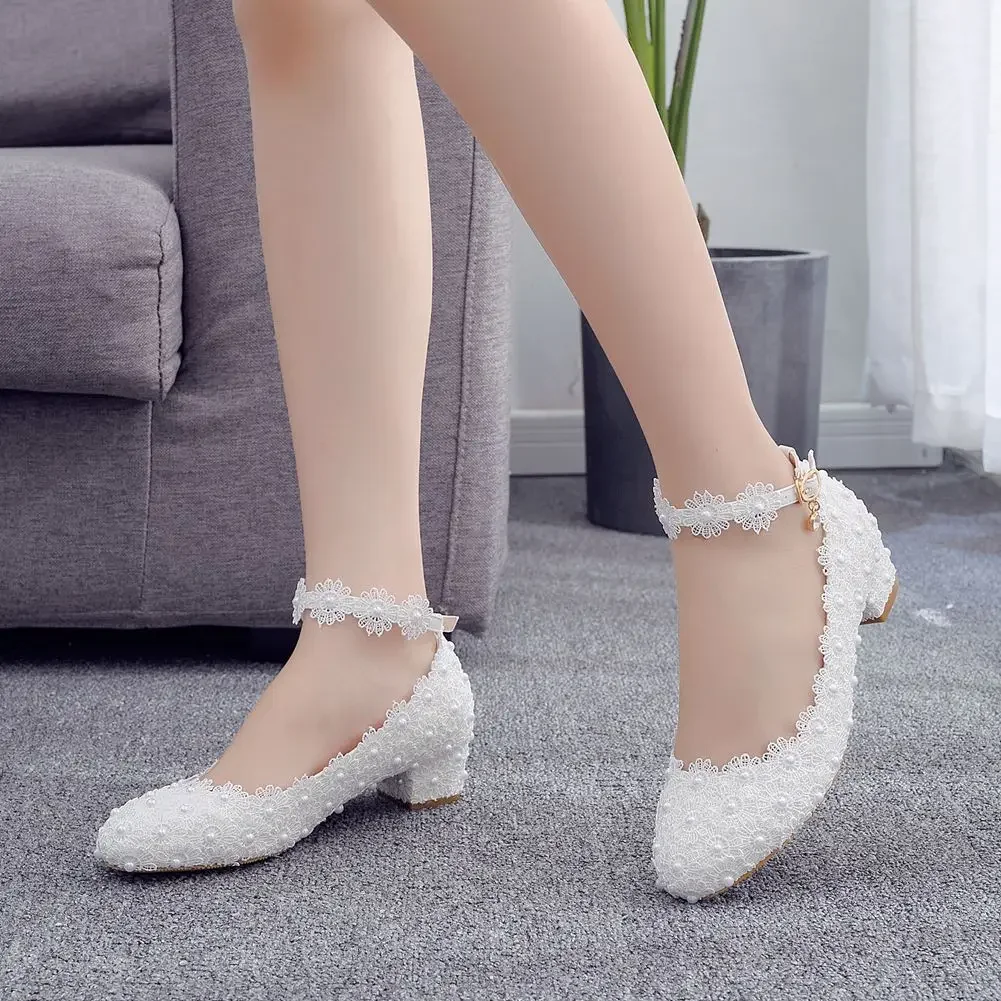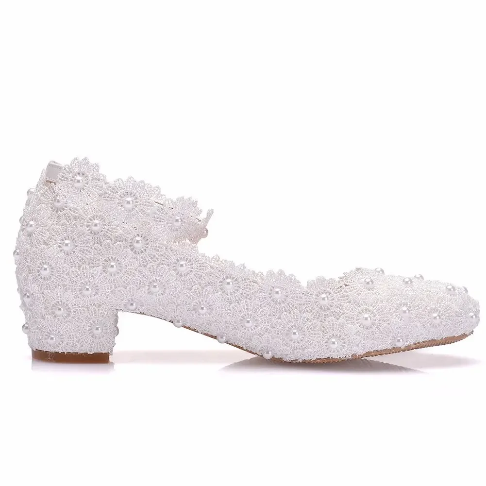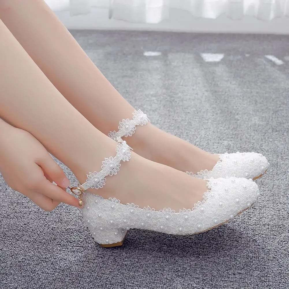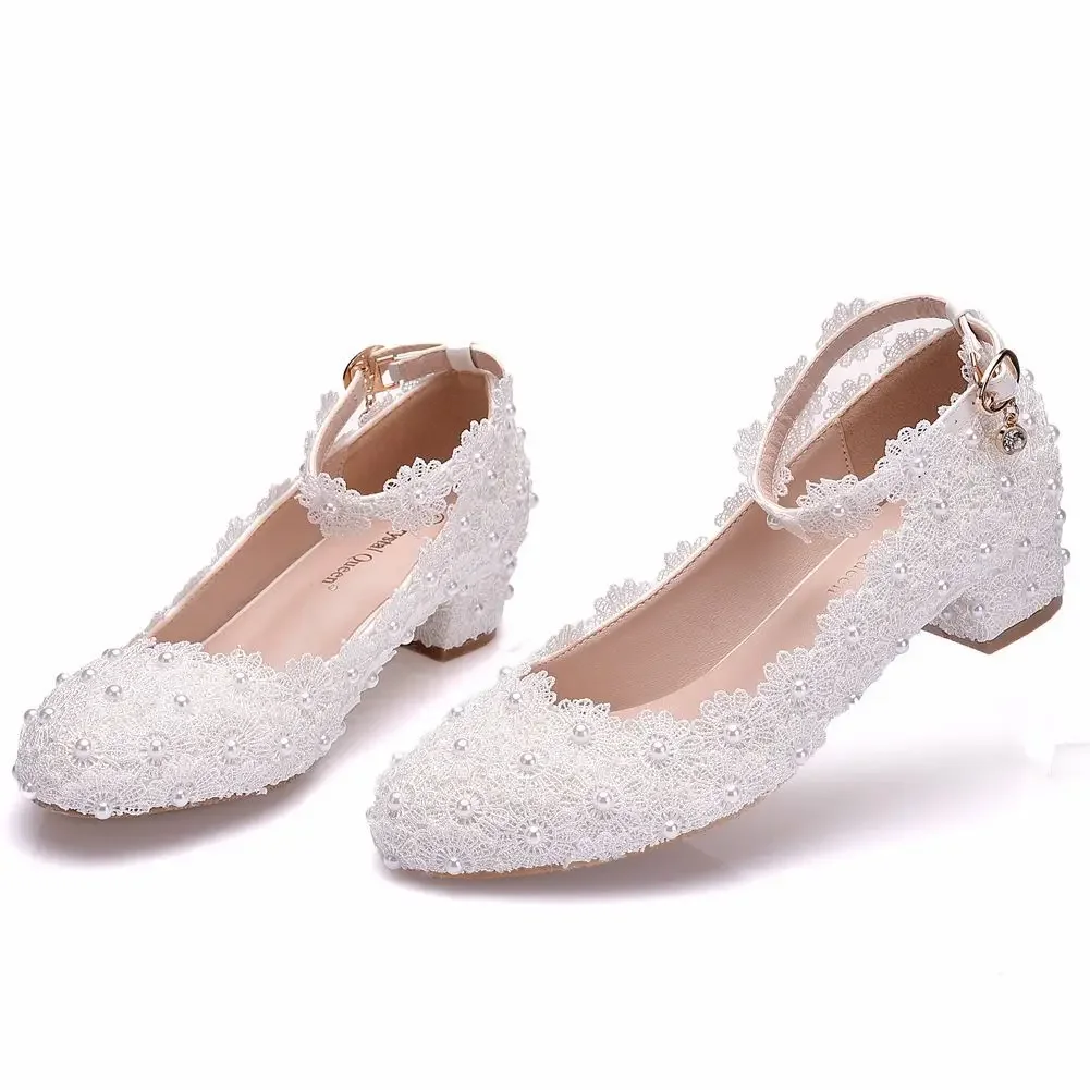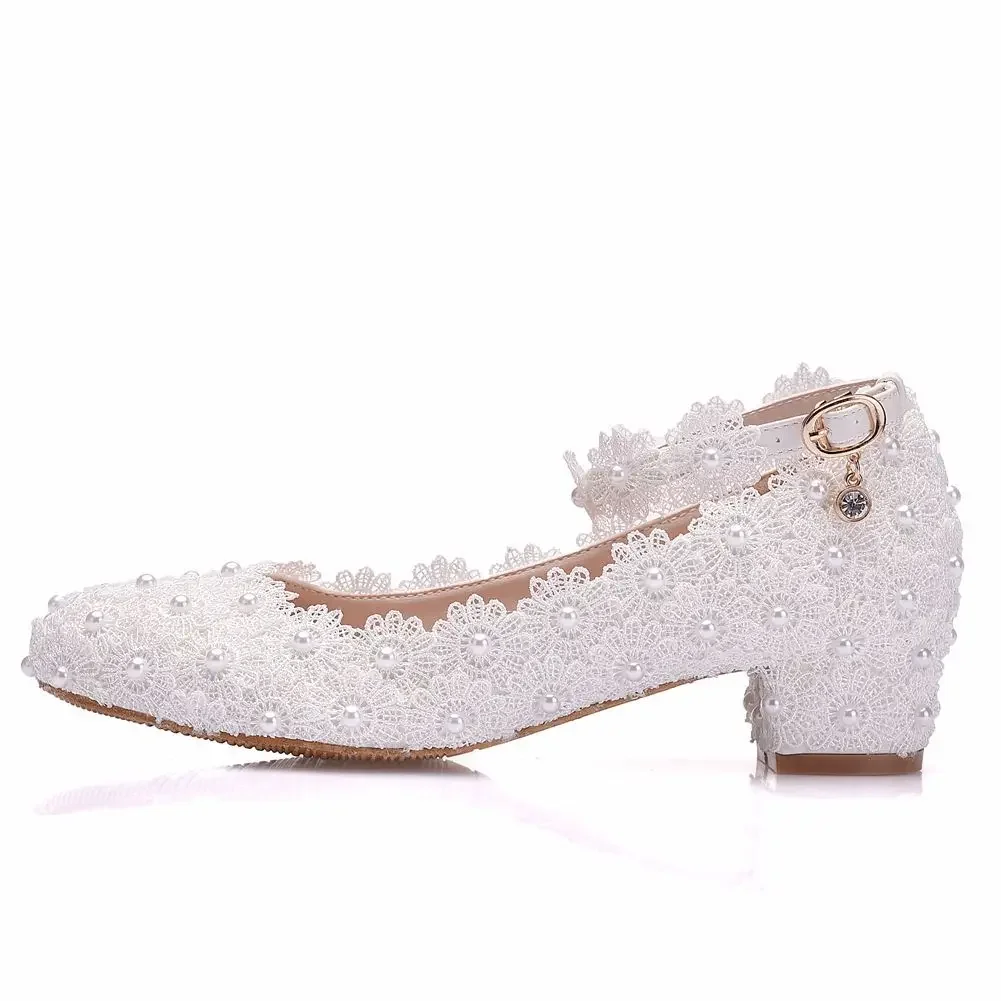 Crystal Queen White Wedges Wedding Pumps Sweet White Flower Lace Pearl Platform Pump Shoes Classic Bride Dress High Heeled Lady