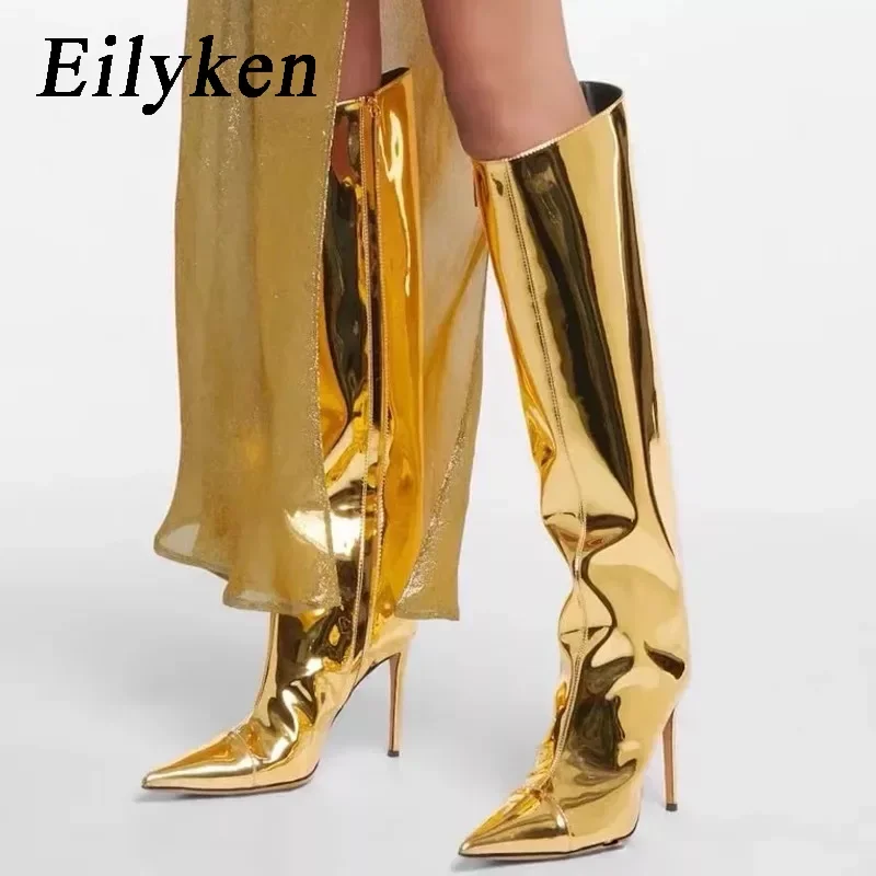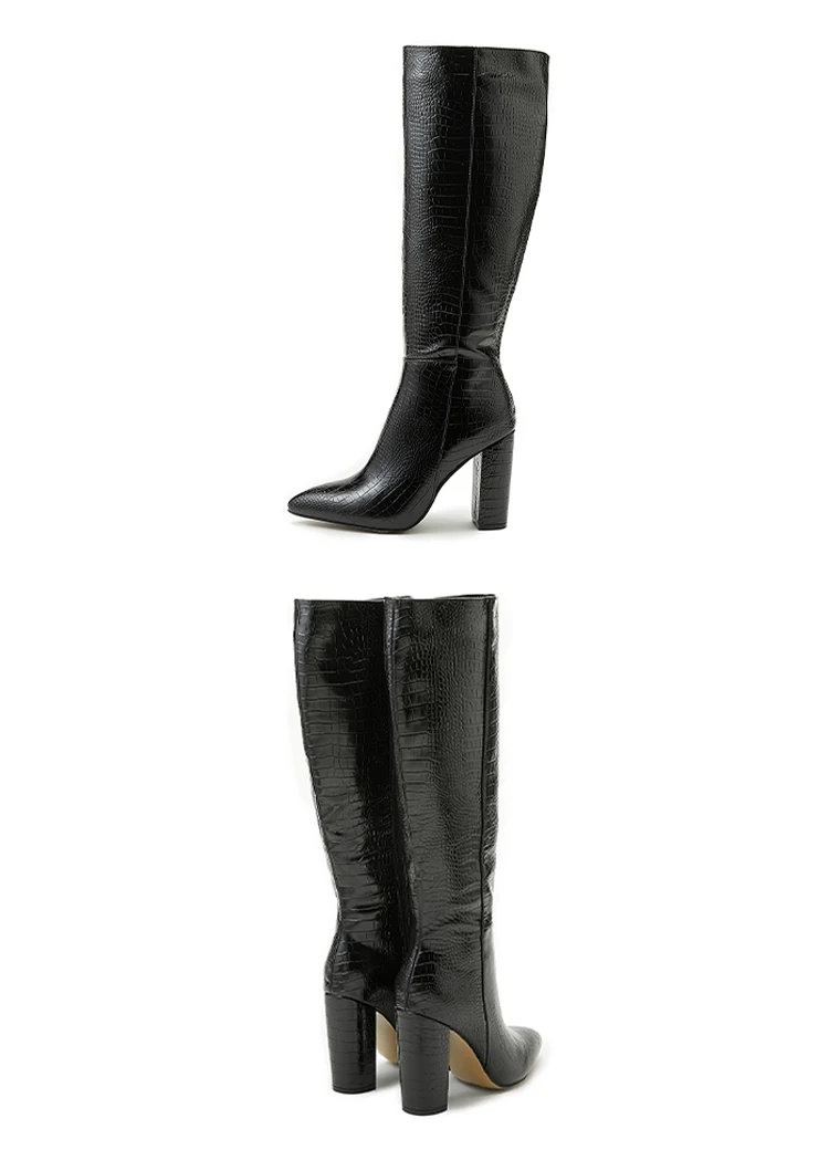 Eilyken Black Serpentine Fashion Women Knee High Boots Sexy Pointed Toe Square Heels Ladies Long Boot Zipper Female Shoes