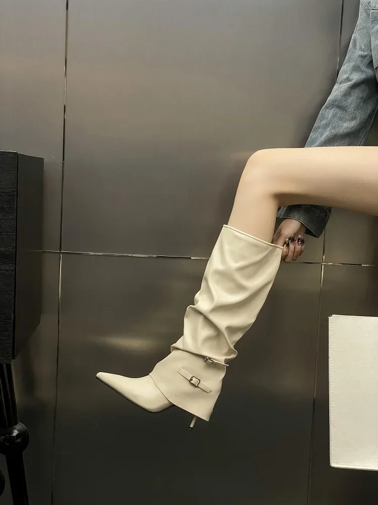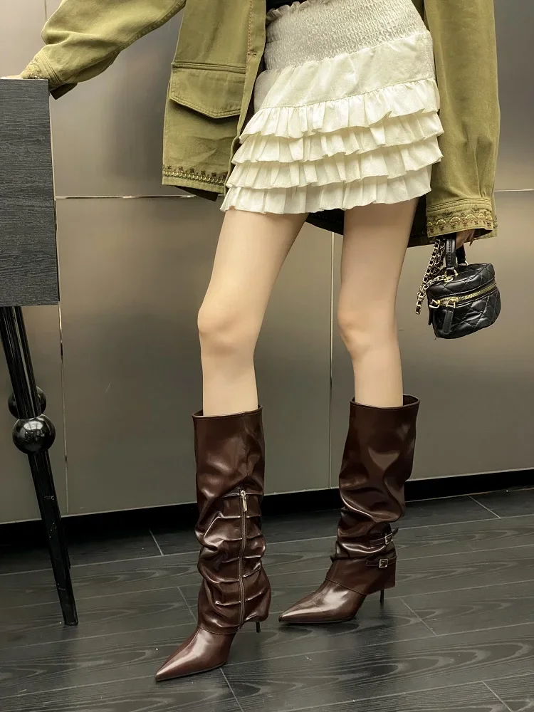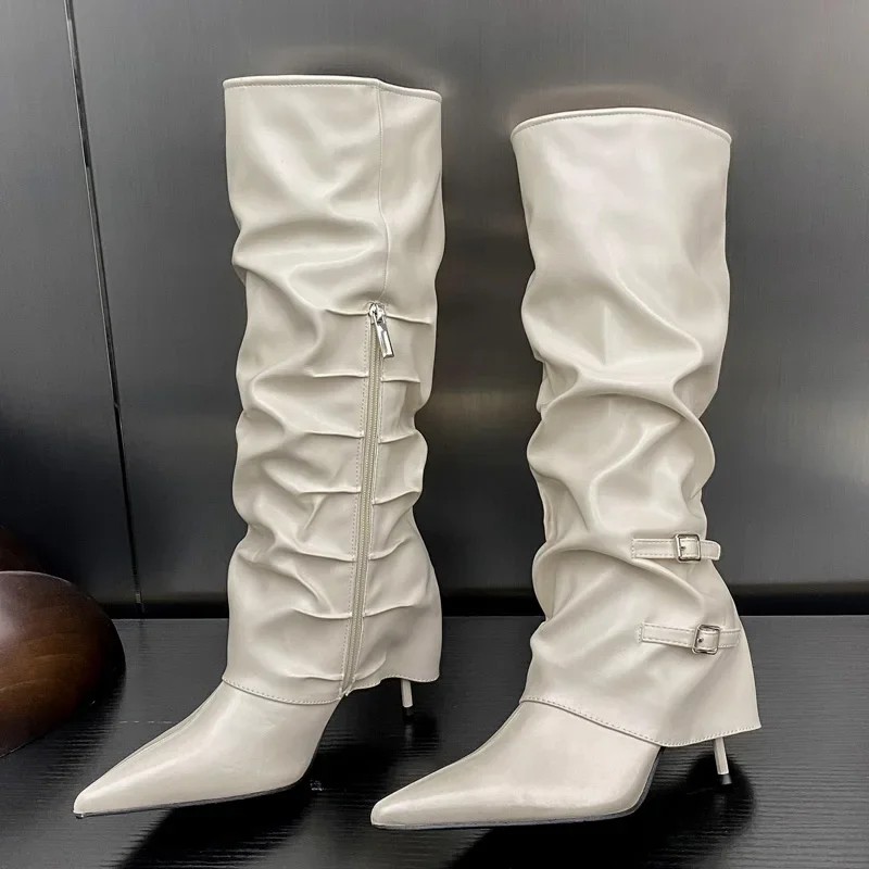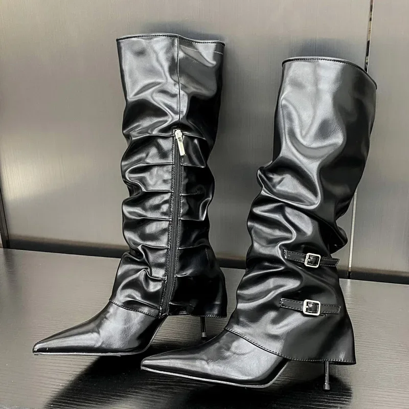 Eilyken Design Style Pleated Buckle Women Ankle Boots Autumn Winter Pointed Toe Thin High Heels Zipper Female Shoes