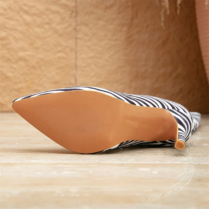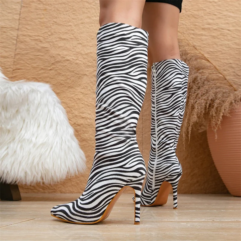 Eilyken Designer Zebra Stripes Pointed Toe Slim Women Knee-High Boots Street Style Zipper Thin High Heels Stripper Party Shoes