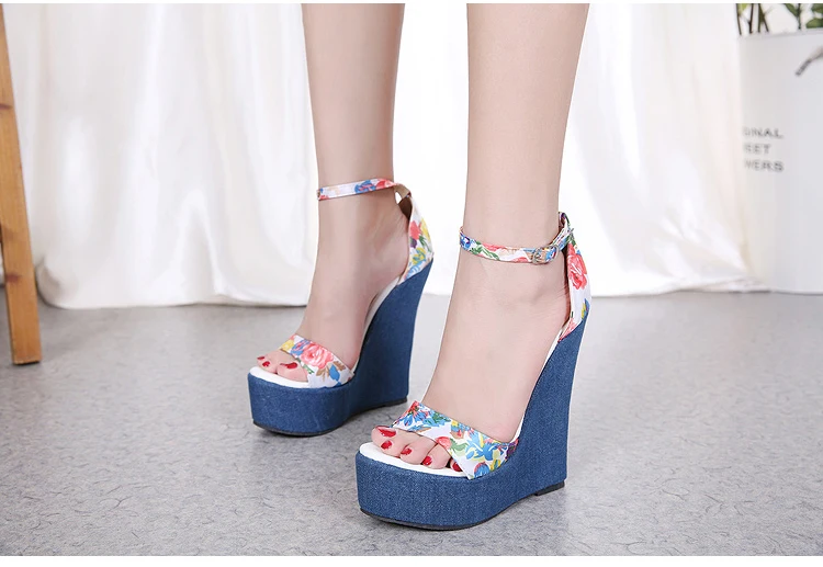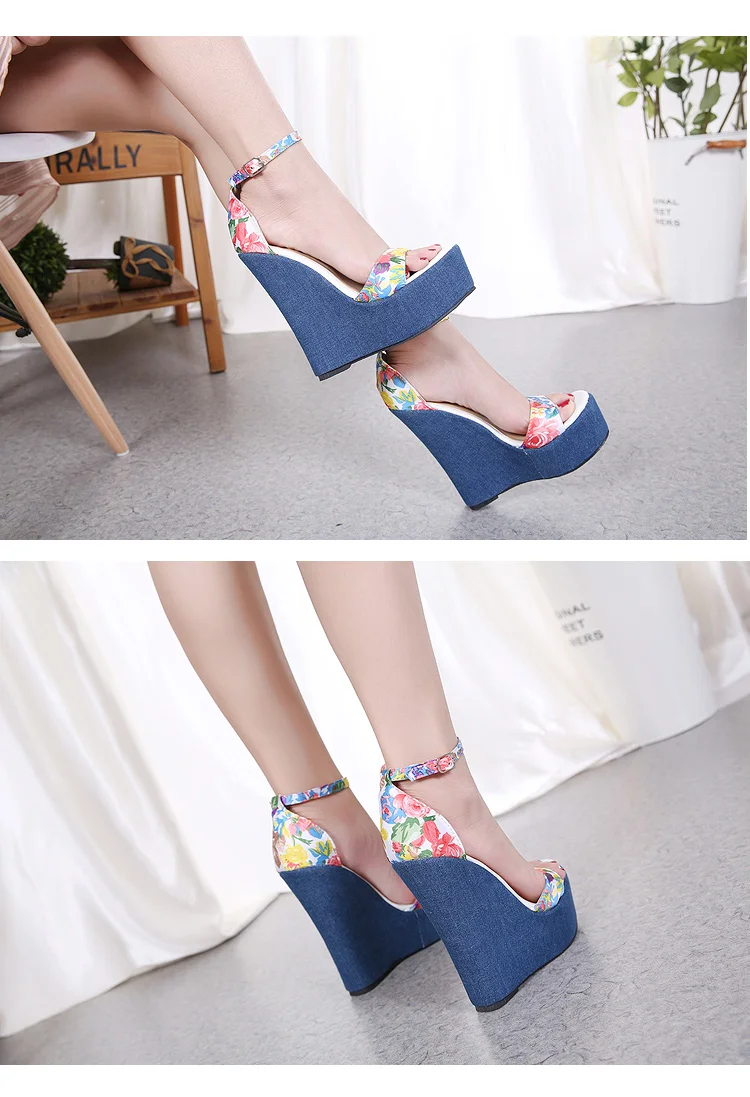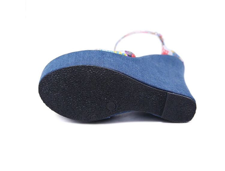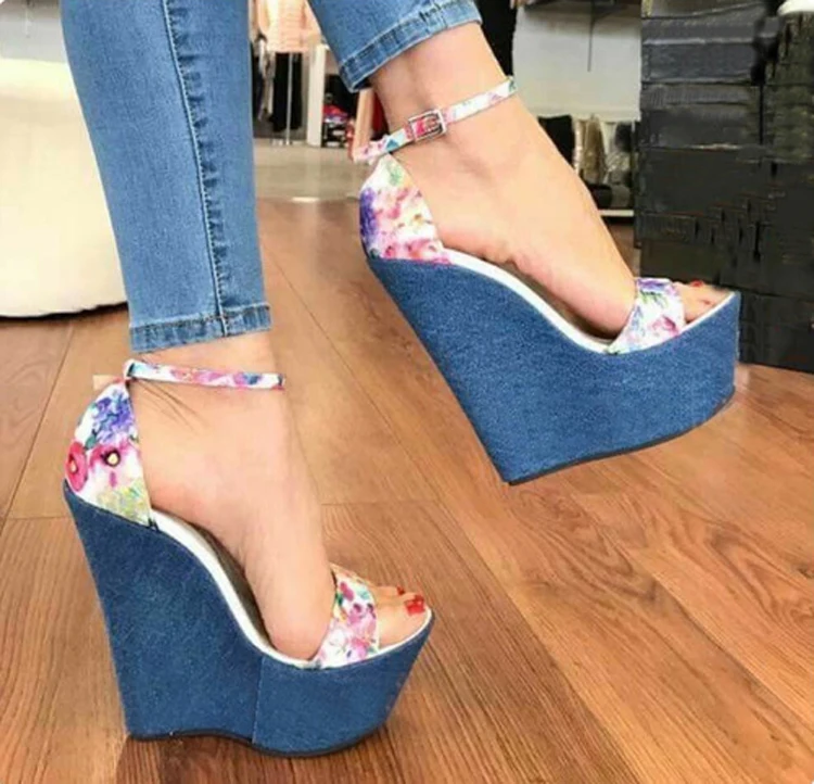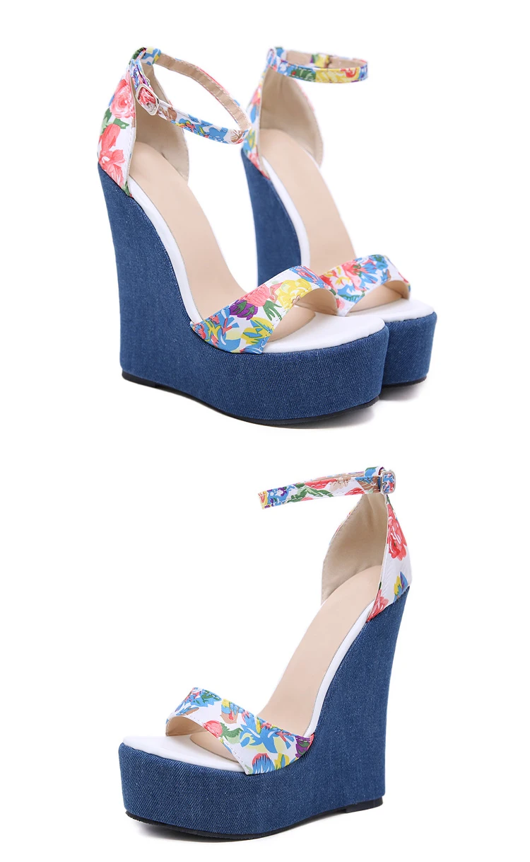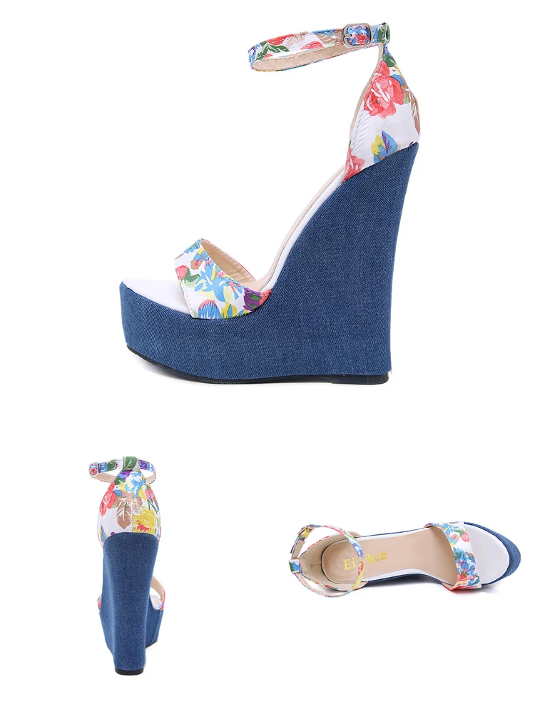Eilyken Fashion Designer Print Denim Sandals Woman Roman Wedges High Heels Peep Toe Platform Shoes Zapatos De Mujer