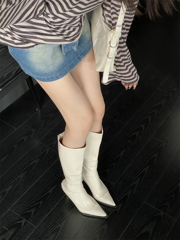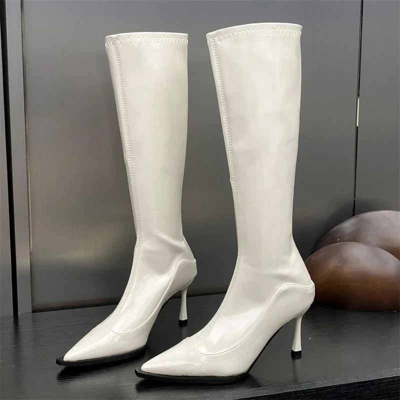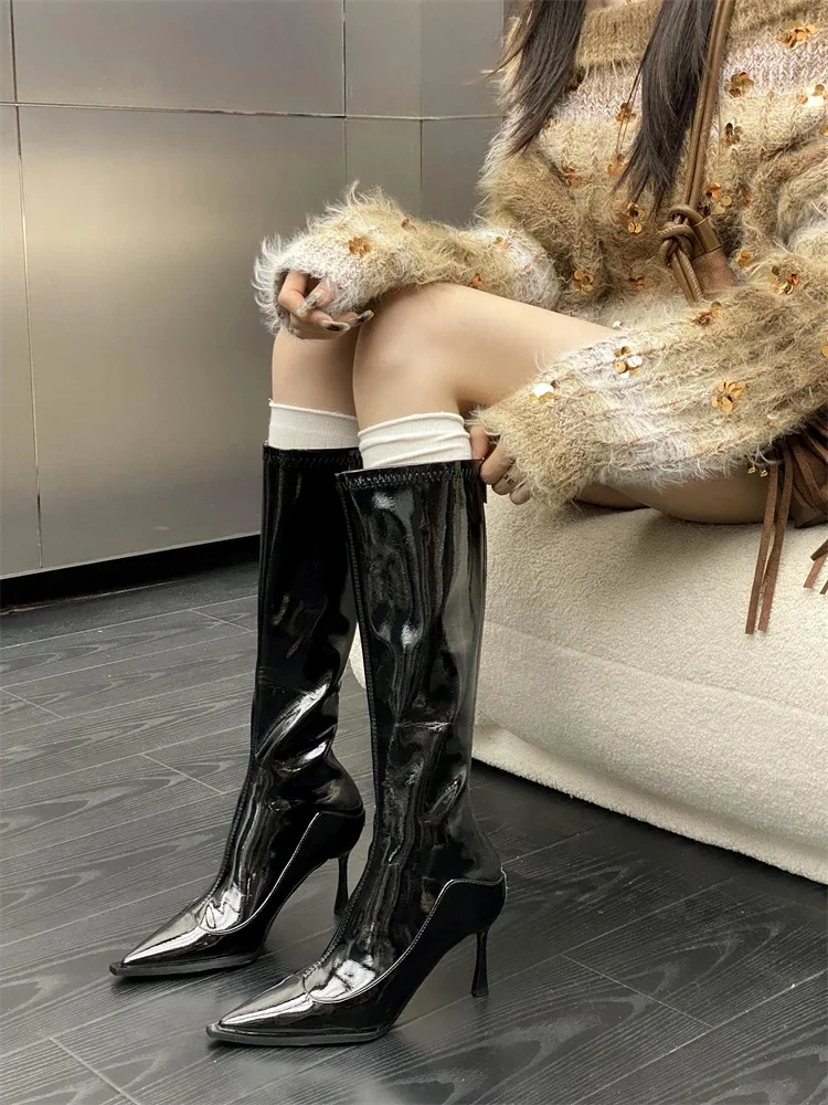 Eilyken Fashion Patent Leather Knee-High Women Boots Pointed Toe Heels Stripper Thin High Shoes Sexy Long Ladies Booties