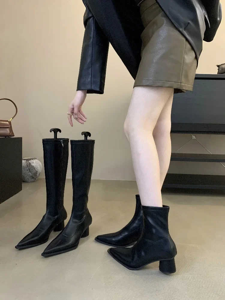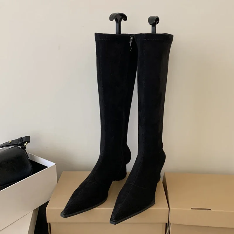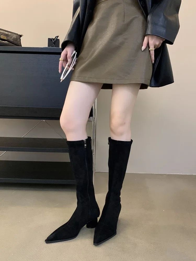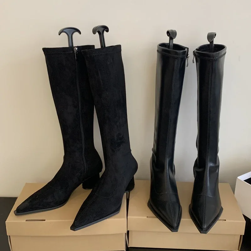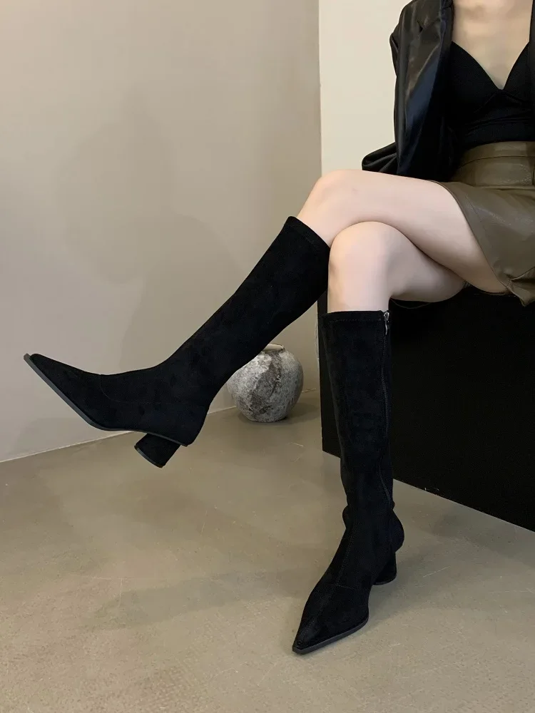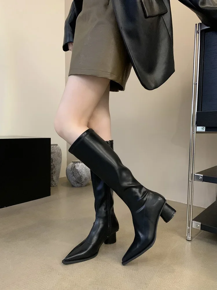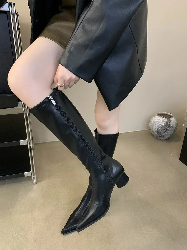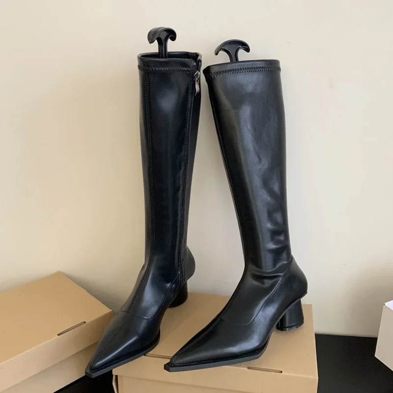 Eilyken Fashion Soft Leather Women Over The Knee Boots Zipper Pointed Toe Long Booties Low Square Heels Winter Ladies Shoes