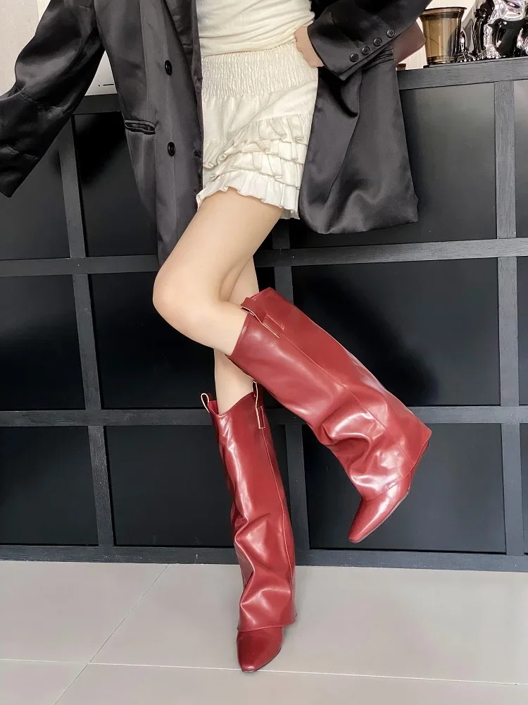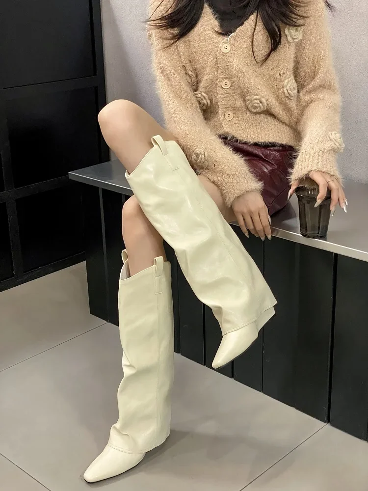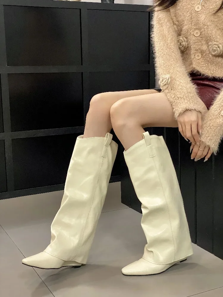 Eilyken Fashion Wedges High Heels Women Knee-High Boots Boots Design Style Pleated Pointed Toe Ladies Shoes Zapatos Mujer