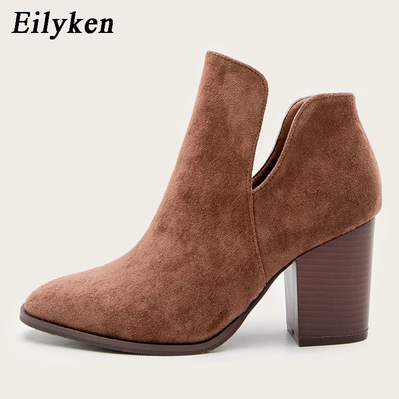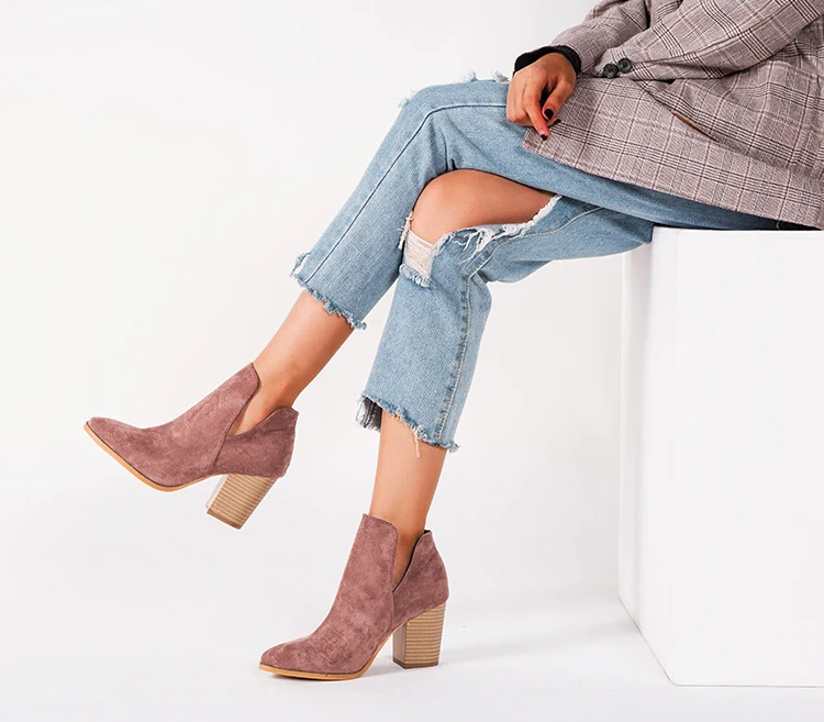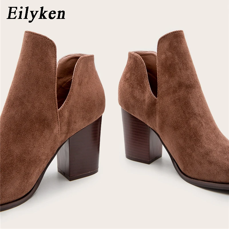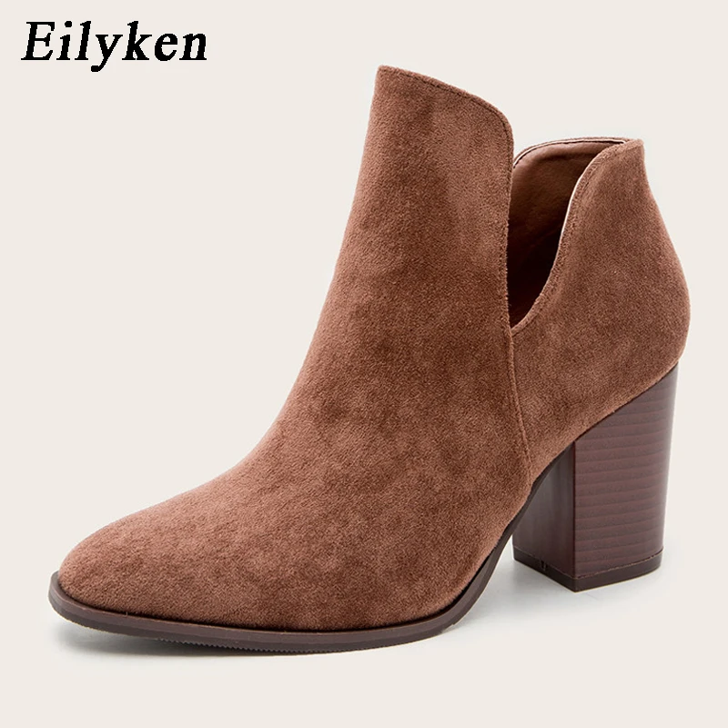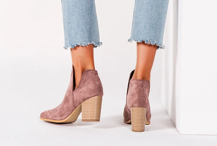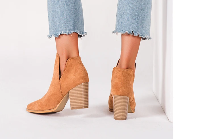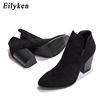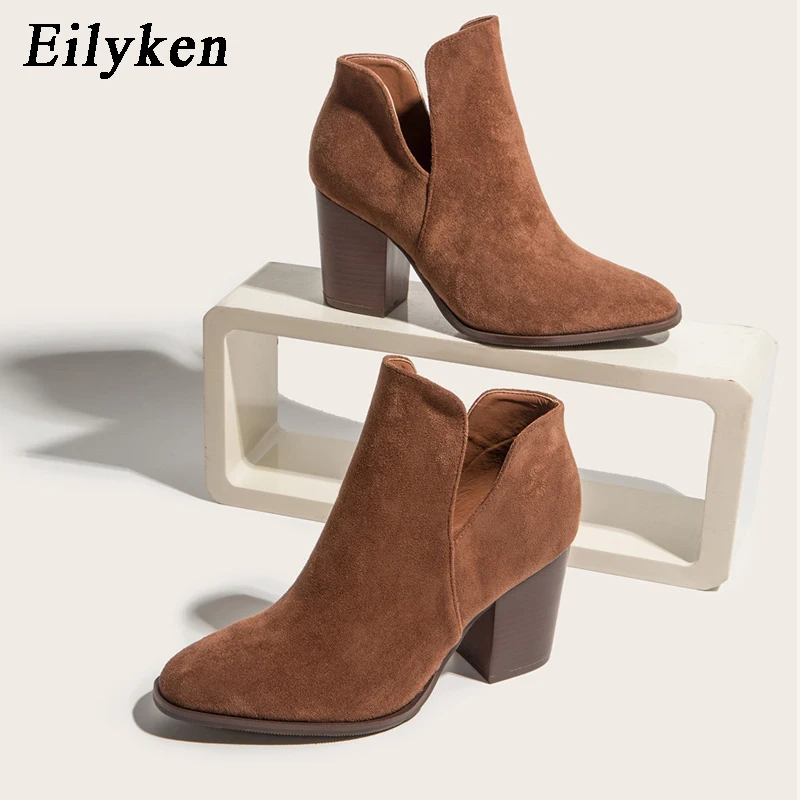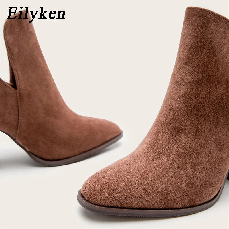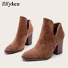 Eilyken Faux Suede Ankle Boots Women High Heel Side Stacked Block Heel Slip On Short Western Cowboy Booties Shoes