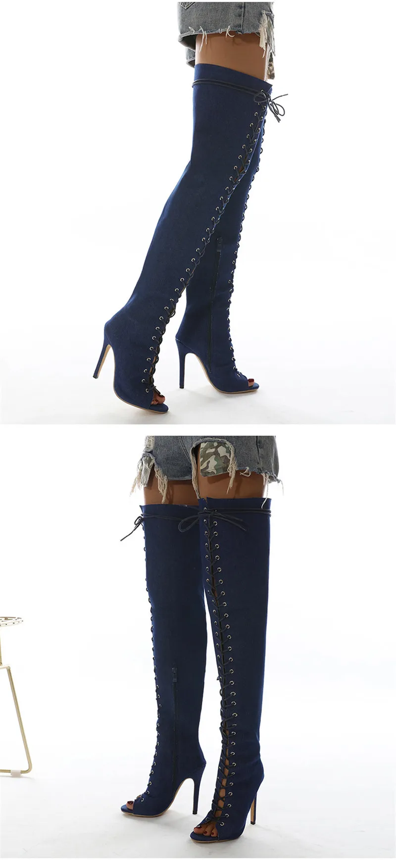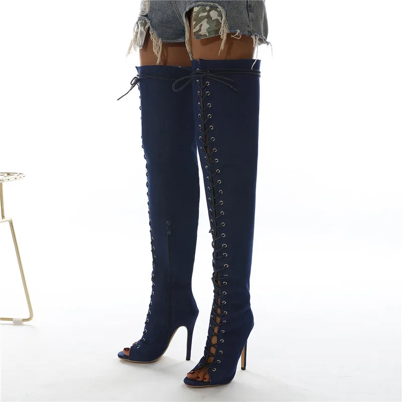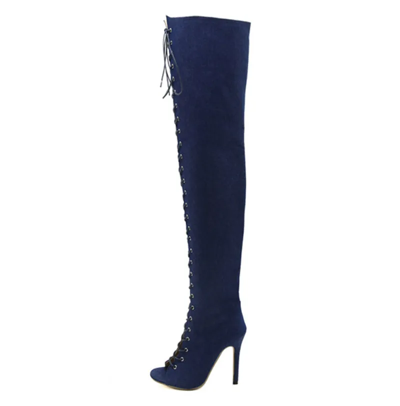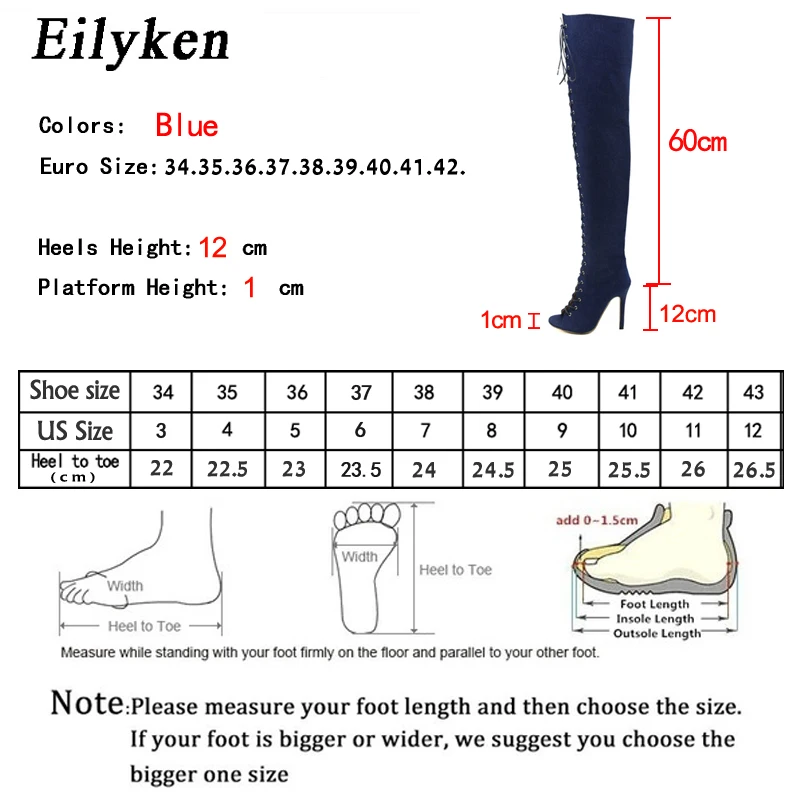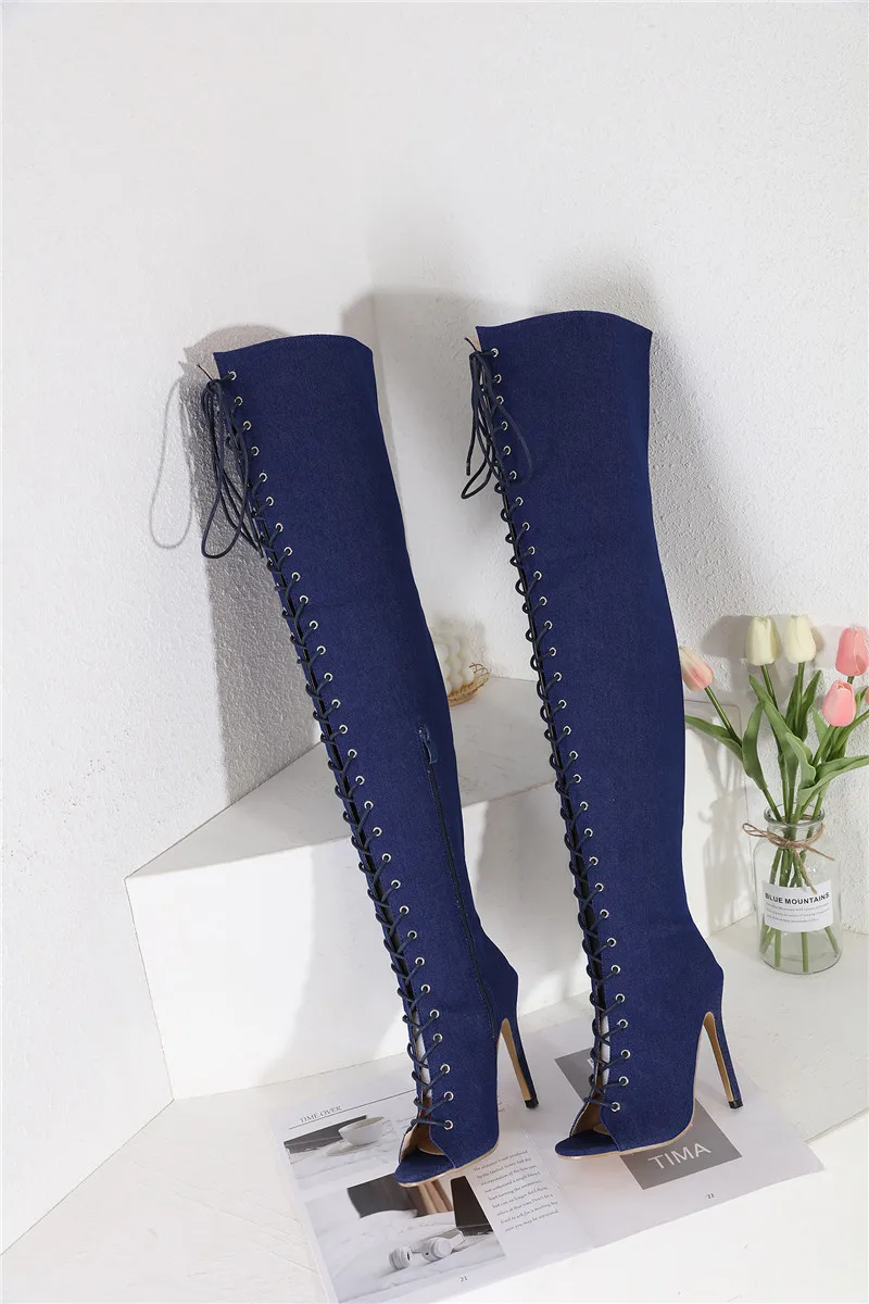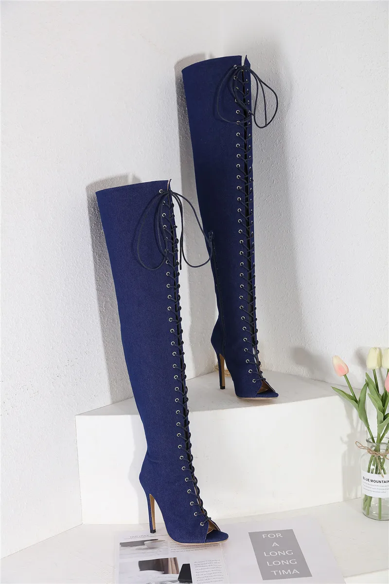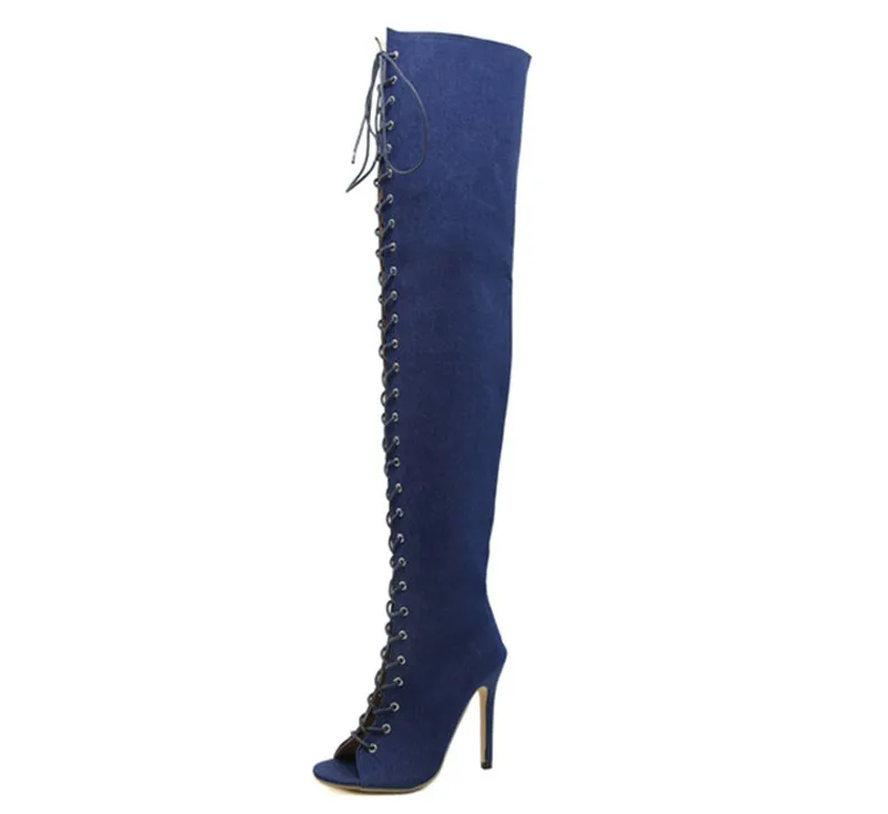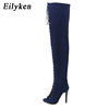 Eilyken New Design Blue Open Toe Head Over The Knee Boot Cross Strap Motorcycle High-heeled Boots Autumn Winter Size 35-42