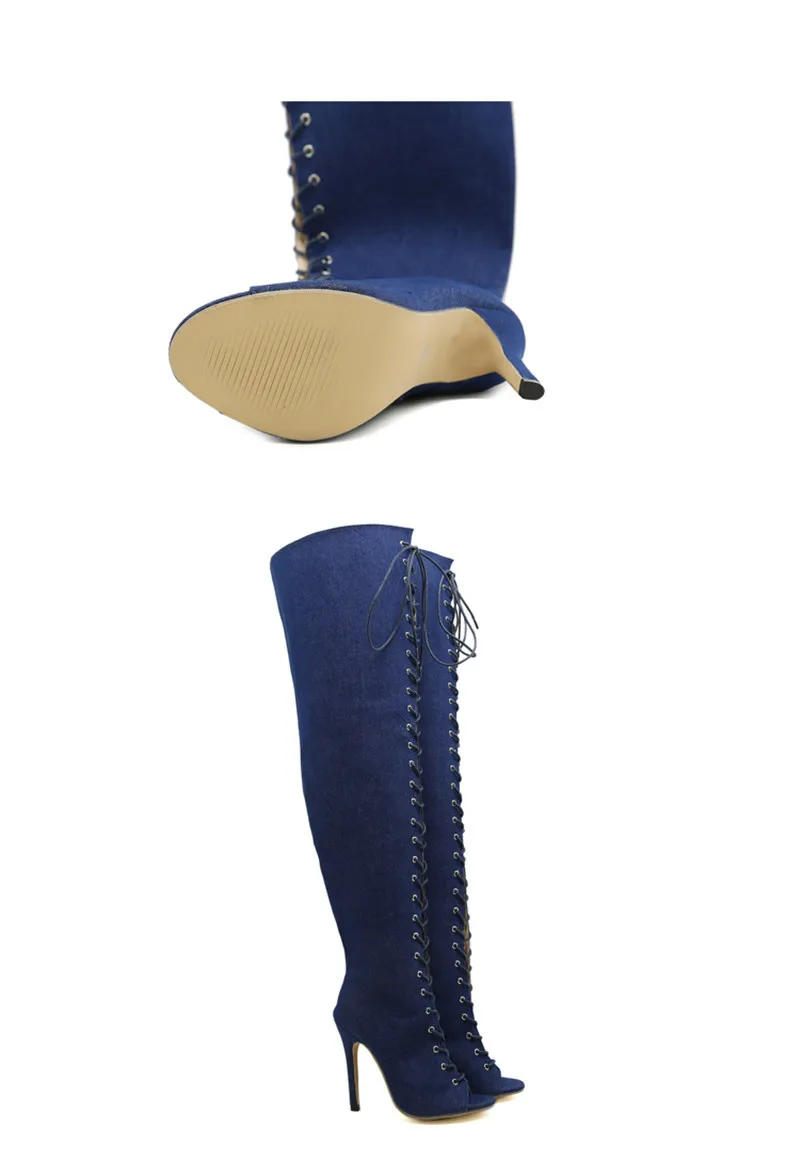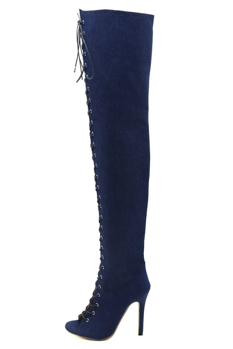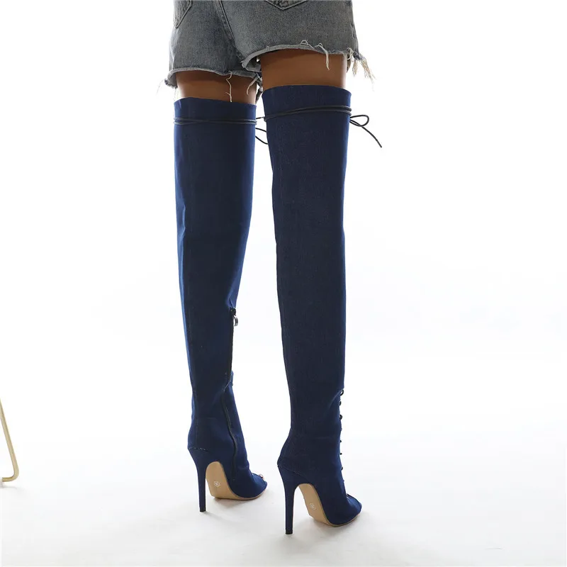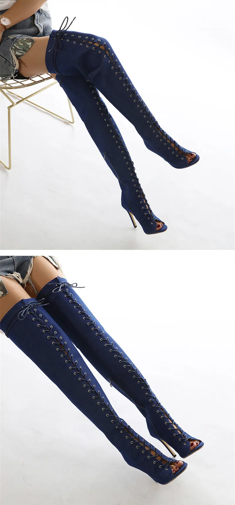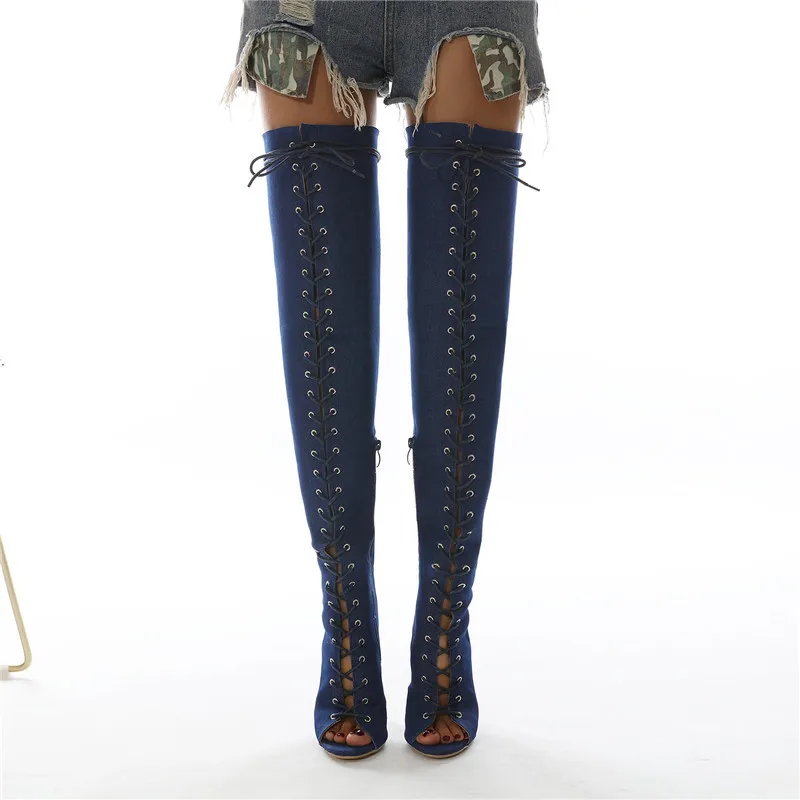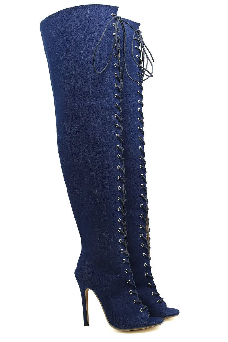 Eilyken New Design Blue Open Toe Head Over The Knee Boot Cross Strap Motorcycle High-heeled Boots Autumn Winter Size 35-42