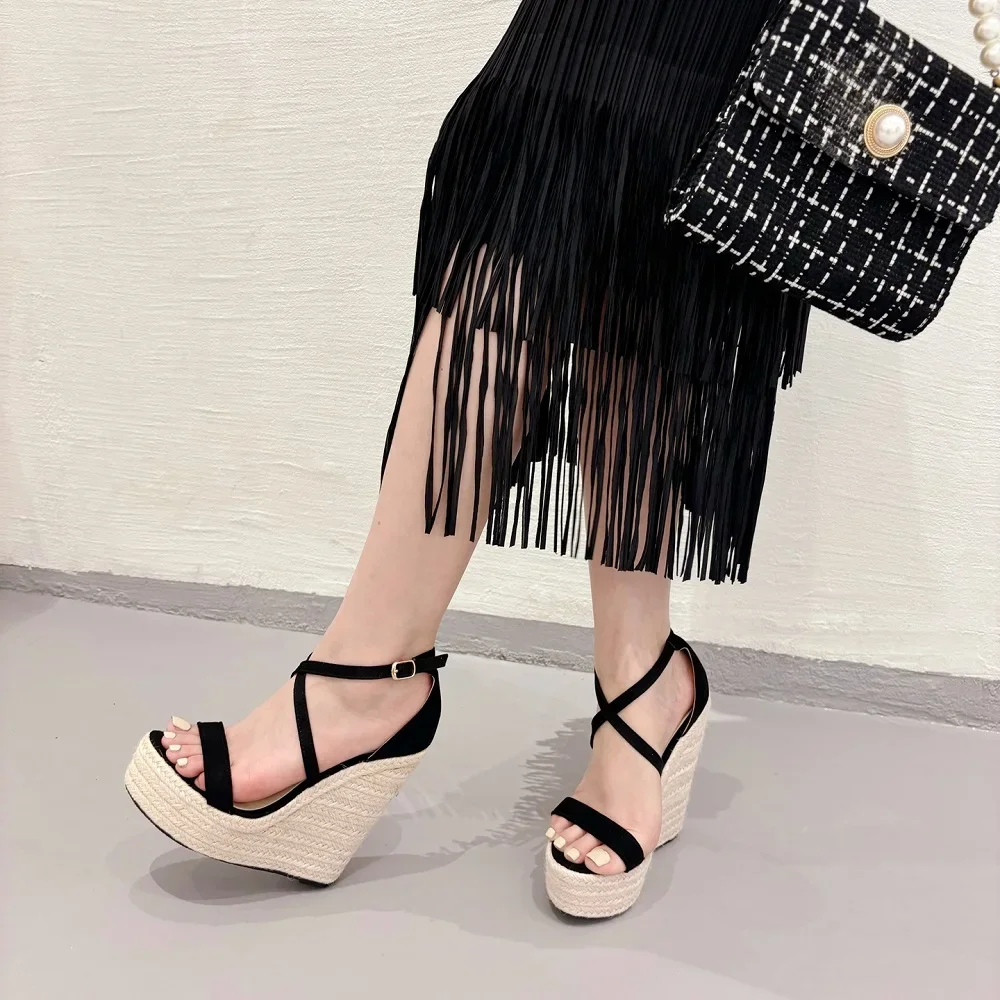 Eilyken New Fashion Open Toe Cane Straw Weave Solid Platform Wedges Woman Sandals Concise Buckle Strap High Heels Shoes