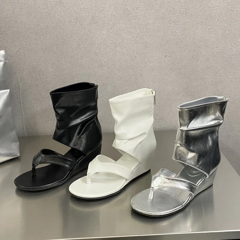 Eilyken New Style Hollow Out Clip Toe Wedges Heels Women Ankle Boots Sandals Designer Pleated Zipper Flip Flop Shoes
