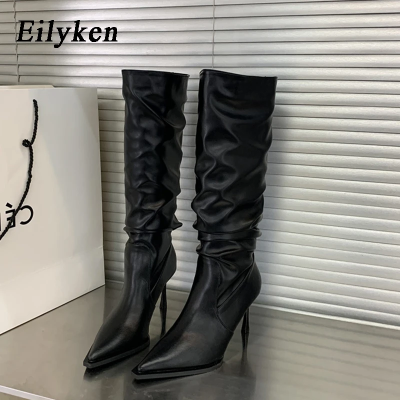 Eilyken Pleated Serpentine Knee-High Women Boot Fashion Pointed Toe Pole Dancing Shoes Sexy High Heels Botines Mujer