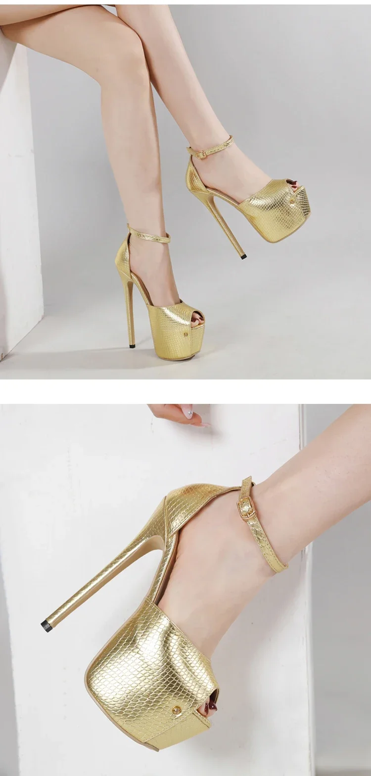 Eilyken Sexy Golden Extreme Thin High Heels Women Pumps Sandals Street Style Buckle Strap Peep Toe Banquet Prom Slide Shoes
