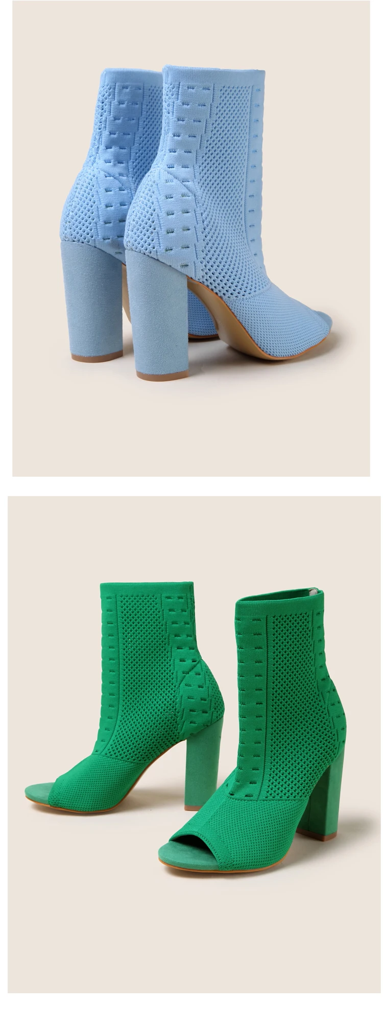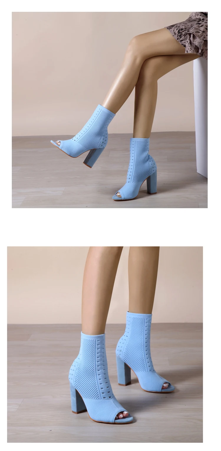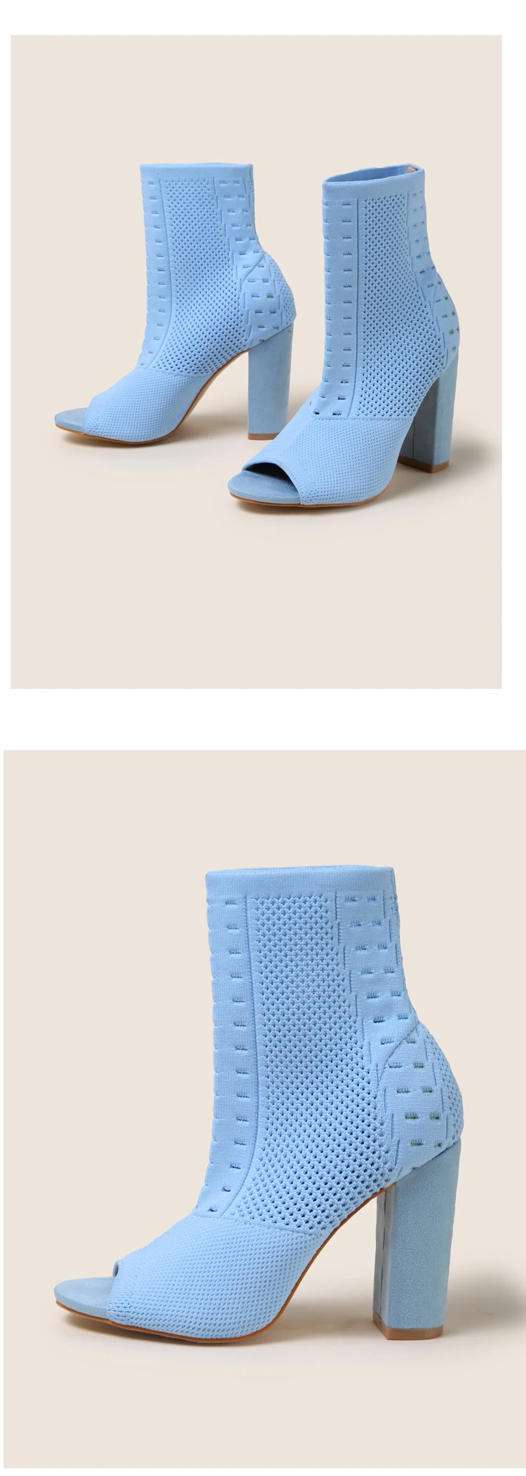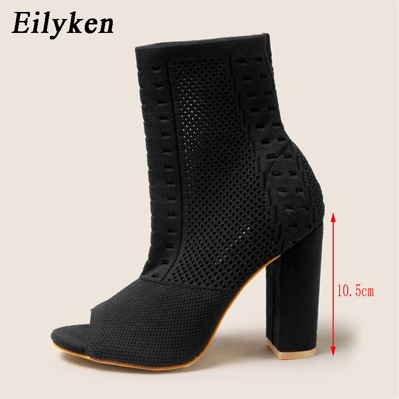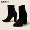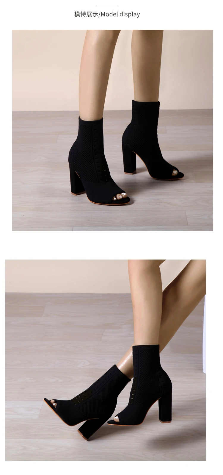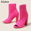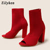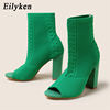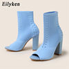 Eilyken Spring Autumn Fashion Peep Toe Knitted Stretch Fabric Socks Boots Women Square High Heels Dance Shoes Zapatos De Mujer
