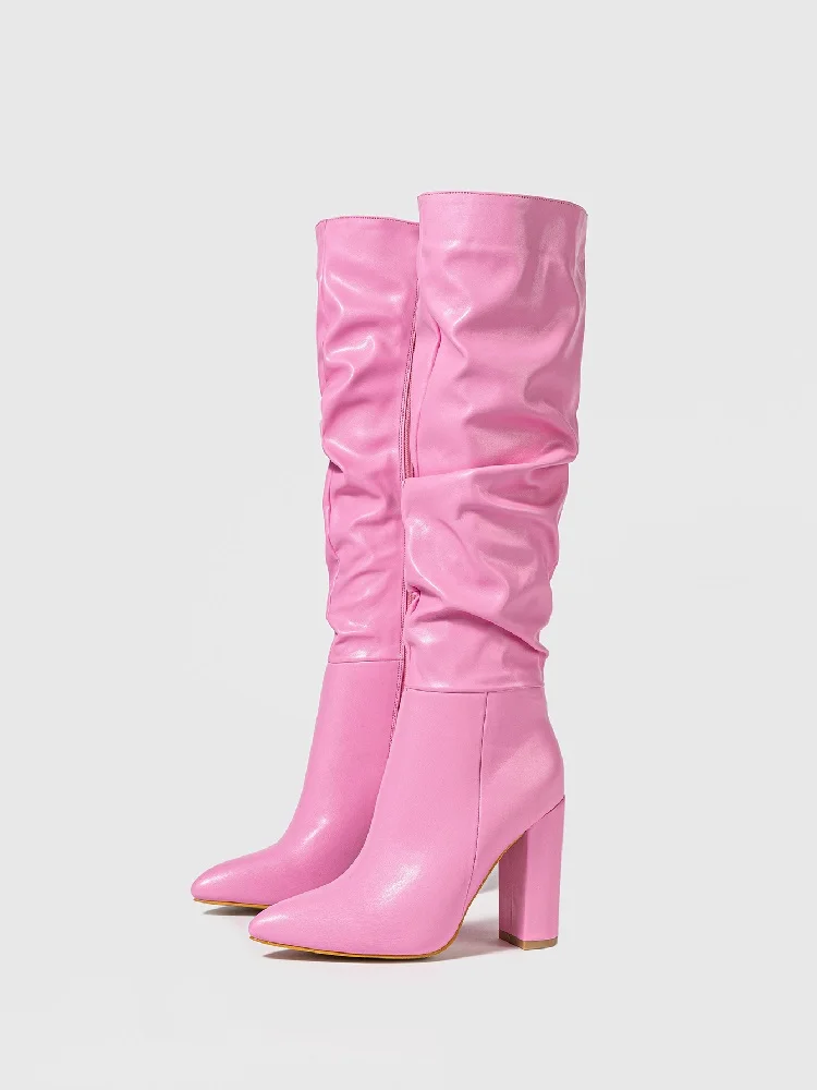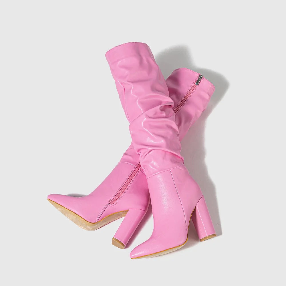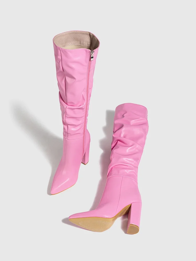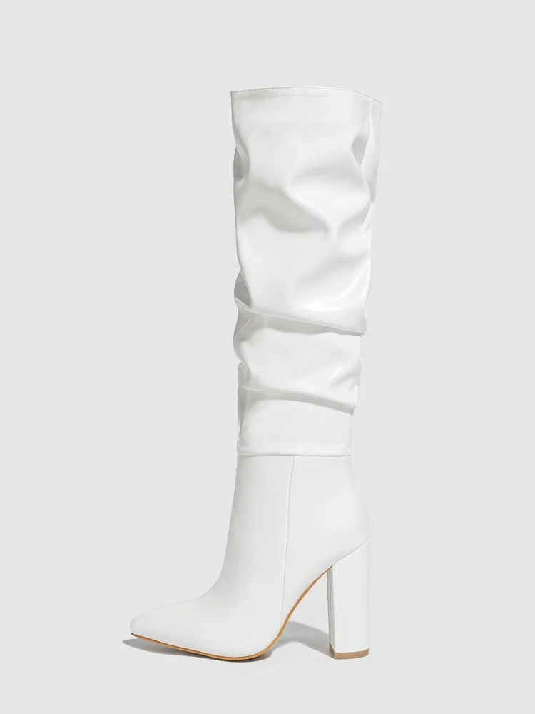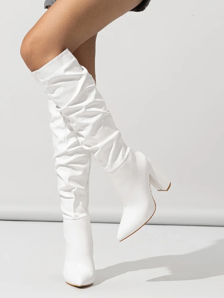 Eilyken Winter Design Pleated Knee-High Boots Women Pointed Square High Heels Booties Shoes Fashion Zipper Zapatos Mujer