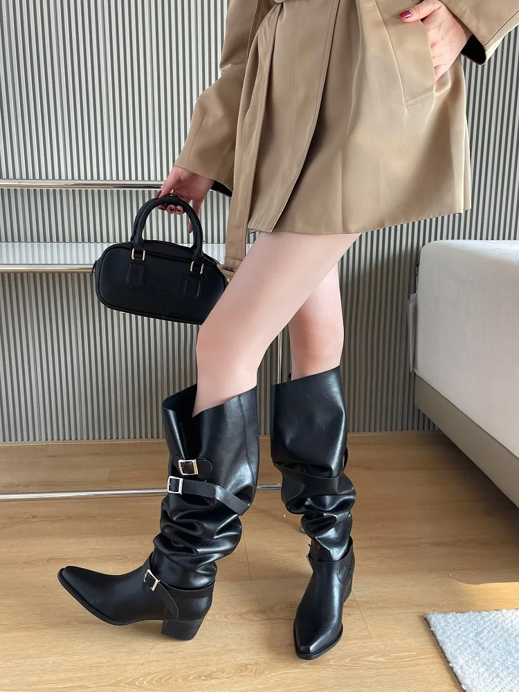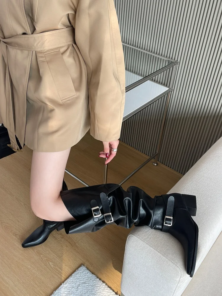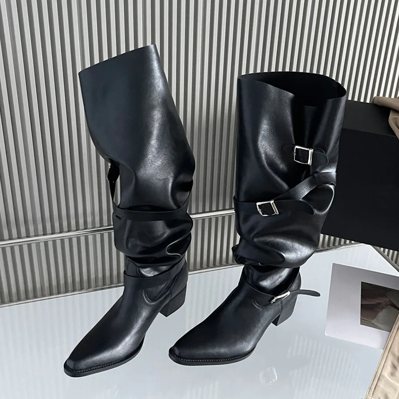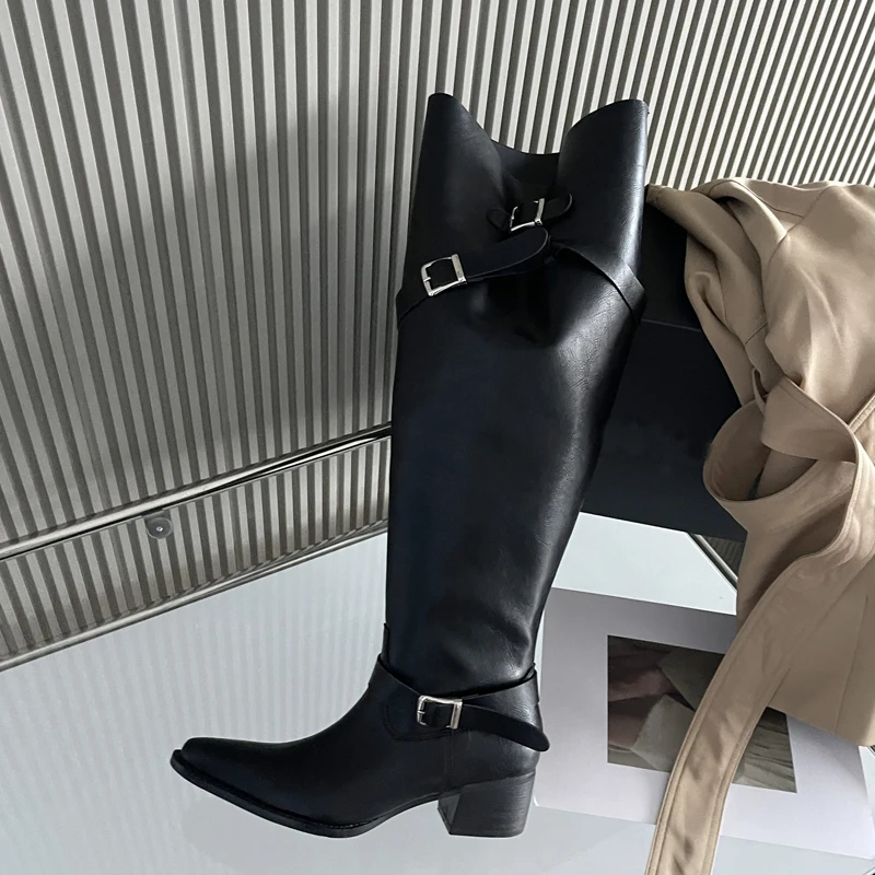 Eilyken Winter Punk Style Women Knee-High Boots Designer Square Heels Buckle Strap Shoes Ladies Booties Zapatillas De Mujer