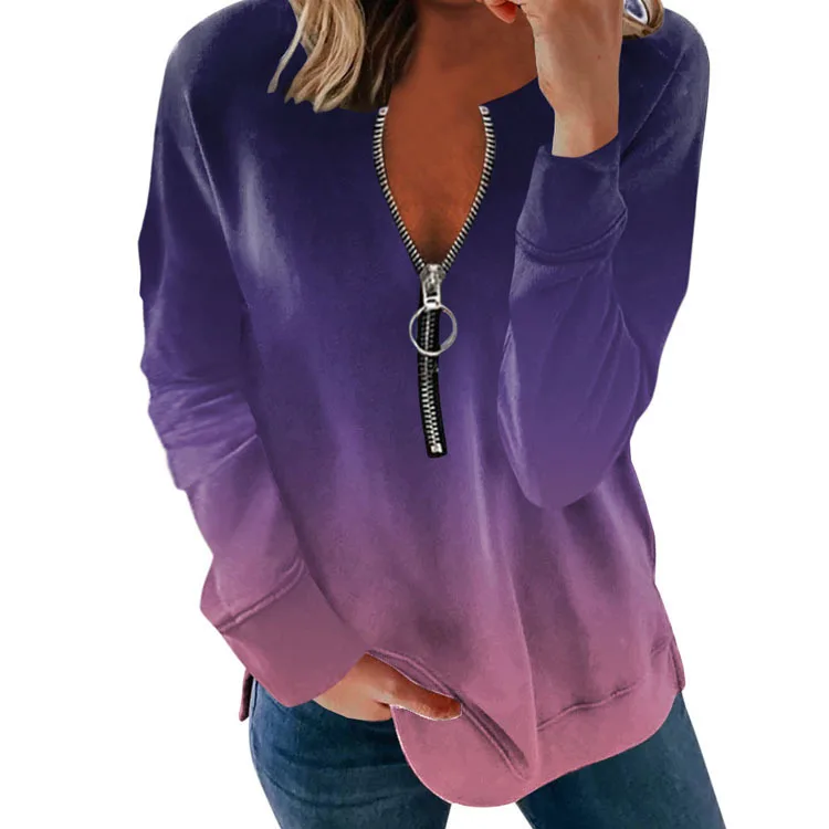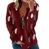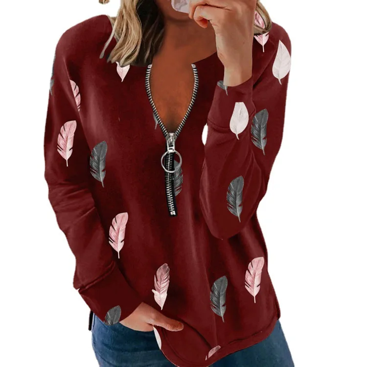 Elegant Blouse Woman Fashion Sexy Zipper V Neck Long Sleeve Feather Print Pullover Casual Shirt 2021 Autumn Loose Vintage Tops